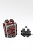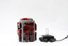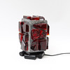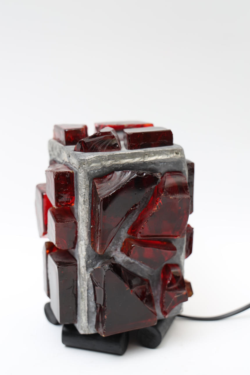 Metall med infattade röda glasdekorer. En ljuspunkt.