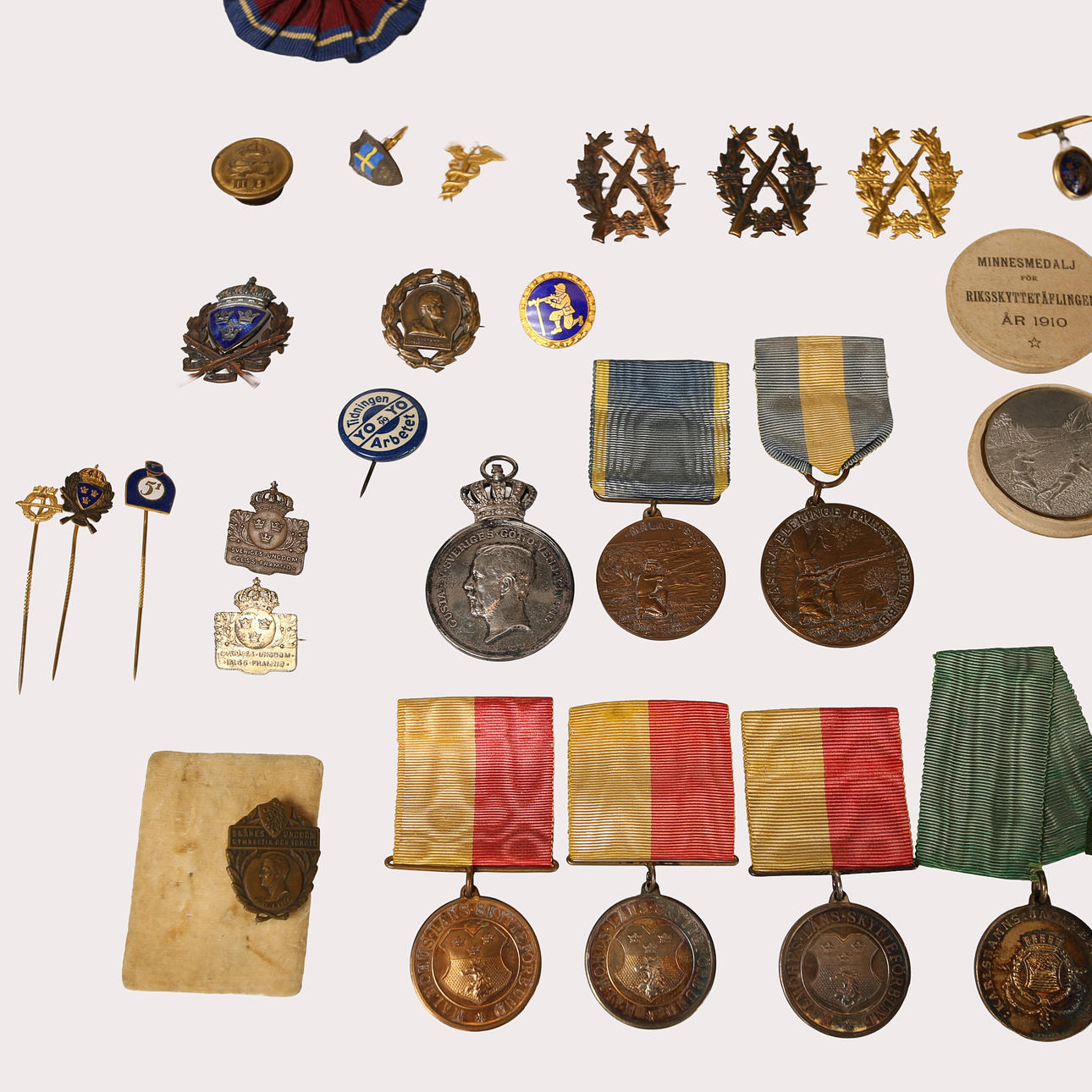 Olika skyttemedaljer, bordsmedaljer och nålmärke. Skyttemedaljer från Karlshamn, Malmö, Patriotiska sällskapet mm. Silvermedaljer förekommer delvis.