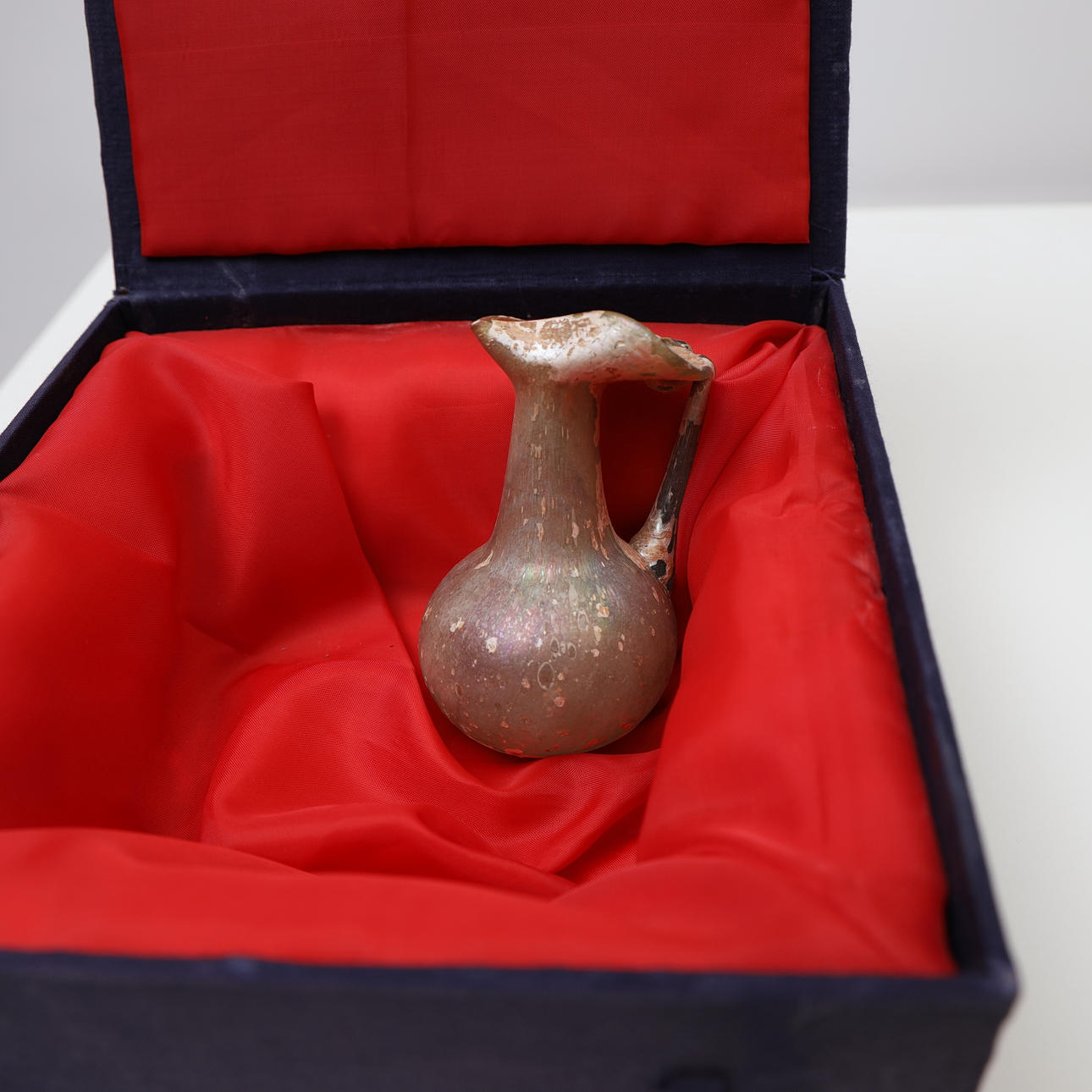Iriserande dekor. Svängd hänkel. Höjd 11cm.