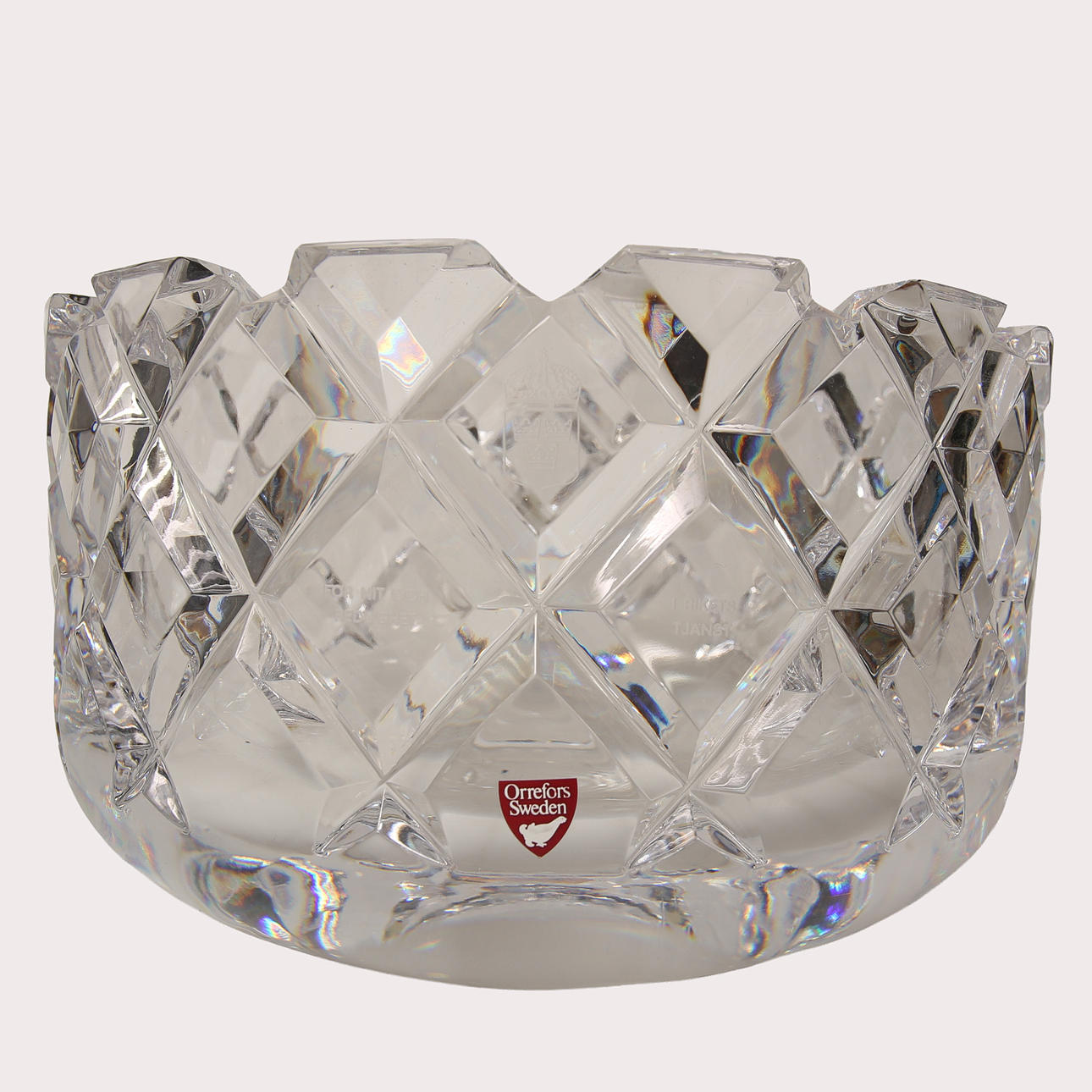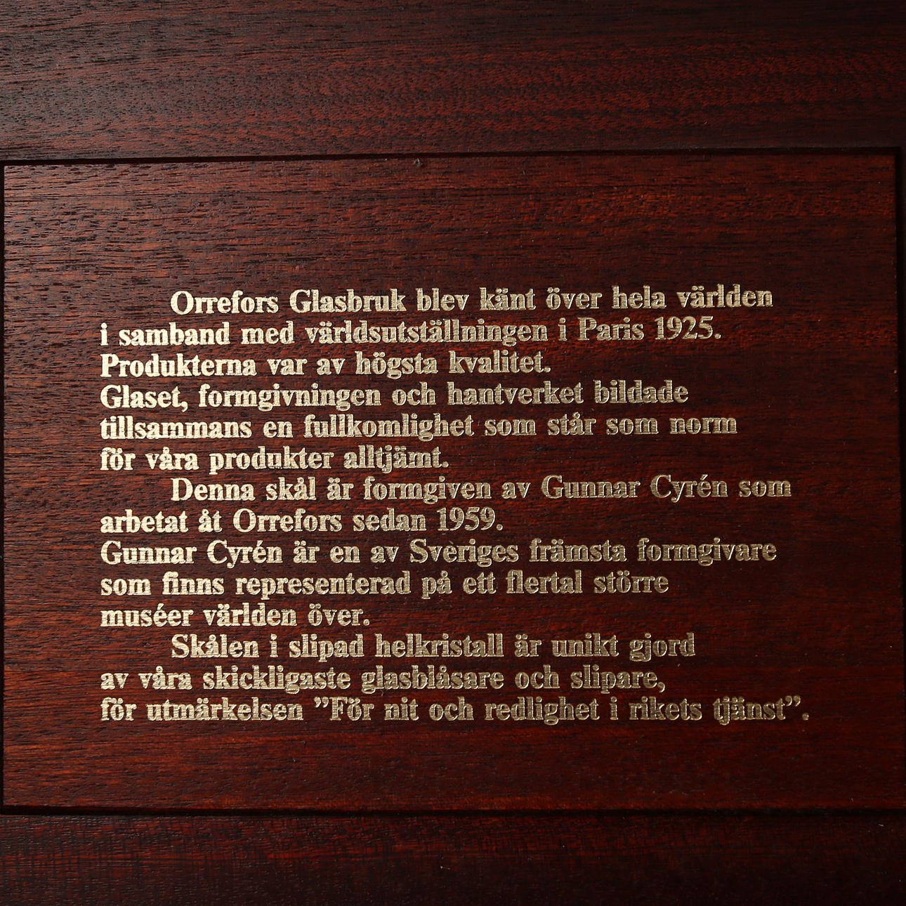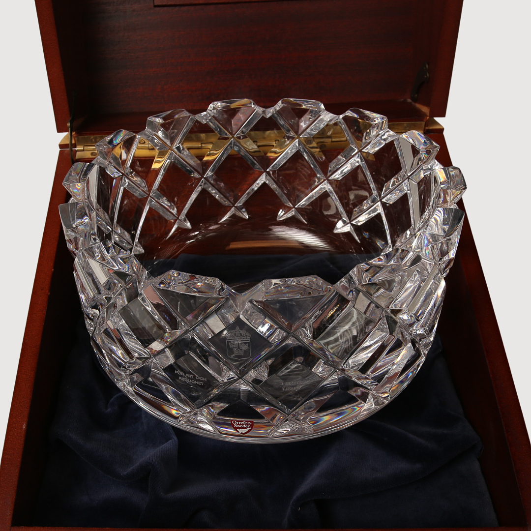 Med inskription "För nit och redlighet i rikets tjänst" Märkt med etikett: Orrefors