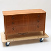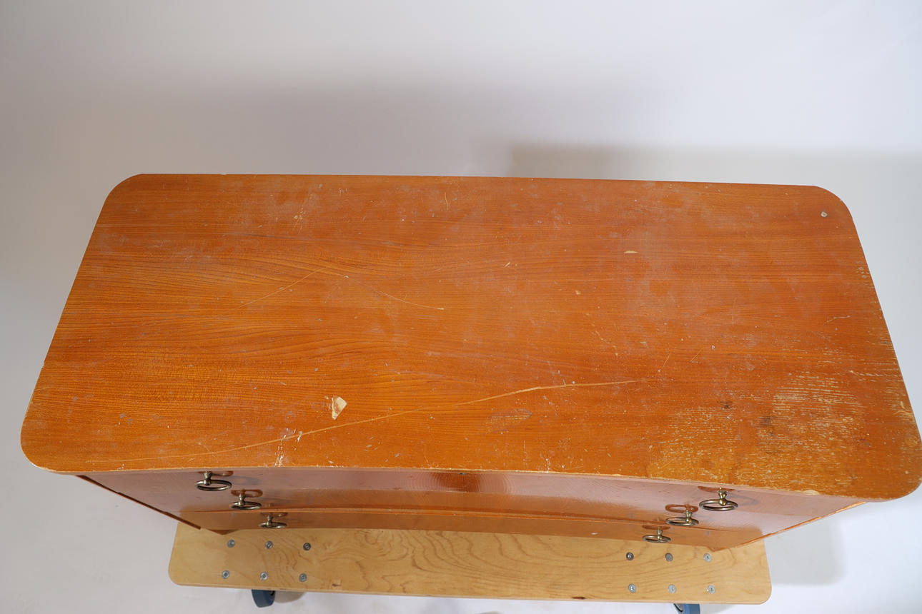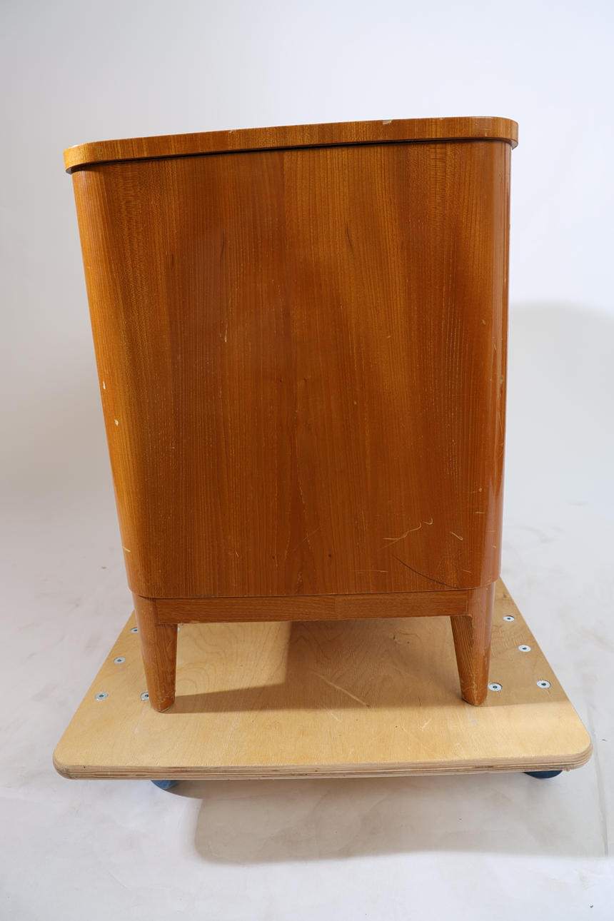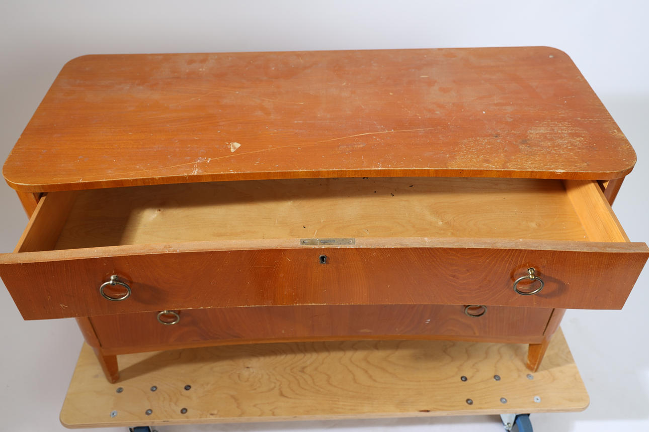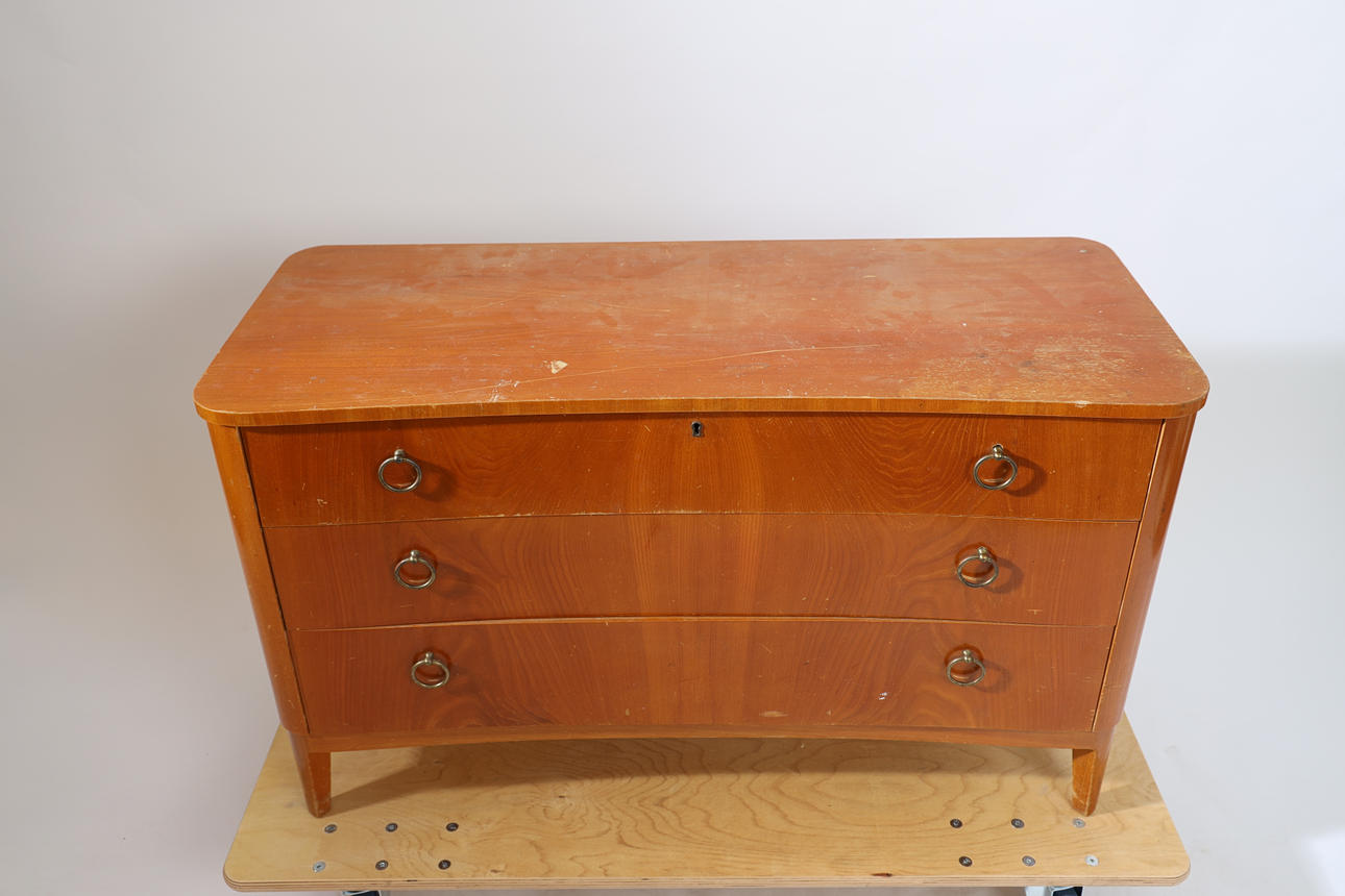 Lätt svängd form, fanerad i alm, 3st lådor. draghandtag i mässing. Höjd 62 Bredd 105 Djup 44cm.