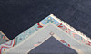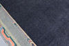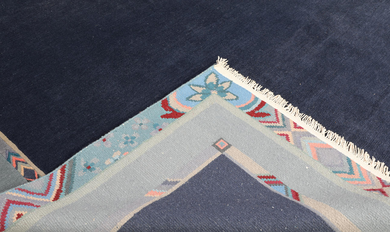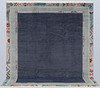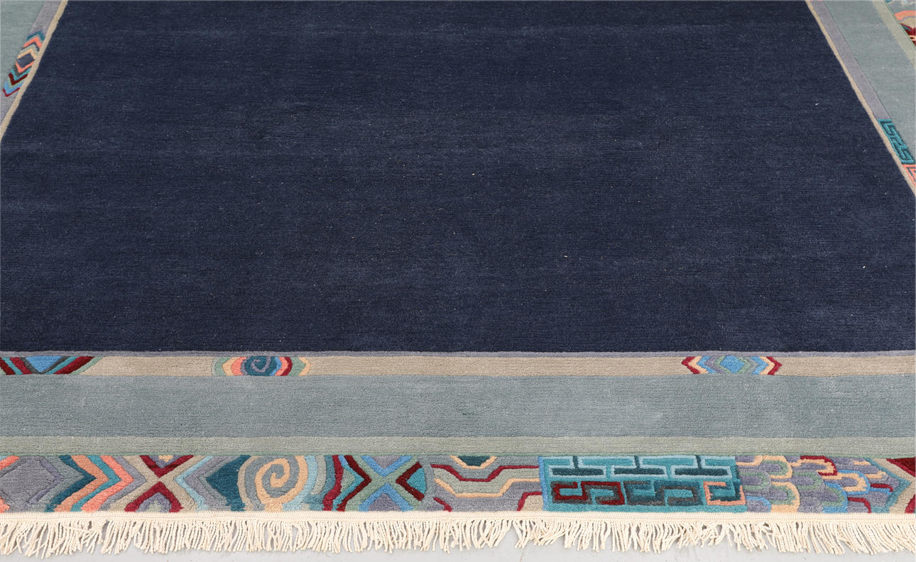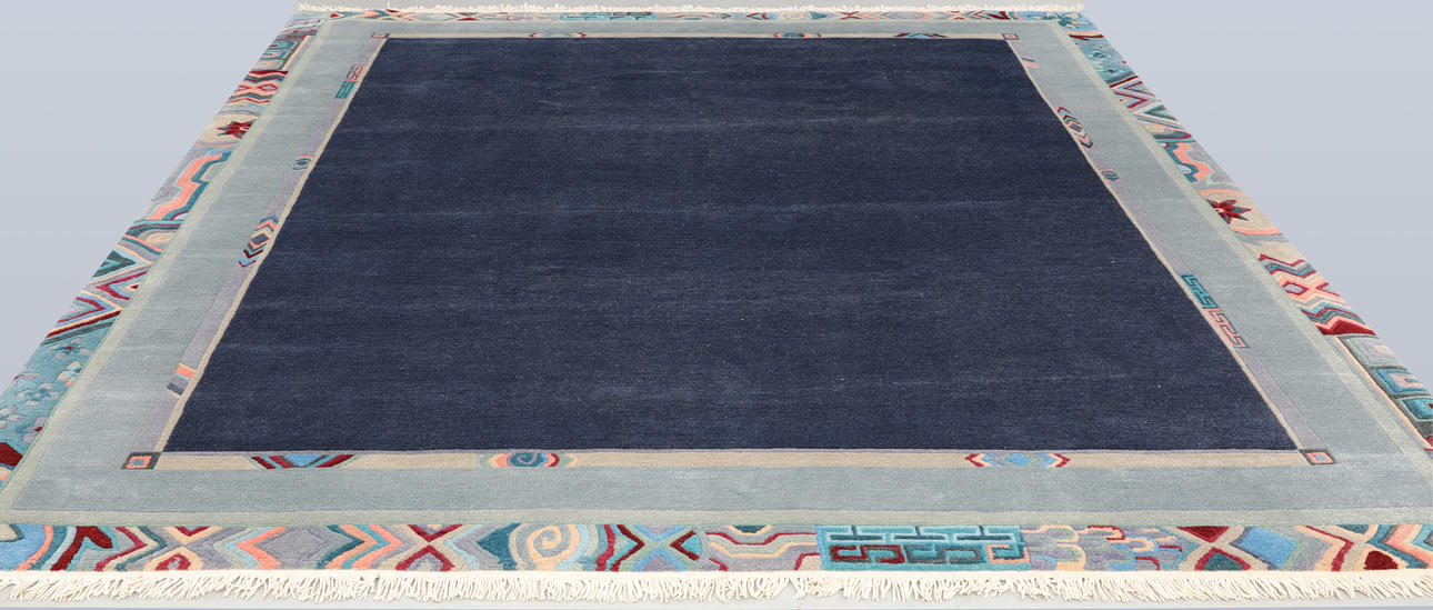Tibet-matta med enfärgat mittfält i mörkblå ton. Bården har ljus bottenfärg med geometriska och stiliserade motiv i rött, turkos, beige och blått. Luggen är av ull och varpen är av bomull.