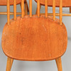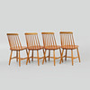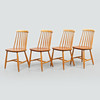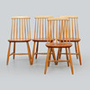 Björk, sitsar i teakfanér. Bredd ca 42, djup ca 42, sitthöjd ca 45, rygghöjd ca 83 cm.