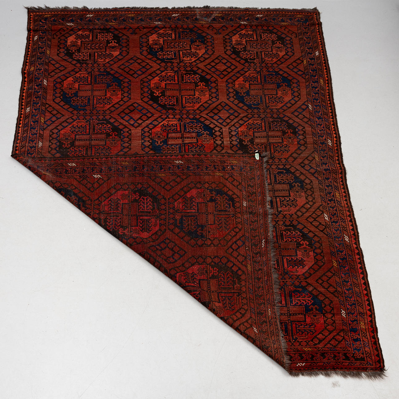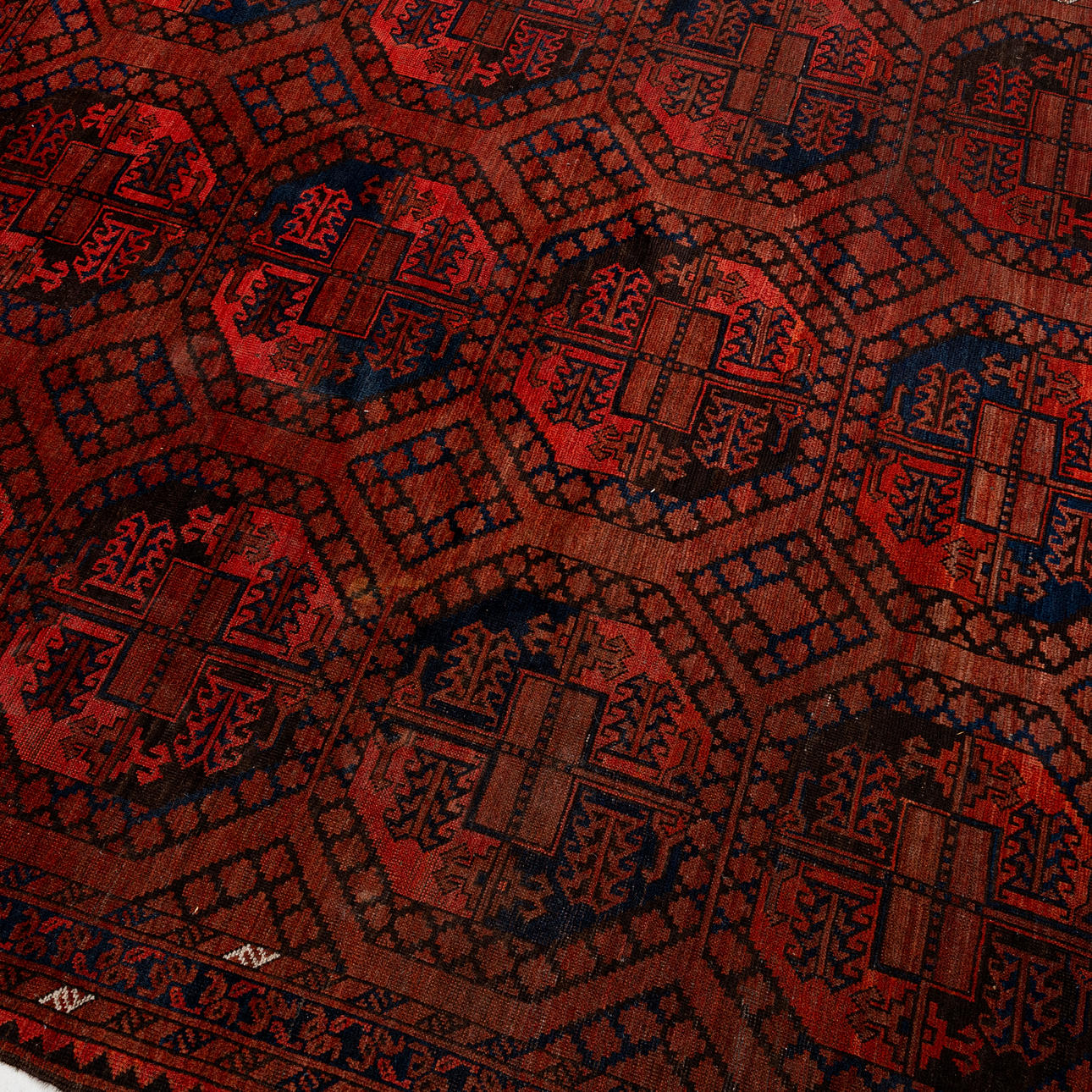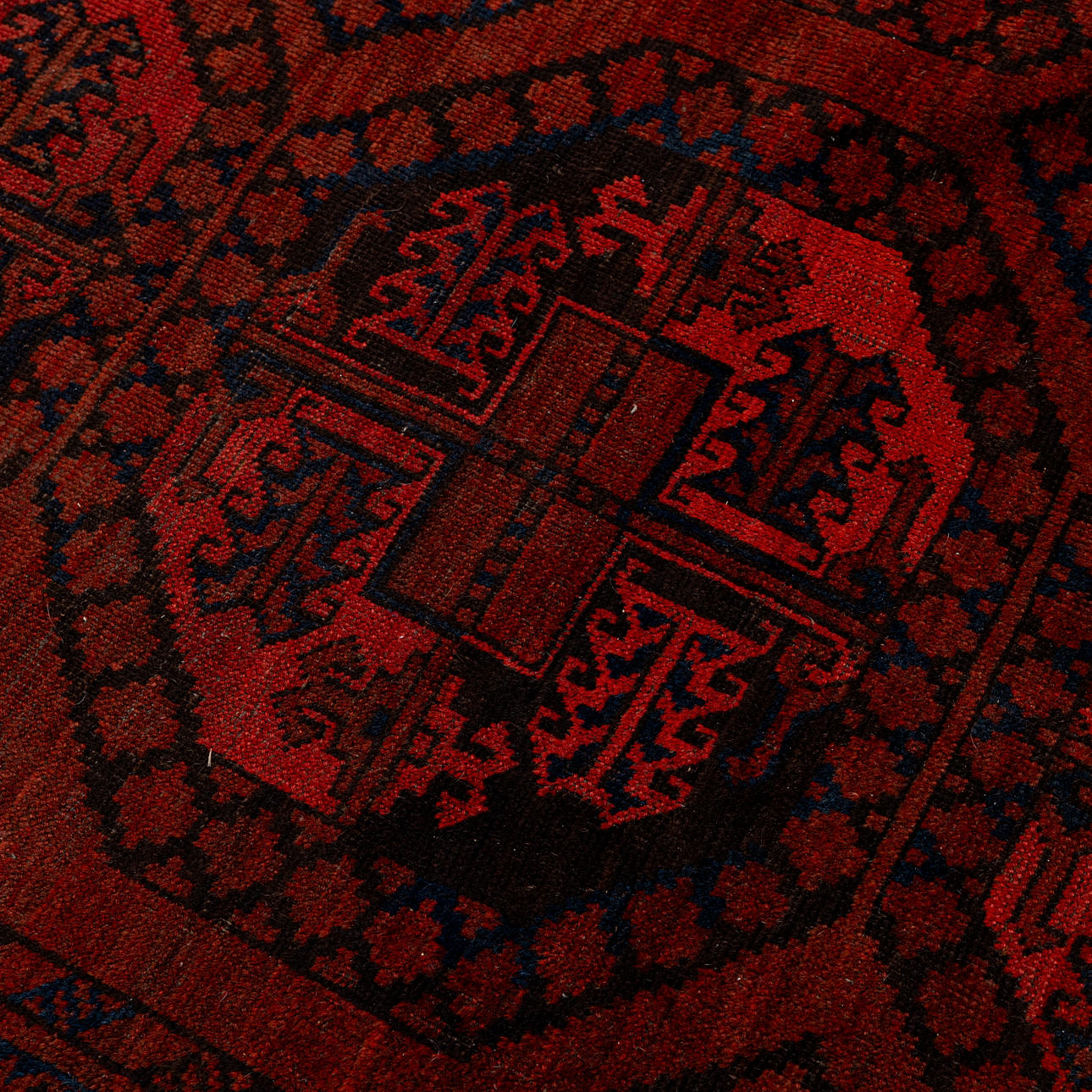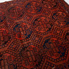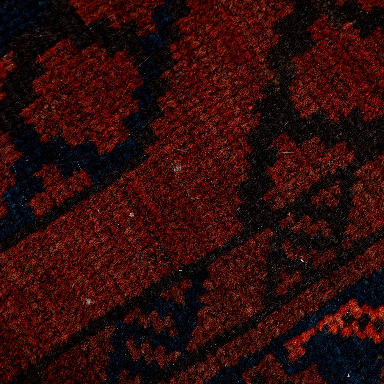 Röd botten med geometriskt mönster i svart och blått.