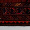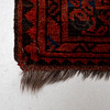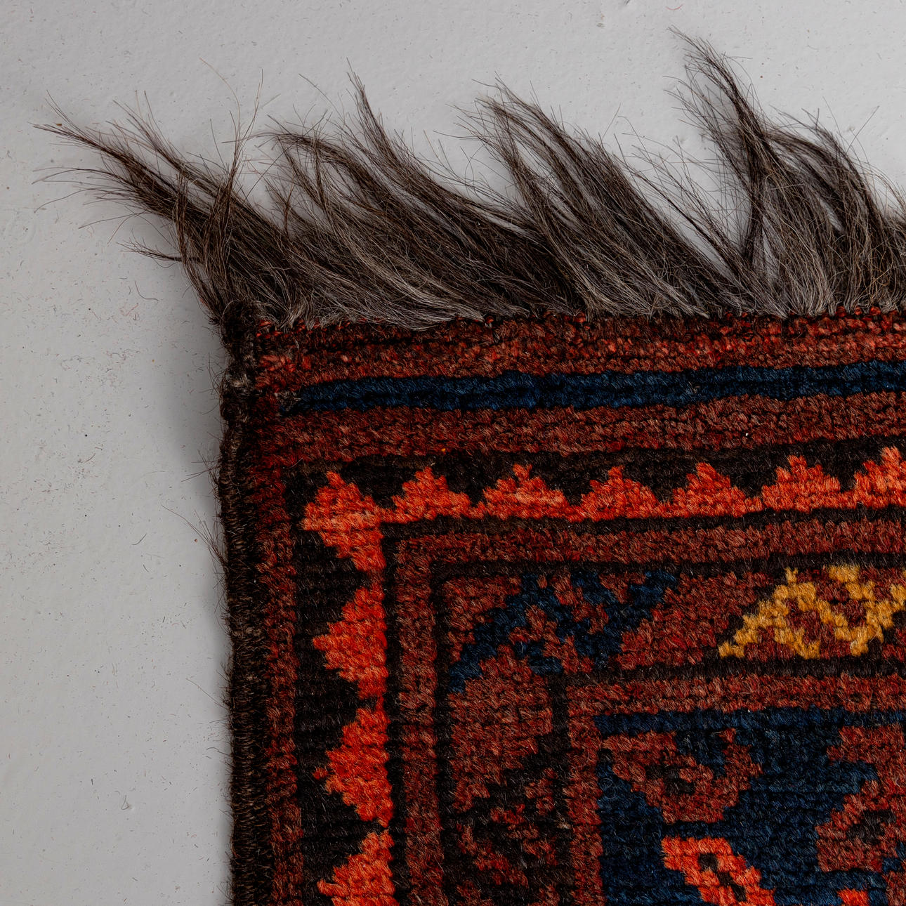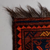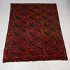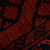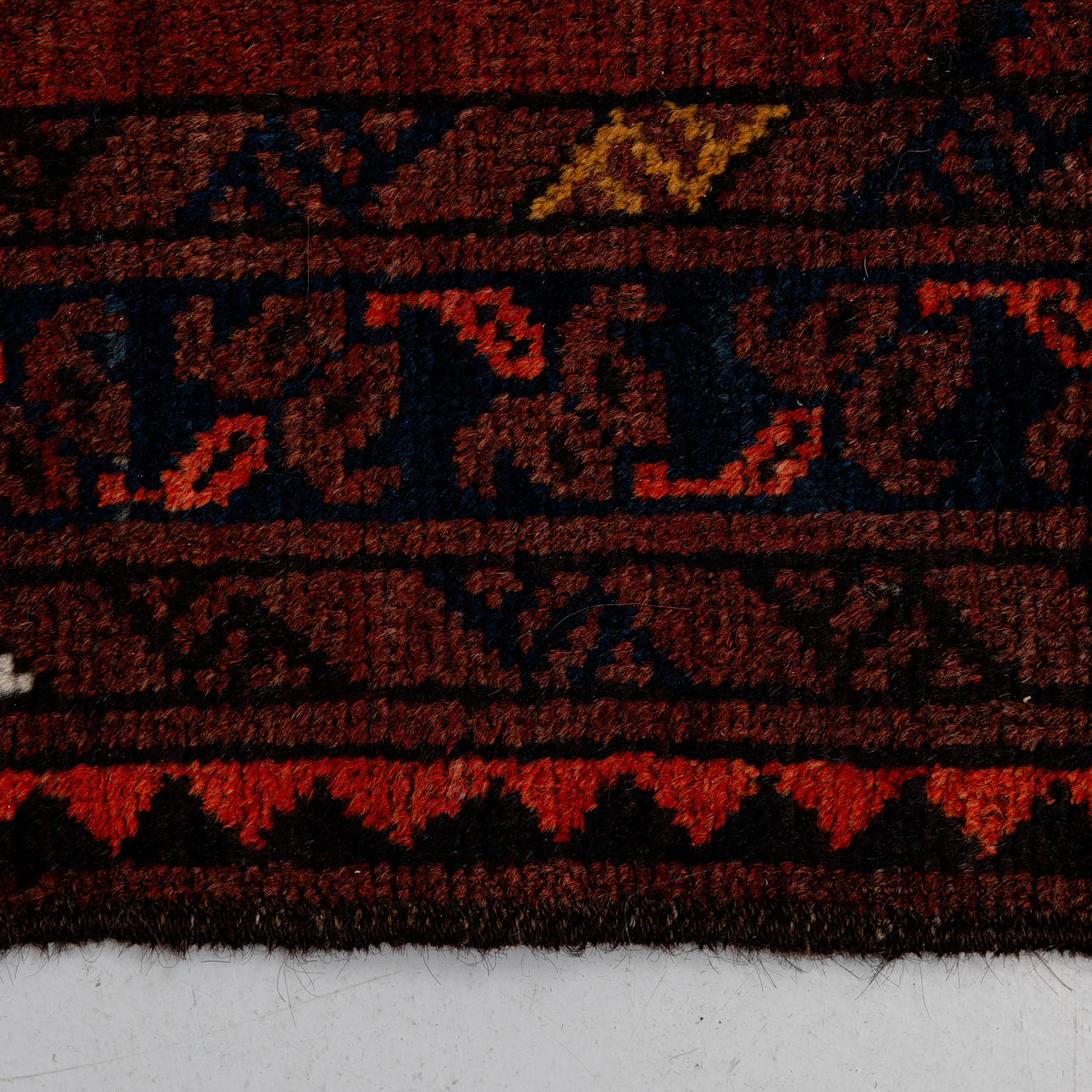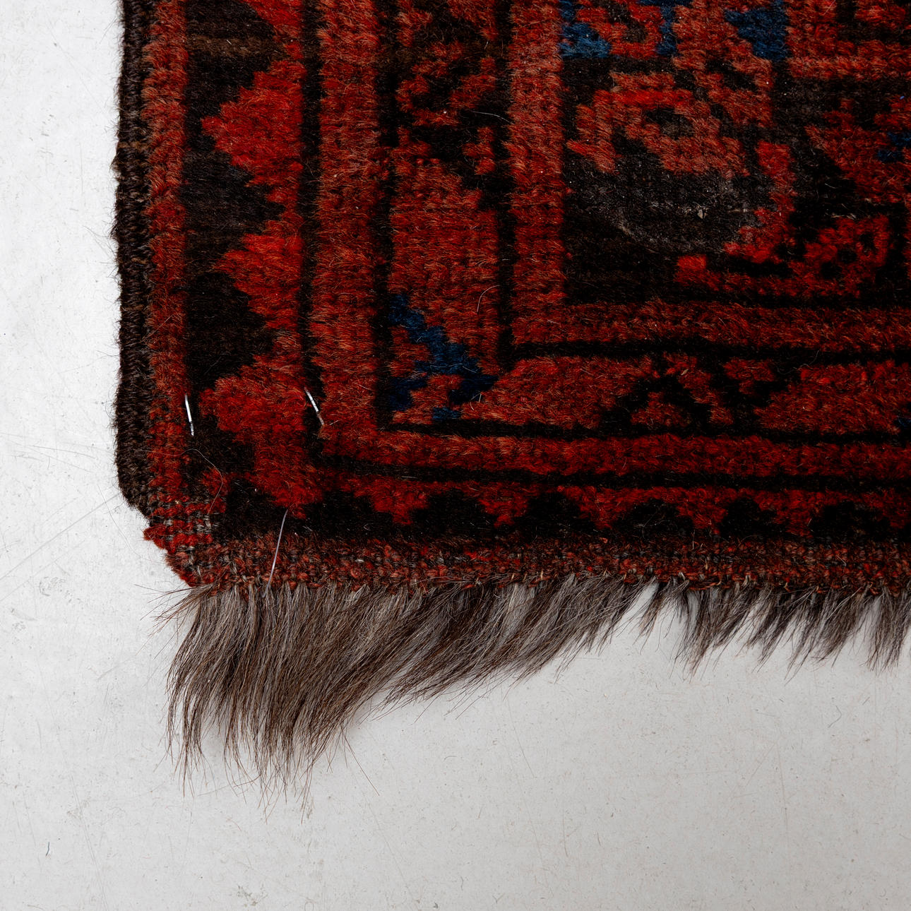 Röd botten med geometriskt mönster i svart och blått.