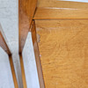 Slitage, fläckar, slagmärken, torrsprickor, fanerskador.