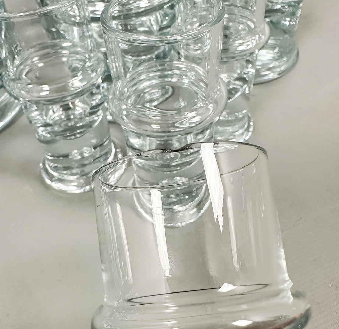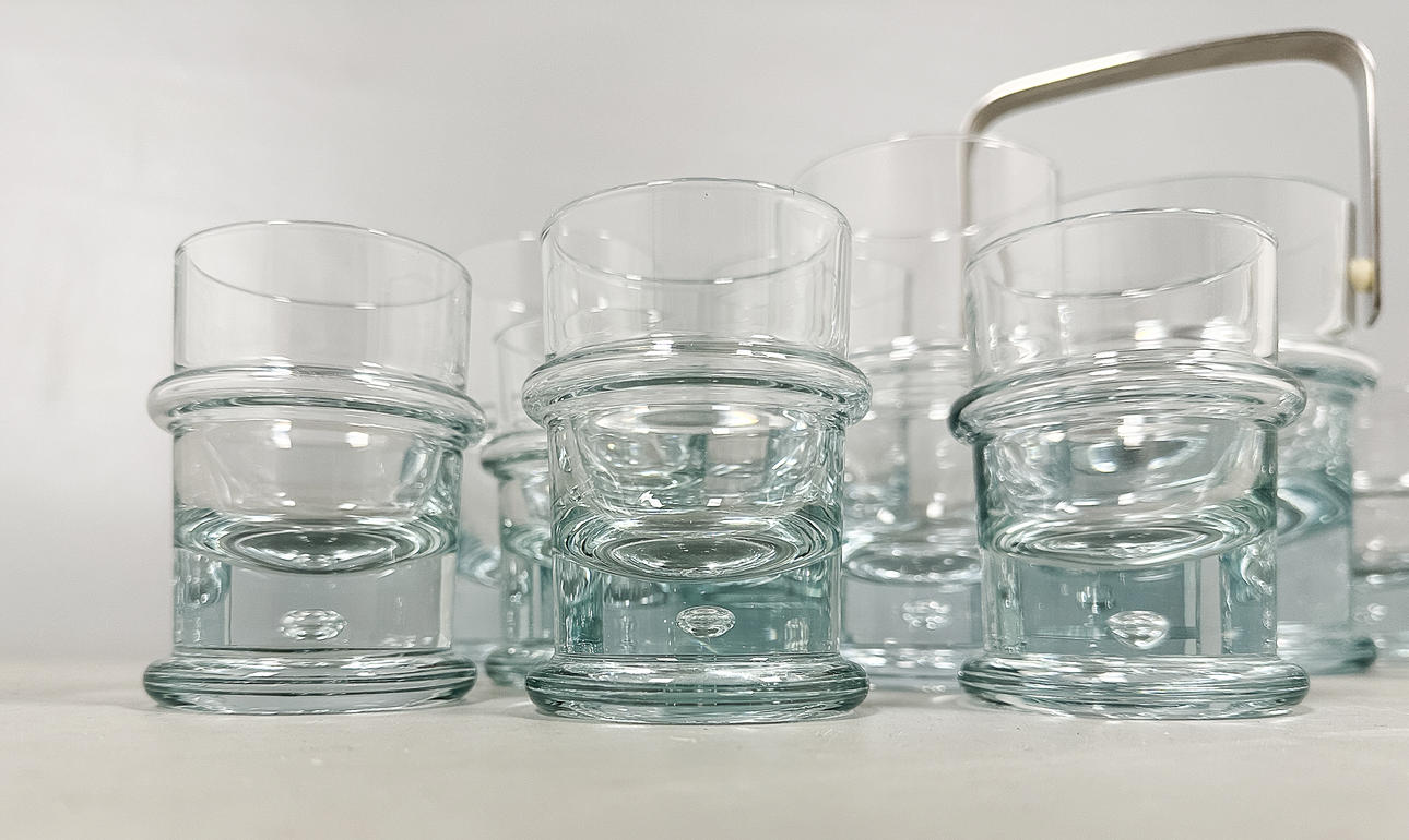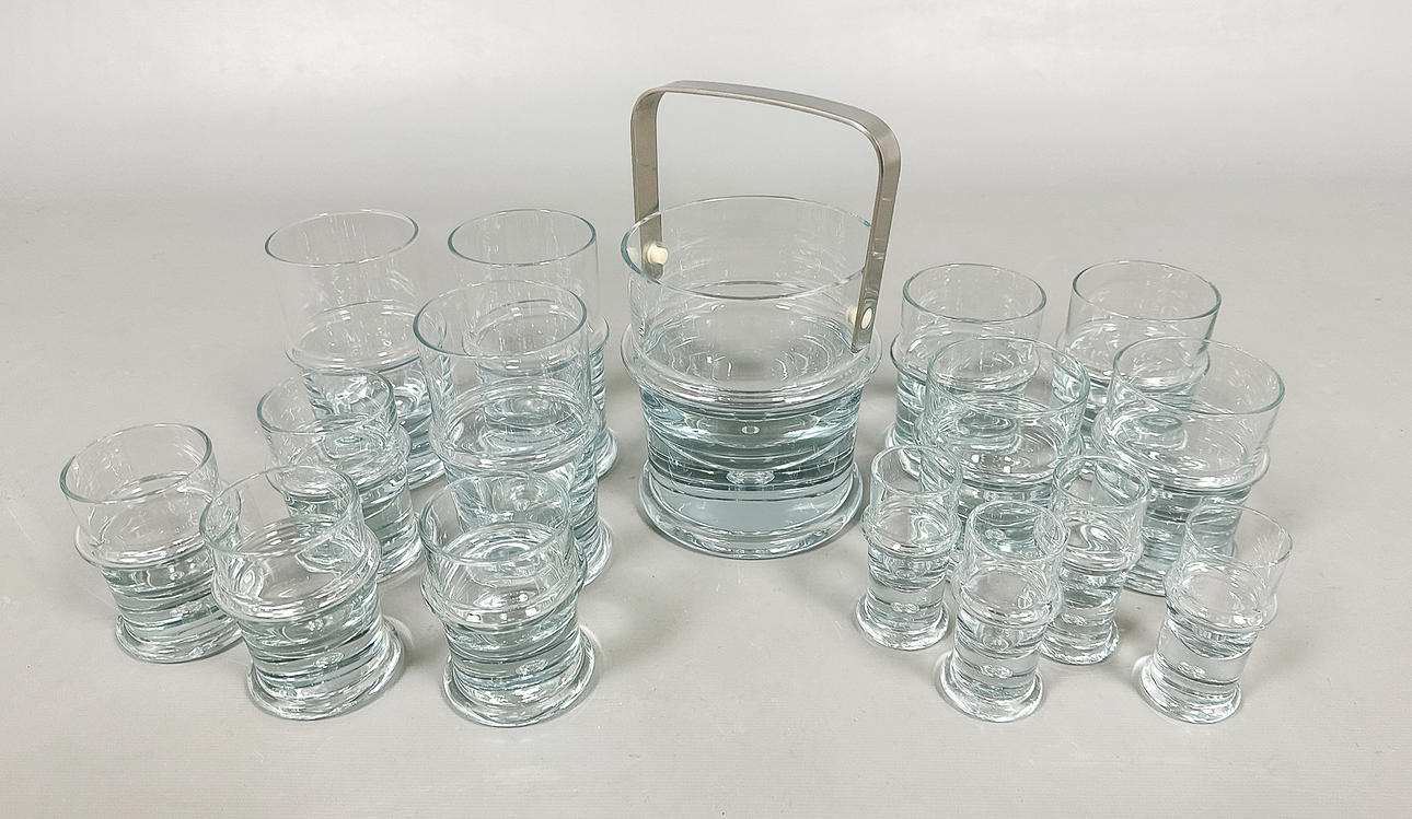 3 st ölglas, höjd 14,5 cm 4 st whisky glas, höjd 11 cm 4 st seltersglas, höjd 9,5 cm 4 st snapsglas, höjd ca 9 cm 1 st ishink, höjd 15 cm.
