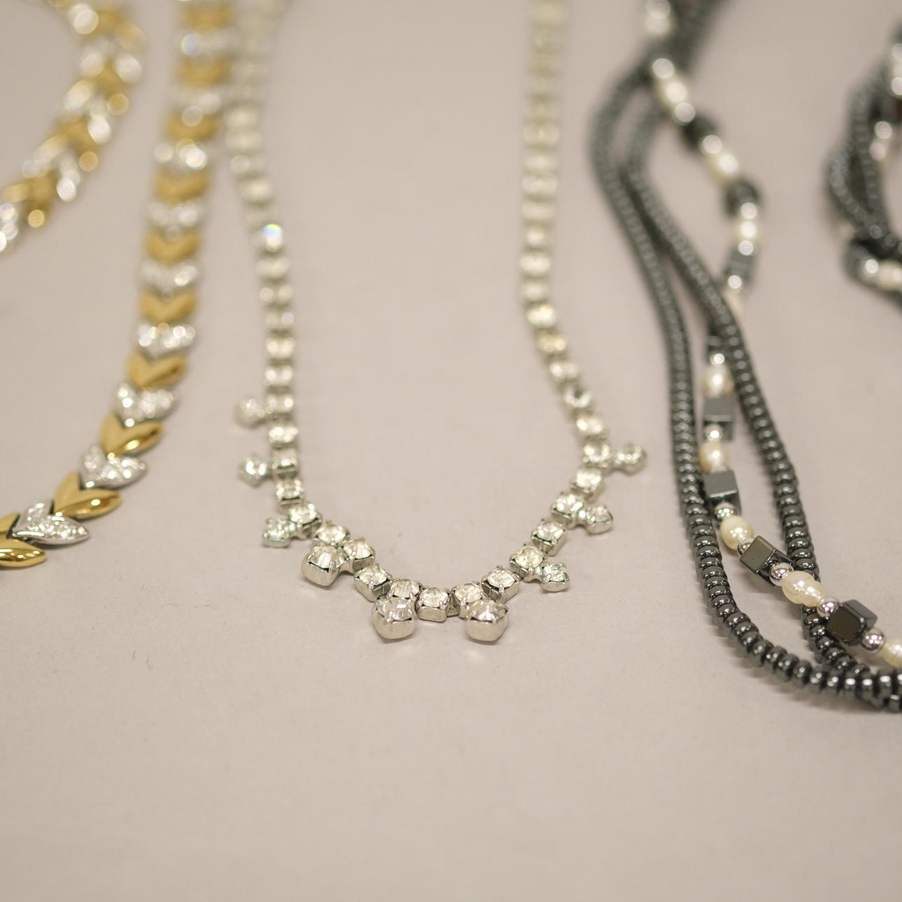 Mindre bruksslitage. Strass-collier saknar en sten.