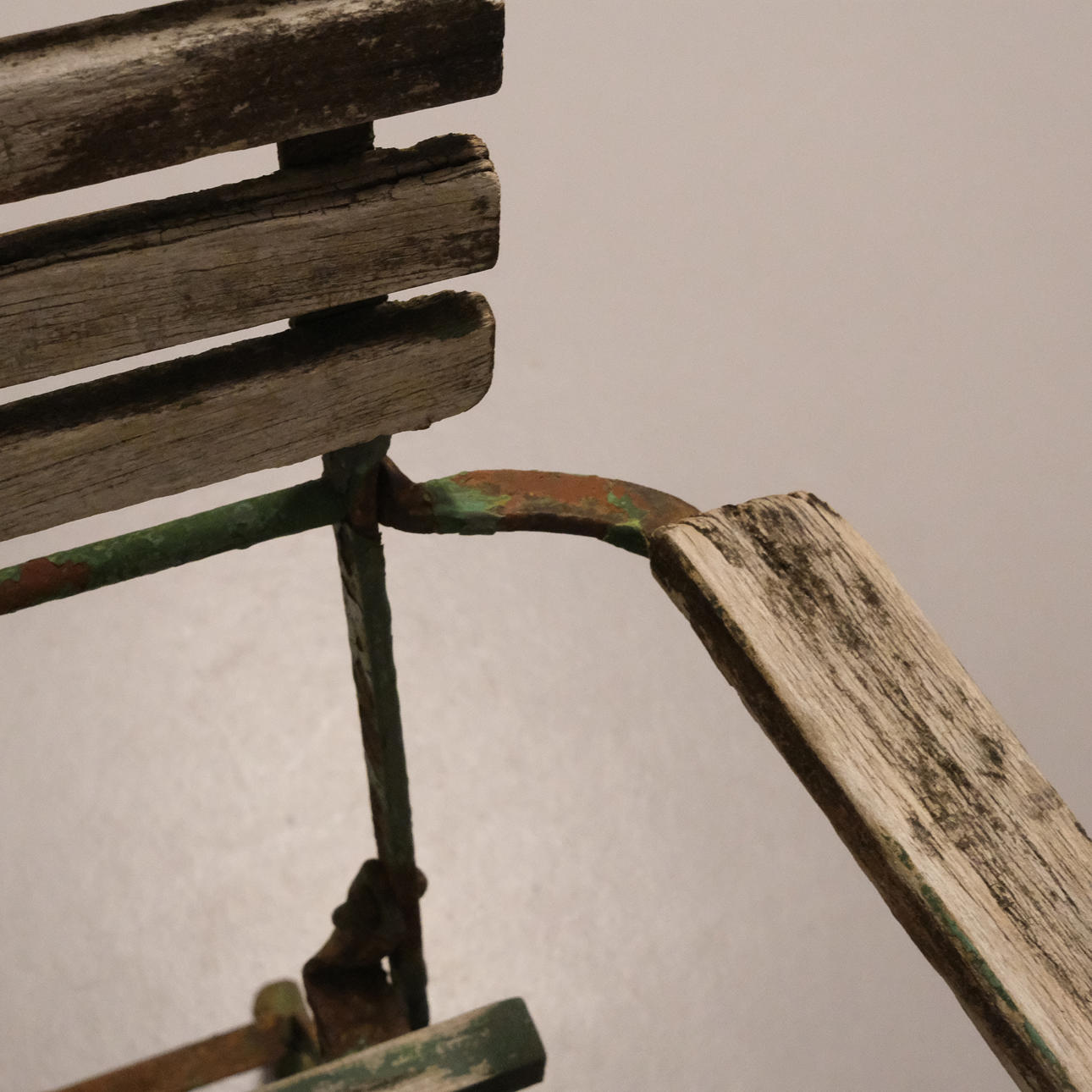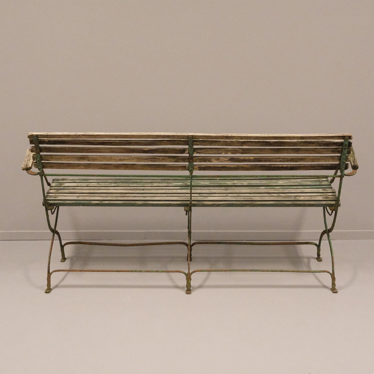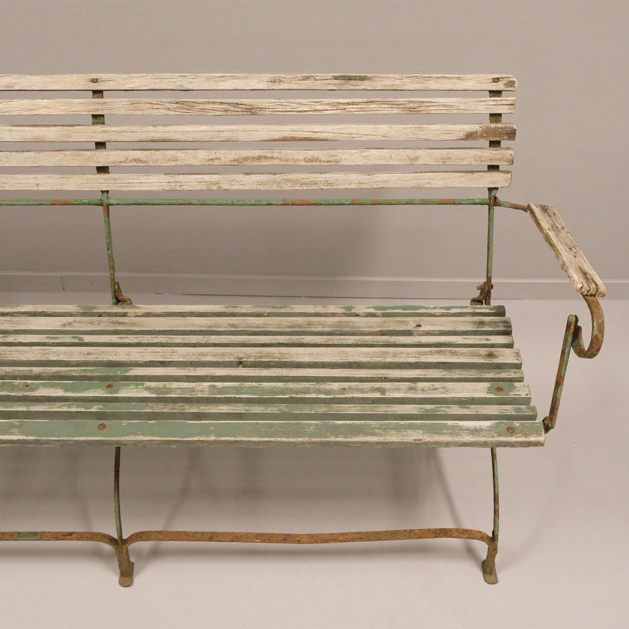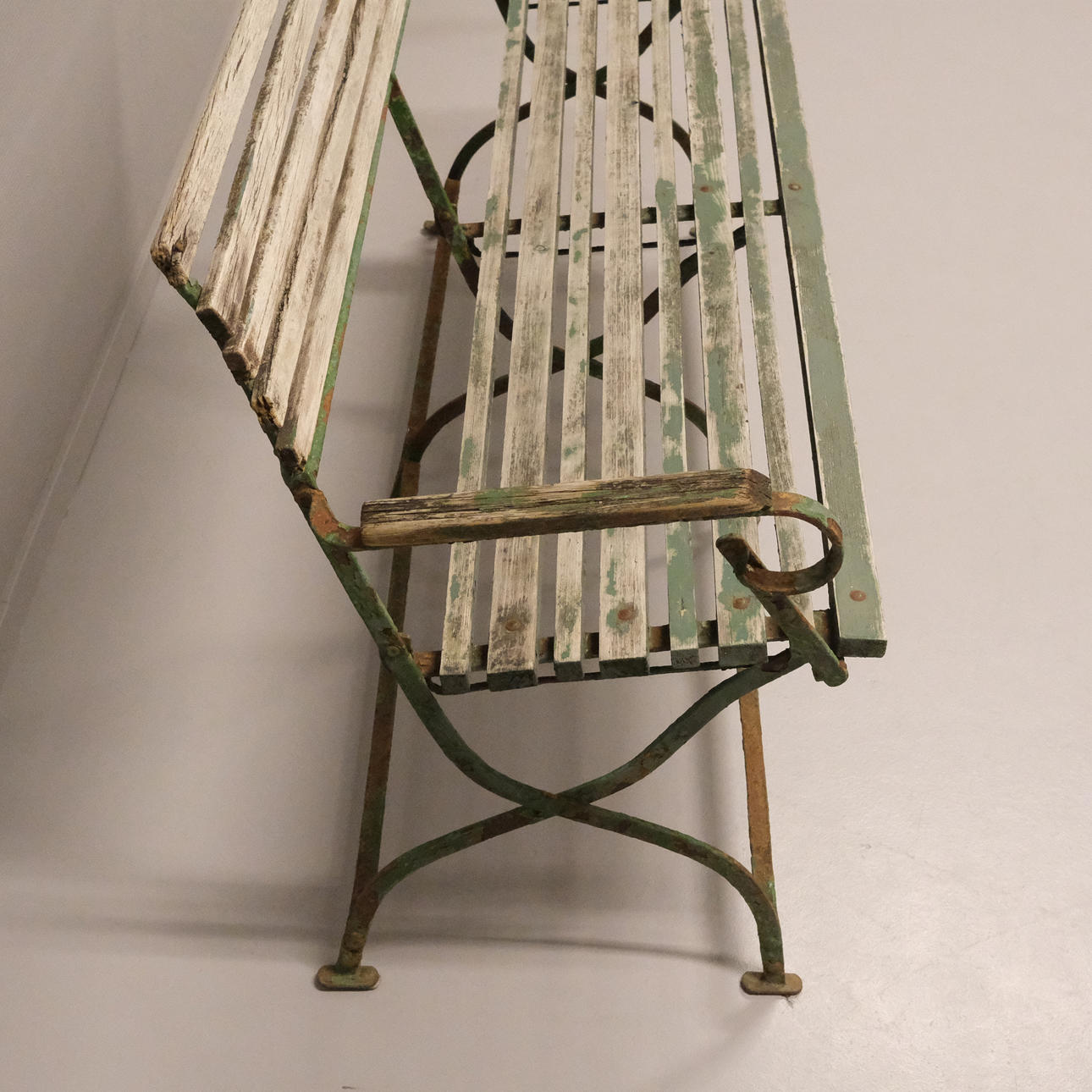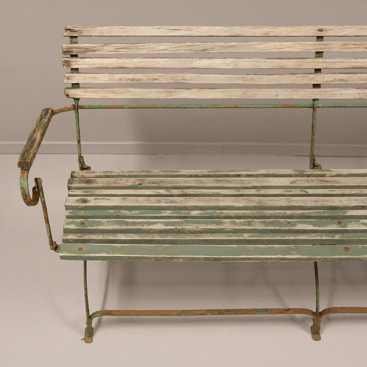Stomme i smide, träribbor. Höjd 83cm, sitthöjd 46cm. Längd ca 170cm. Djup ca 60cm.