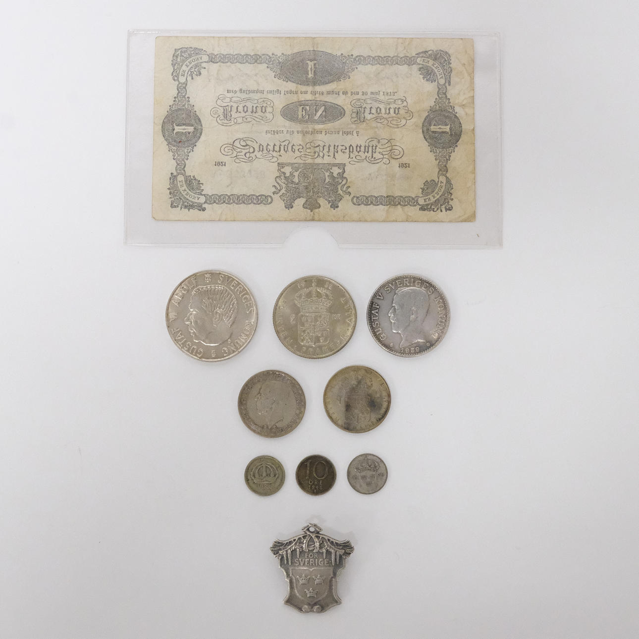 Mynt, 40%, Sverige och brosch, total vikt ca 62 gram.