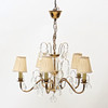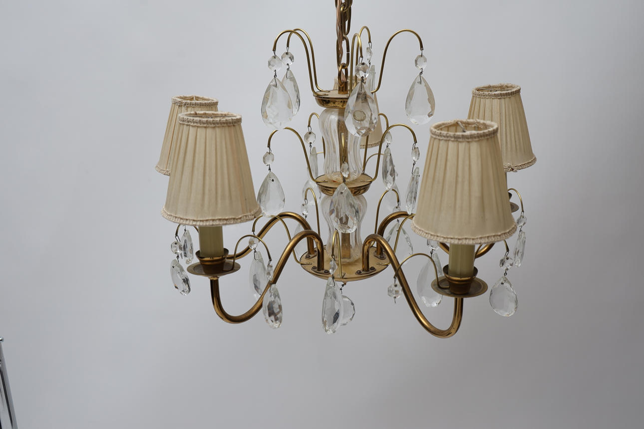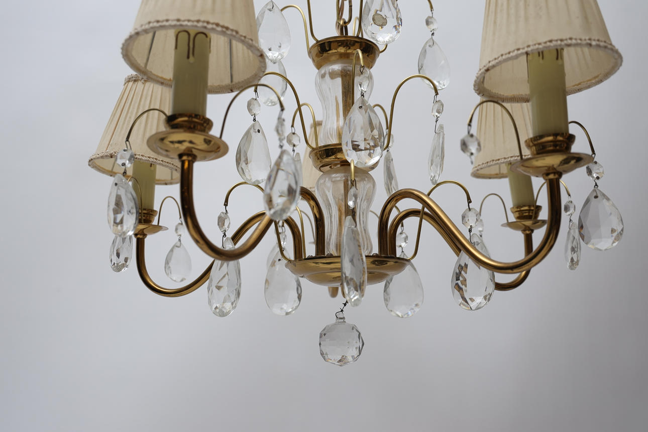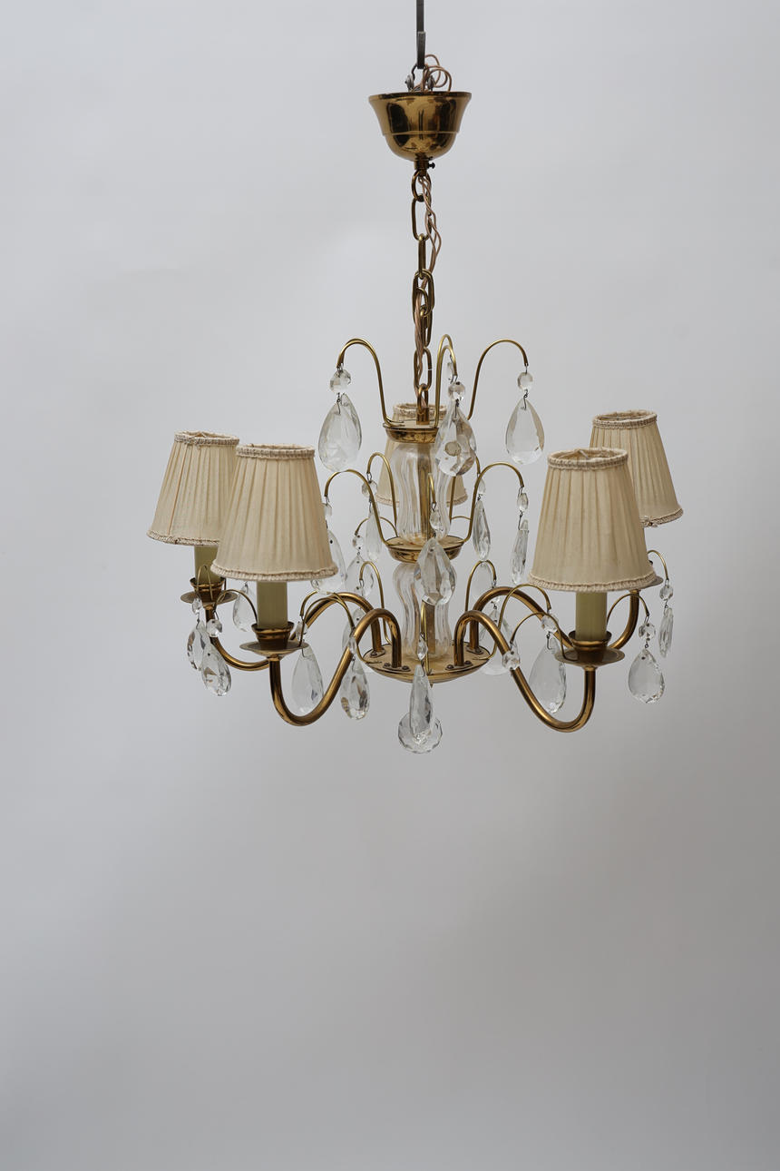 Stomme i mässing, behängd med slipade prismor. Fem ljuspunkter.