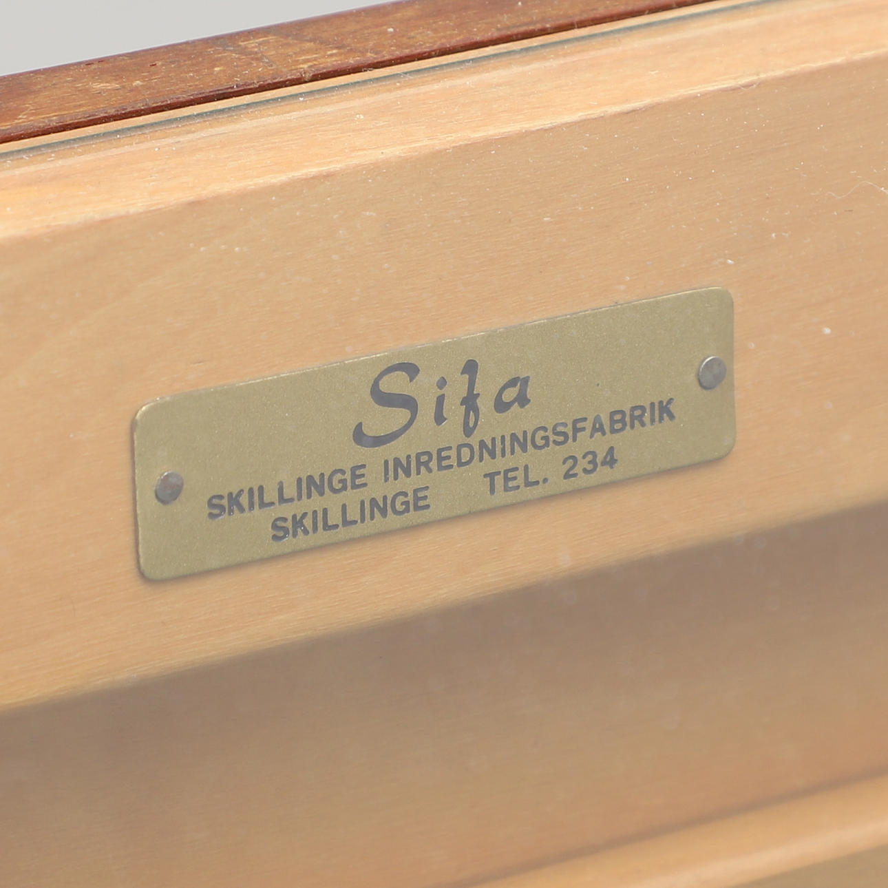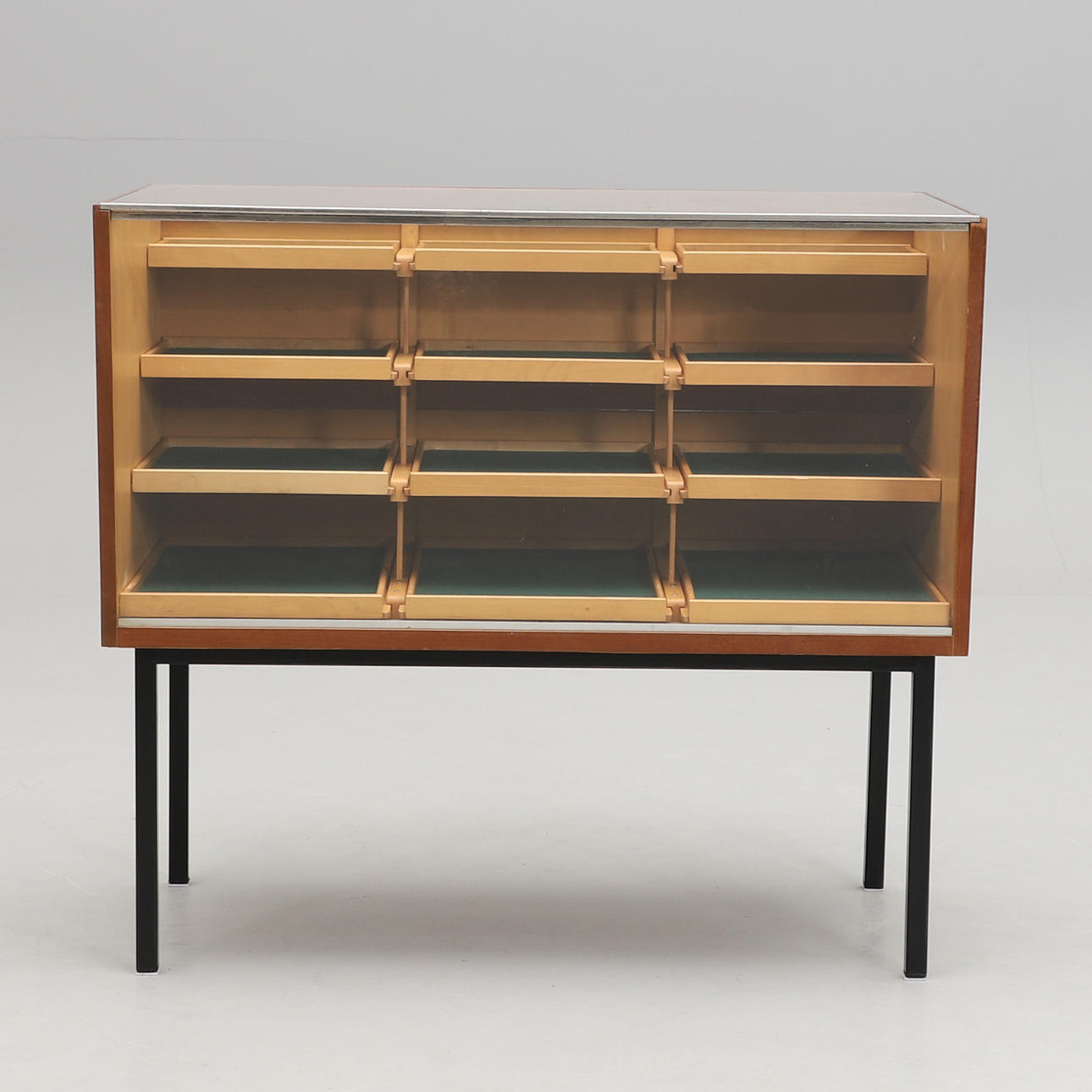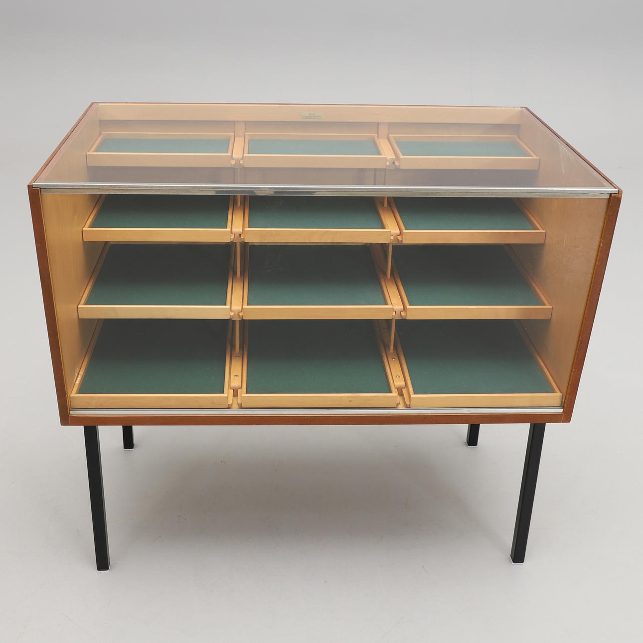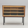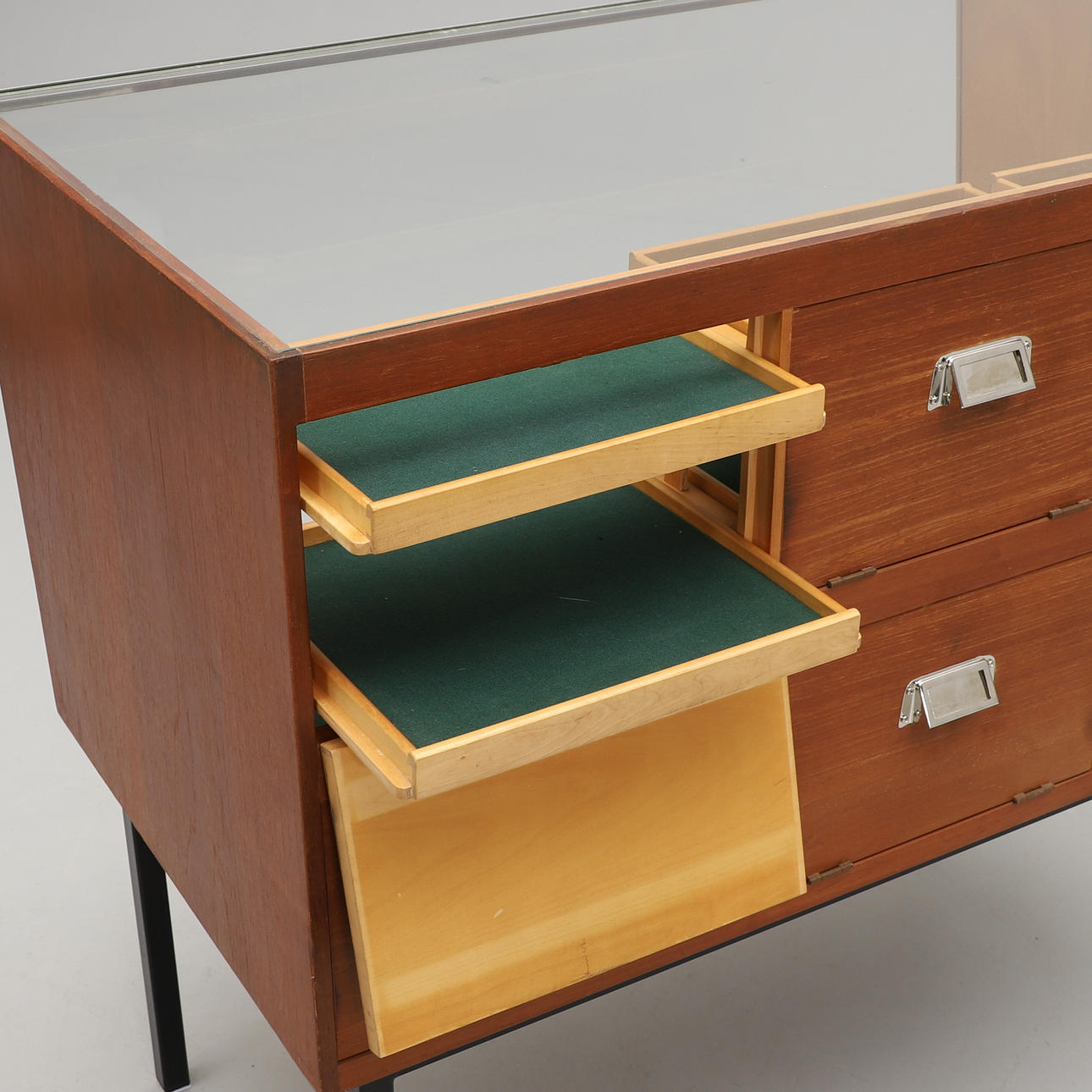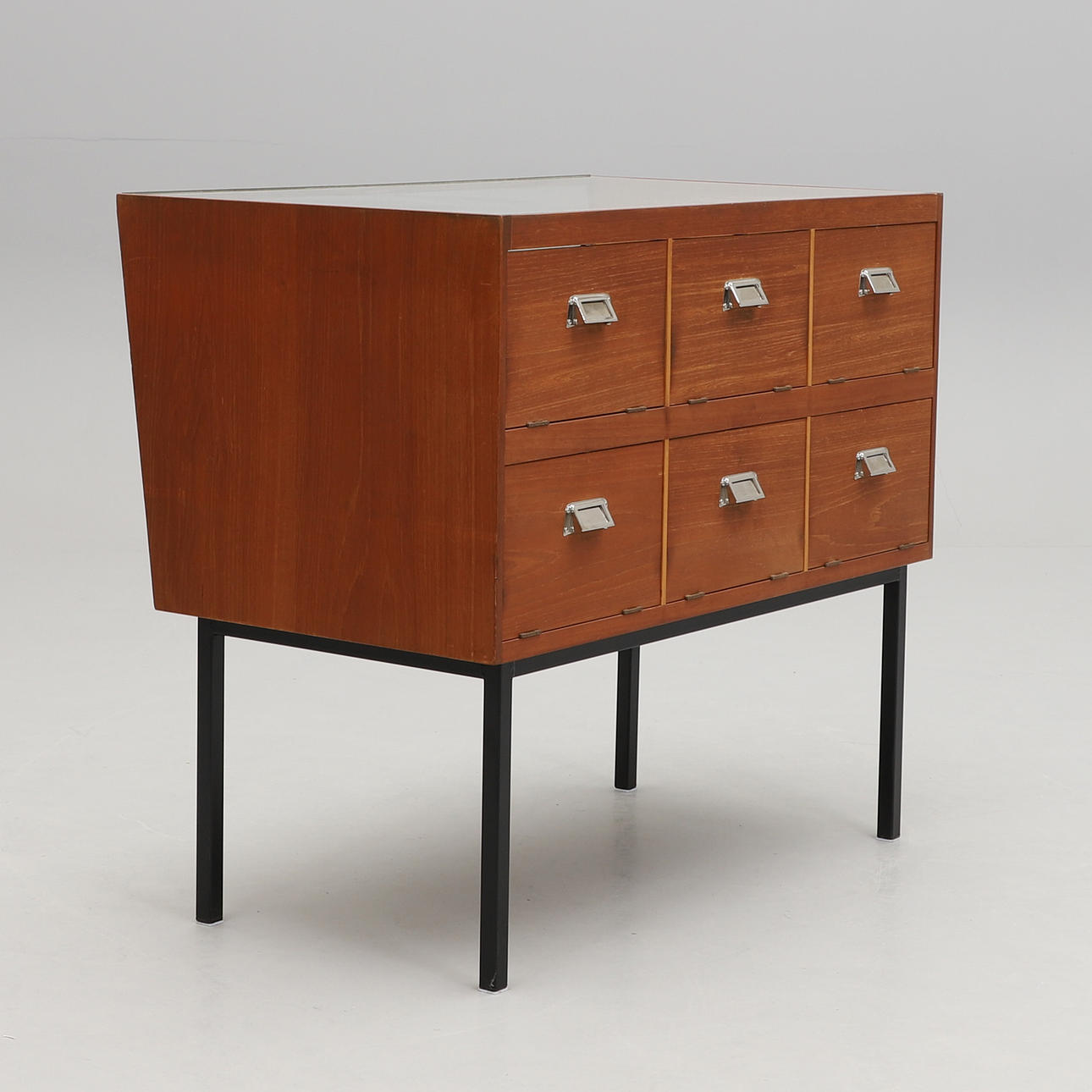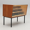Glasskiva och snedställd glasfront. På baksidan 6 luckor med bakomliggande lådor. Längd 100, djup 60, höjd 90 cm.