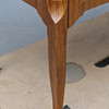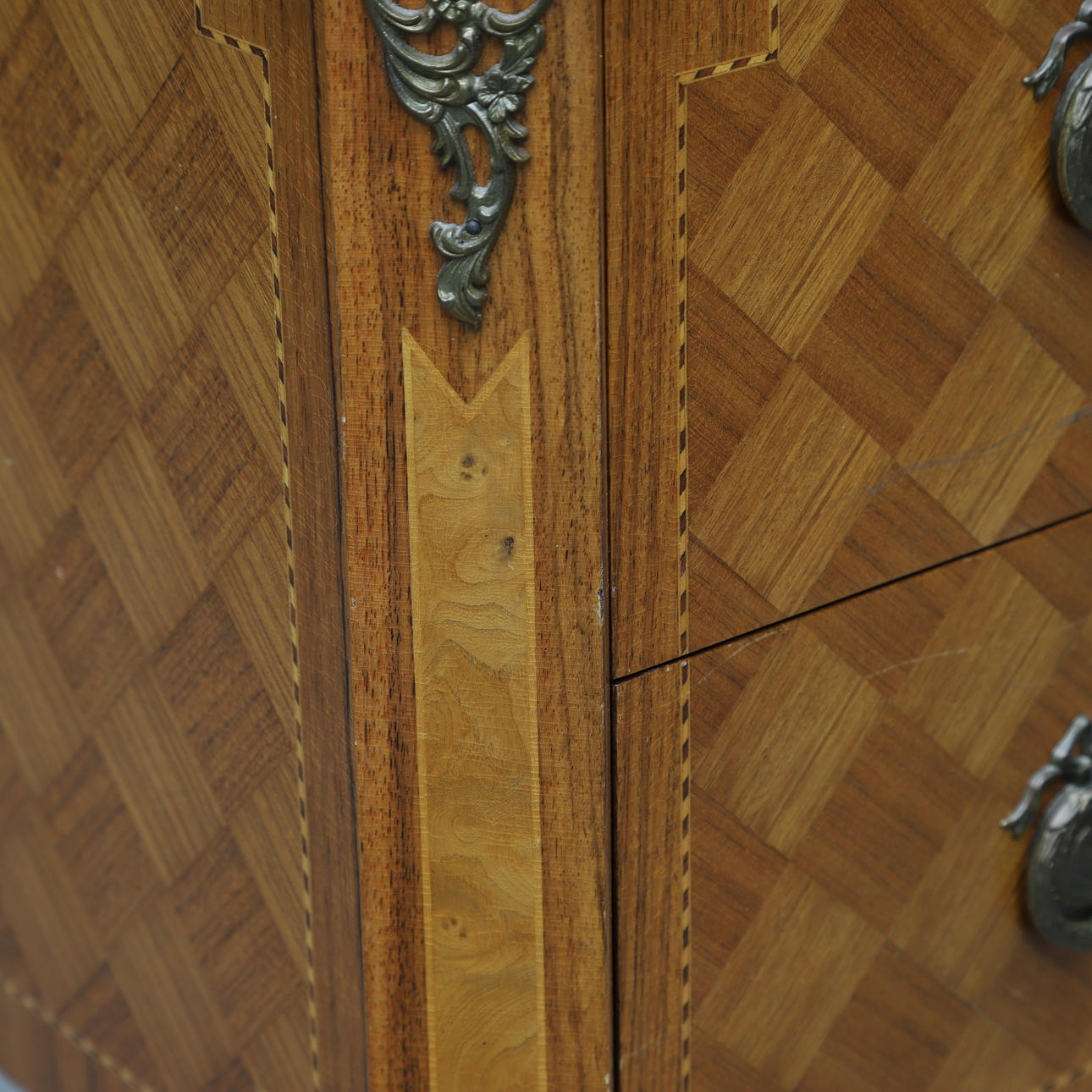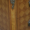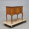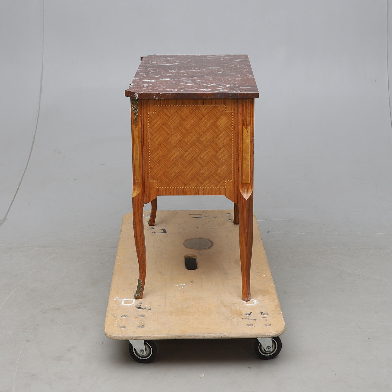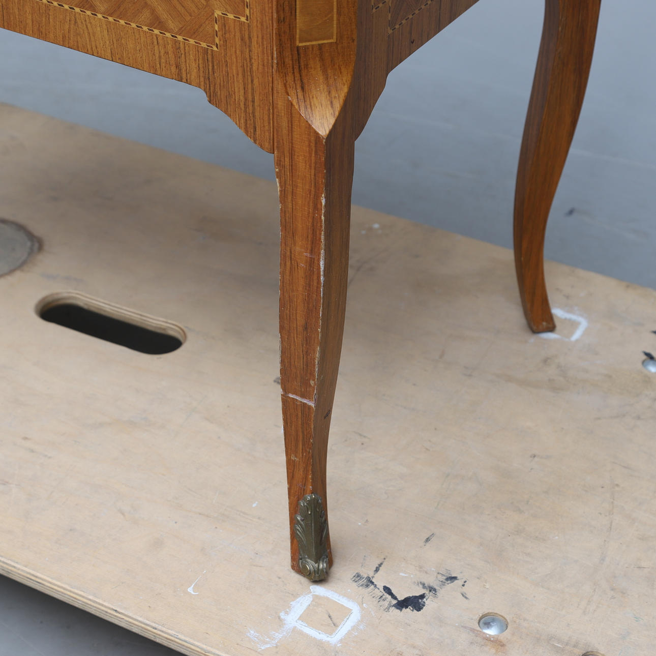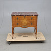 Fanerad med olika träslag, stenskiva. Längd ca 80, bredd 44, höjd 75 cm.