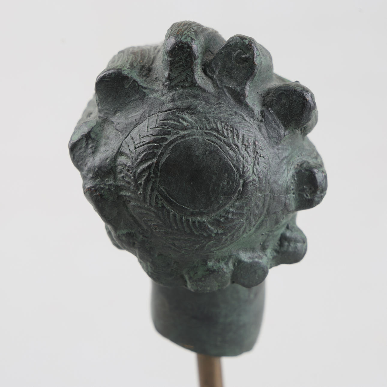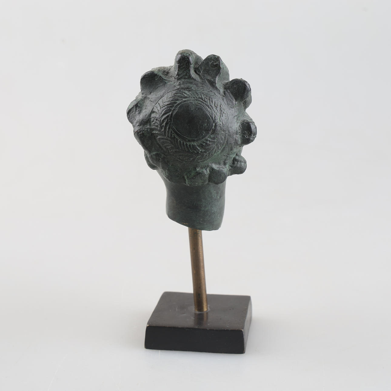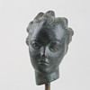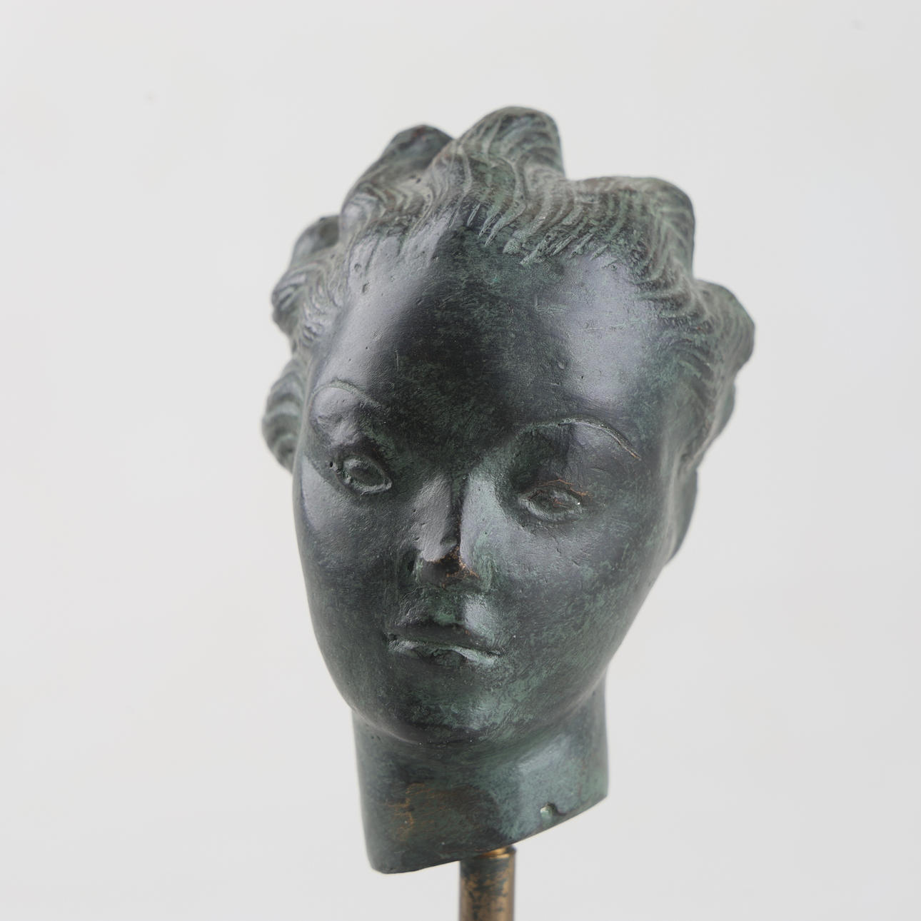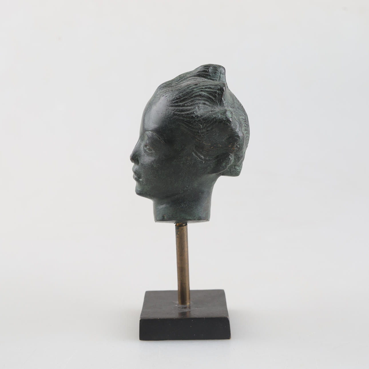 Grönpatinerat brons i form av änglahuvud. Även sockel i metall. Höjd 16,5 cm.