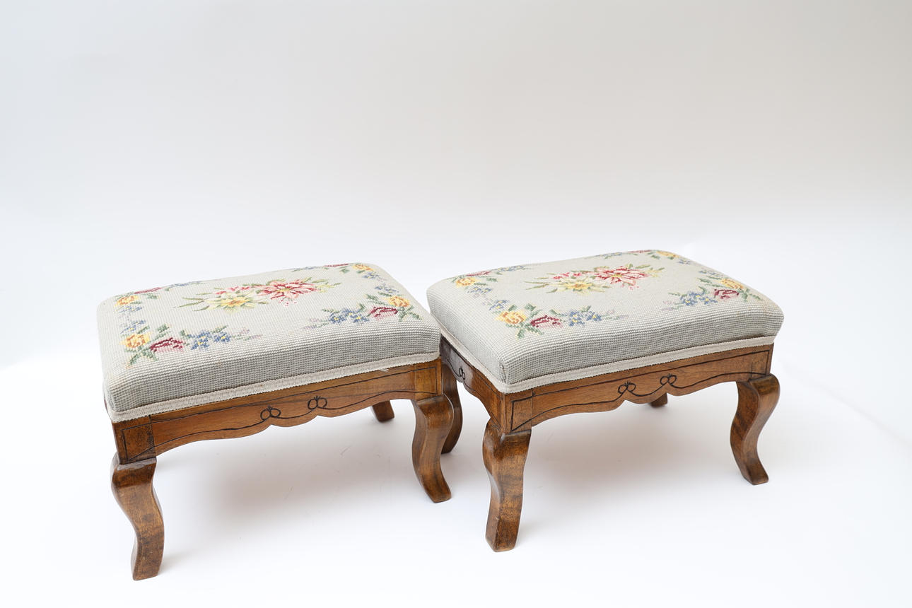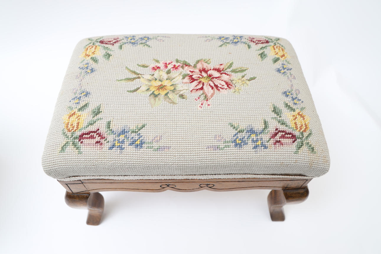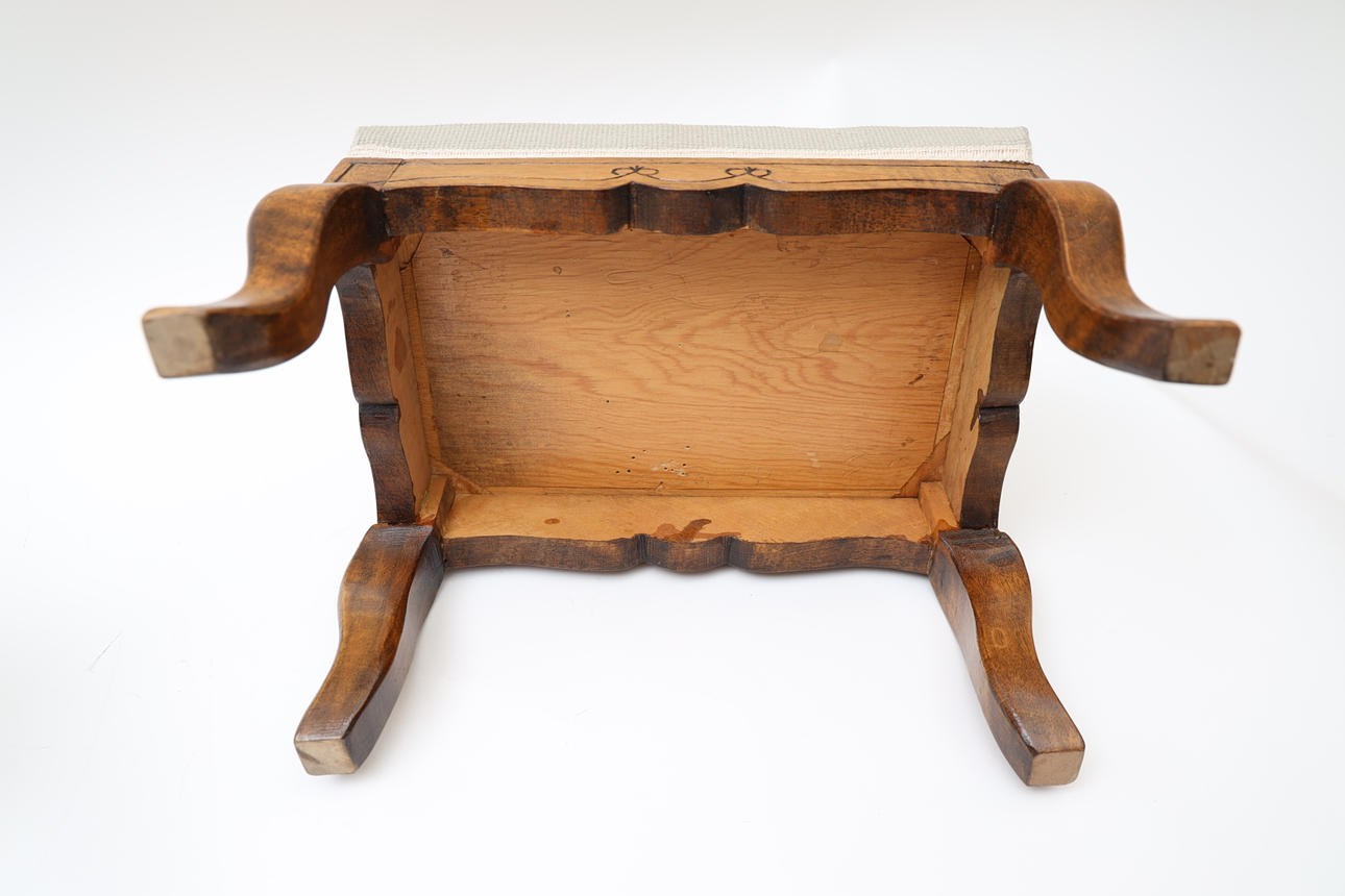 Betsat trä med skuren dekor. Broderad klädsel.