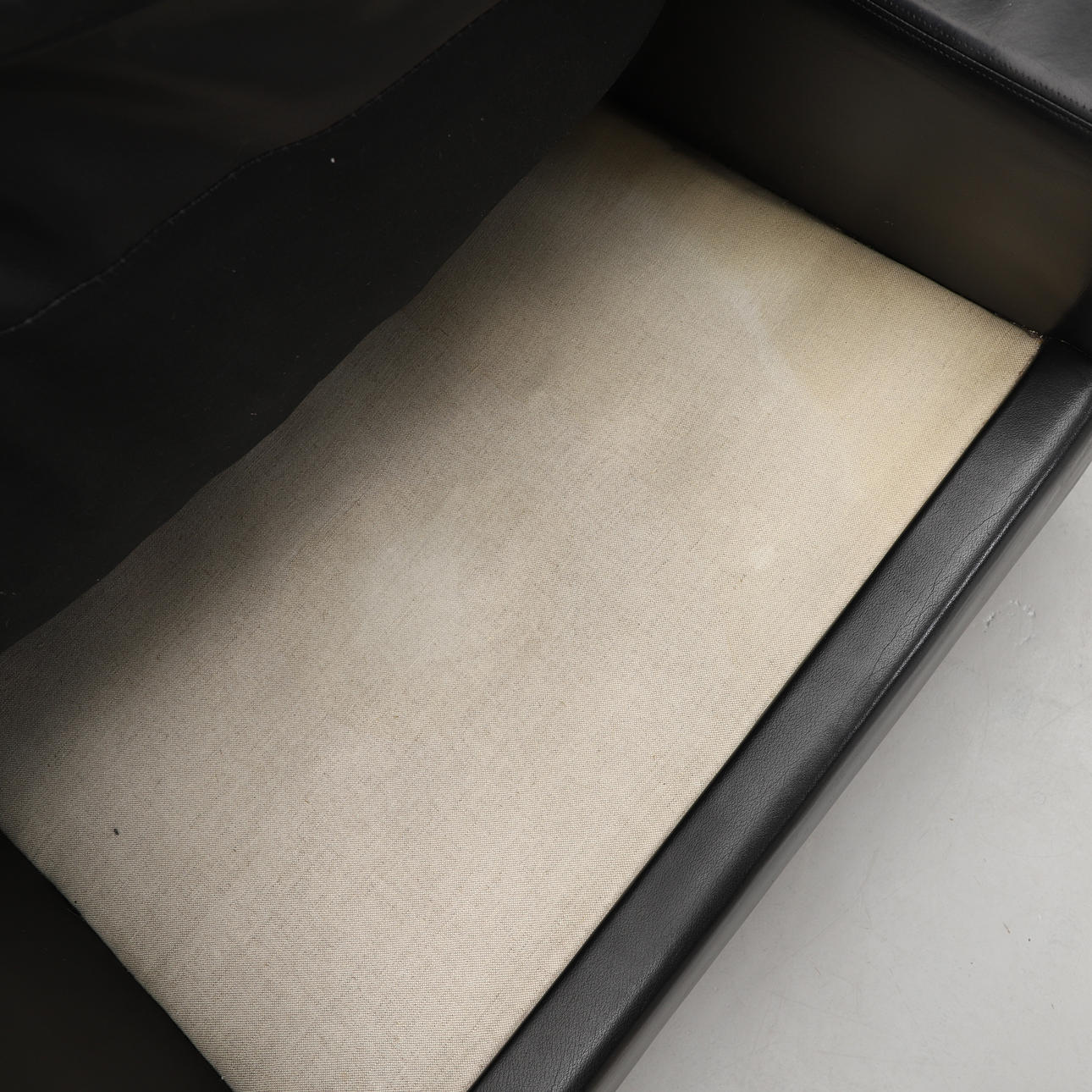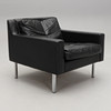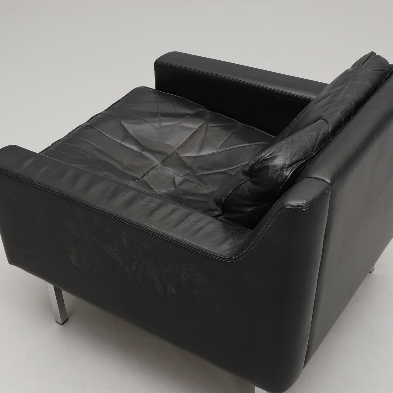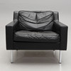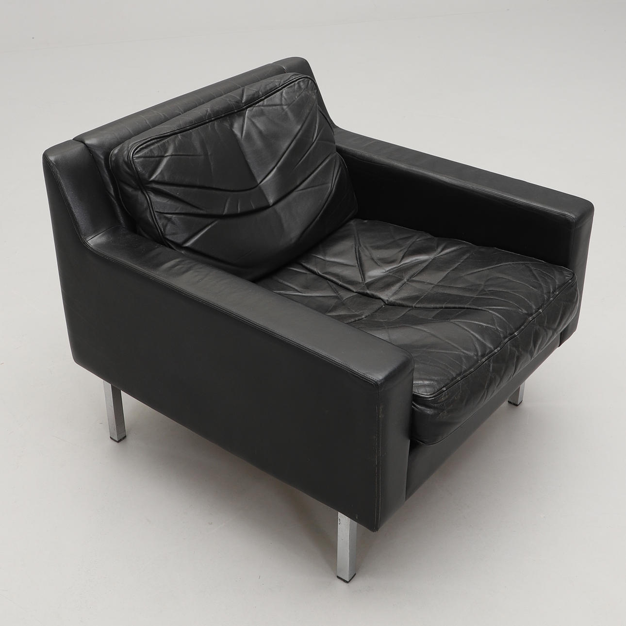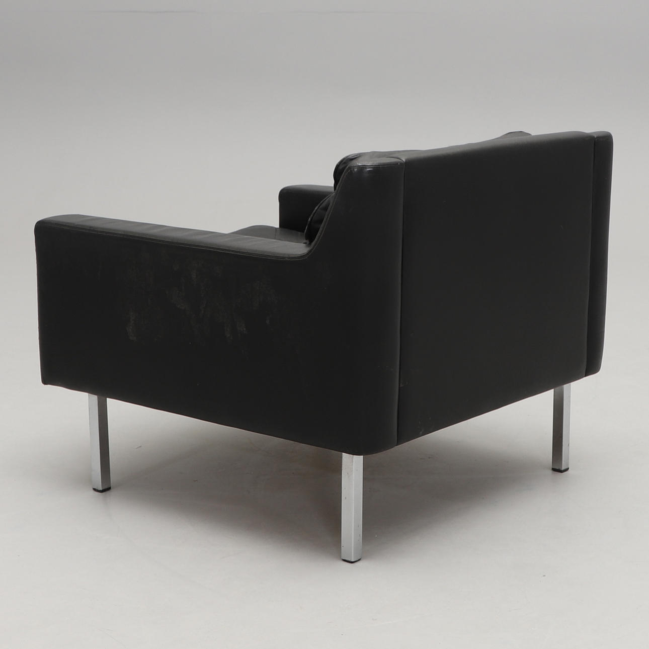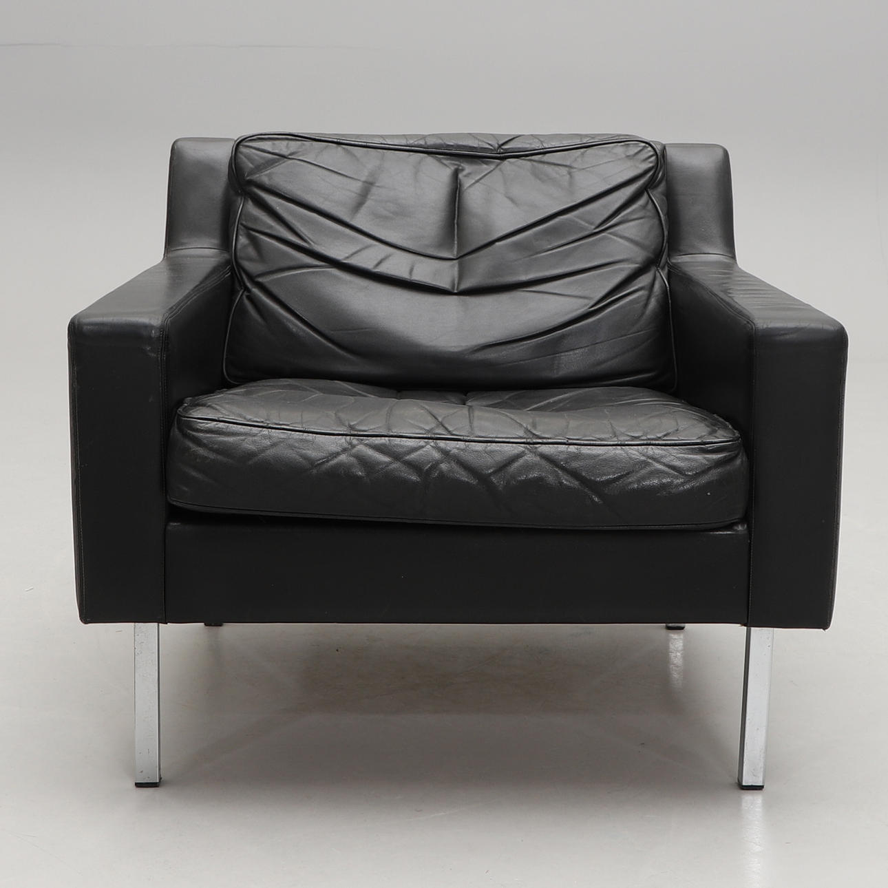 Klädd i svart läder med lösa stoppade dynor. Ben i kromad metall. Bredd 77, djup 80, höjd 67 cm.