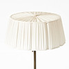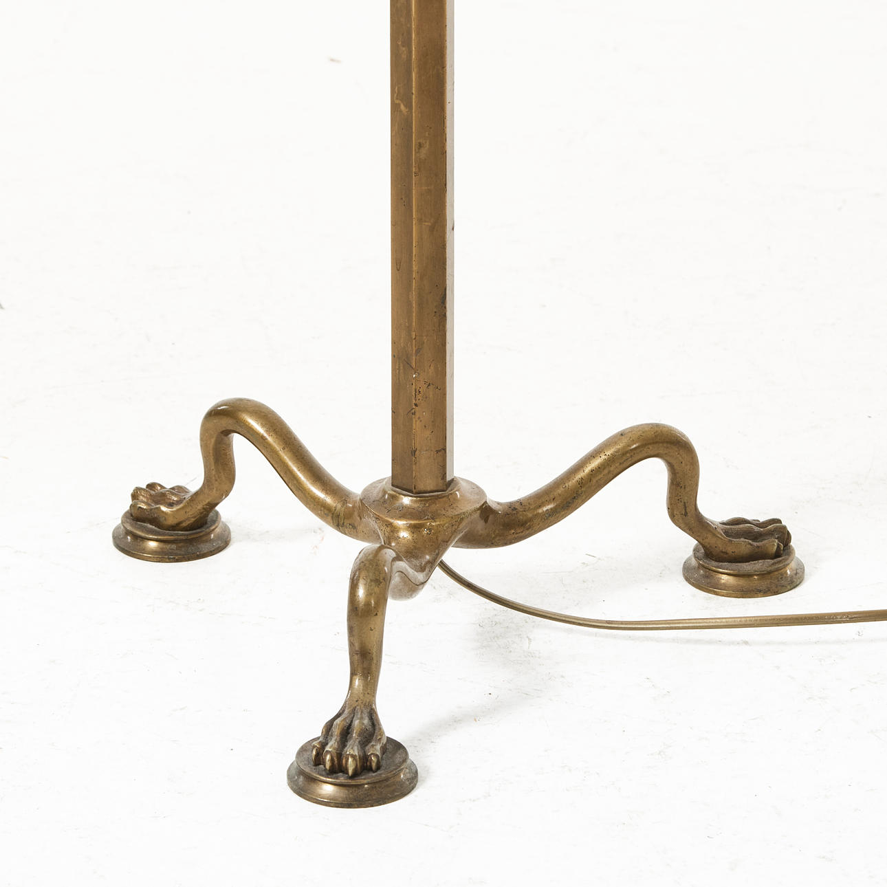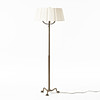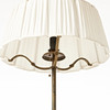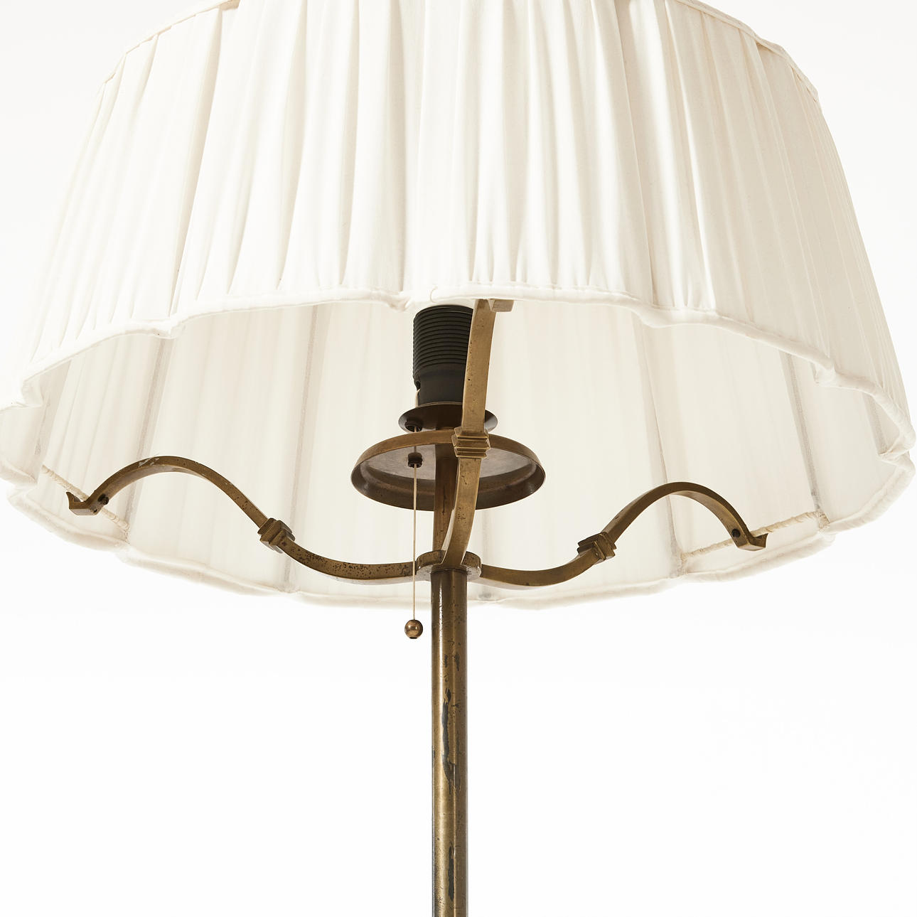 Mässing, tripodfot, skärm i vit textil, höjd ca 143, skärmens diameter 50 cm.