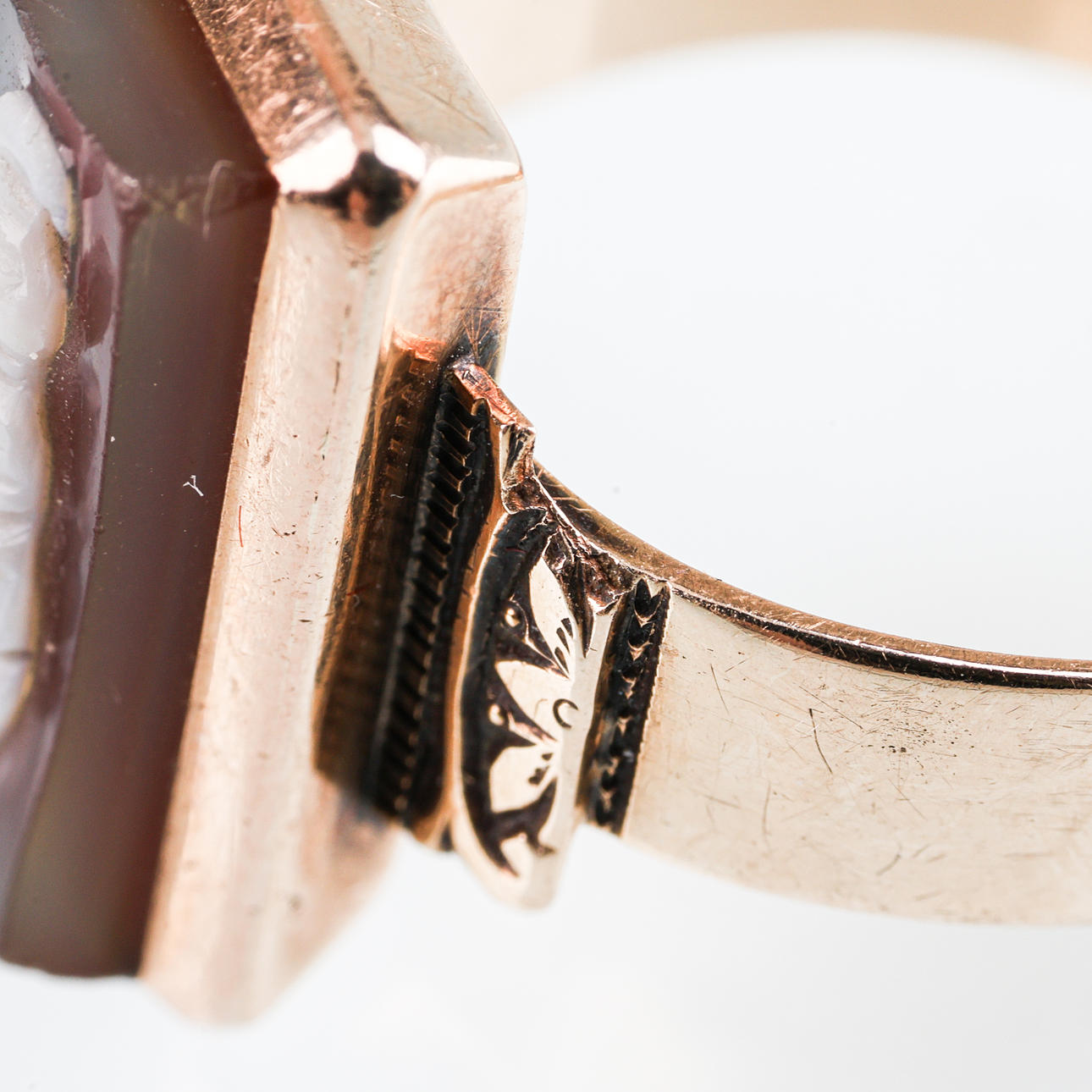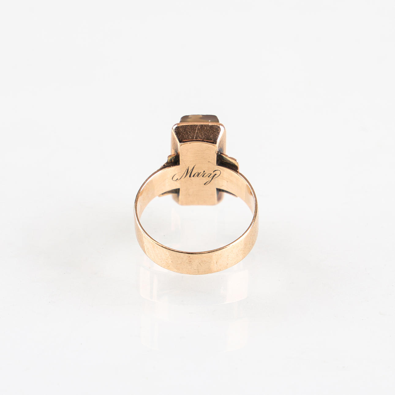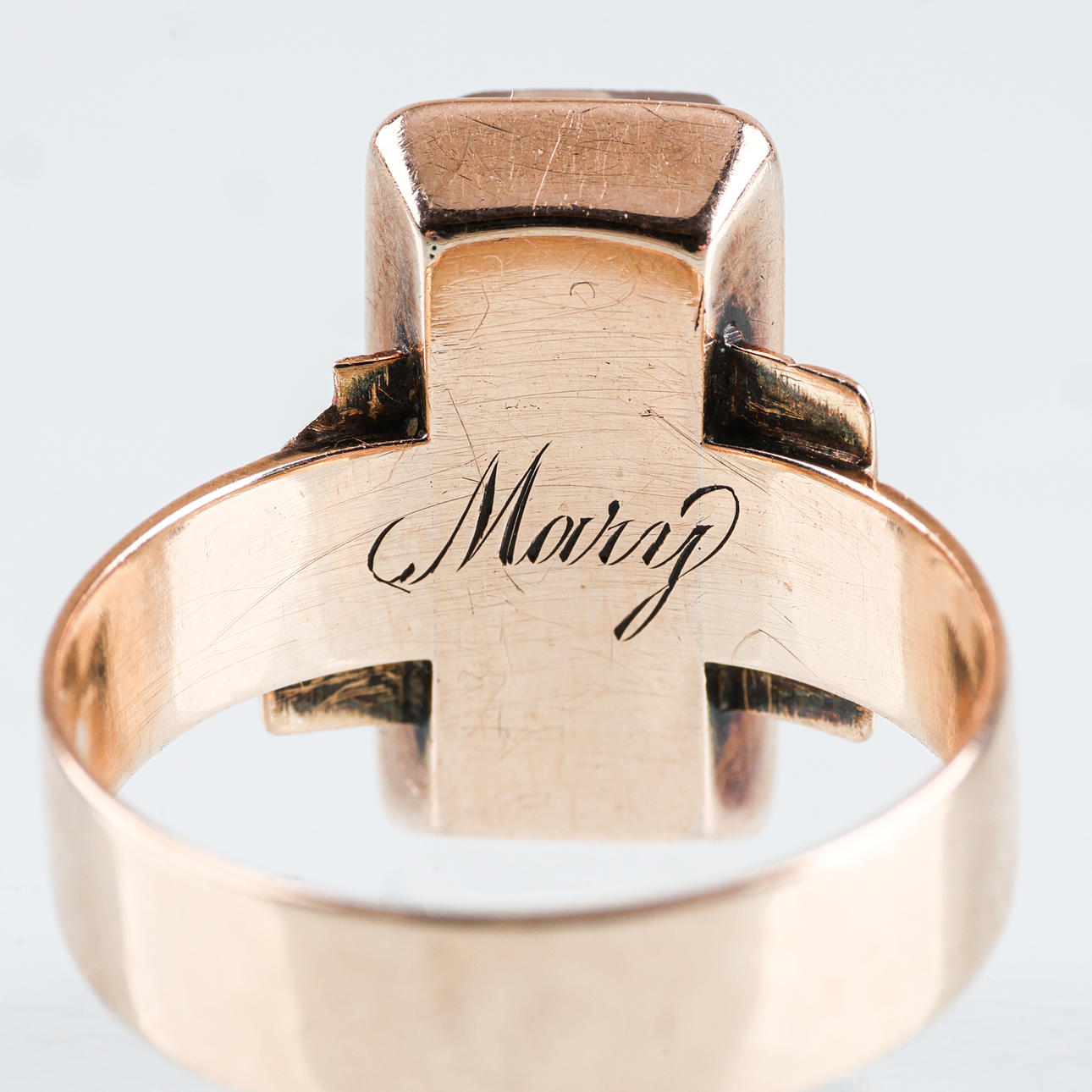 Bruks- och åldersrelaterat slitage. Graverat namn.