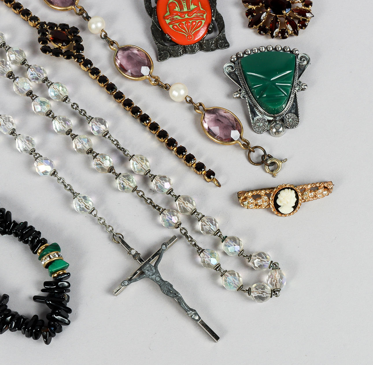 Diverse smycken i blandade material och oädla metaller.