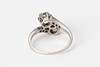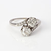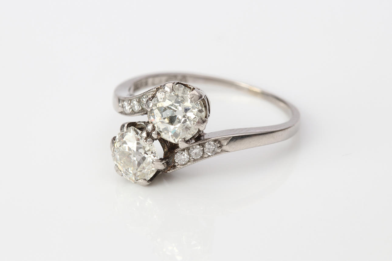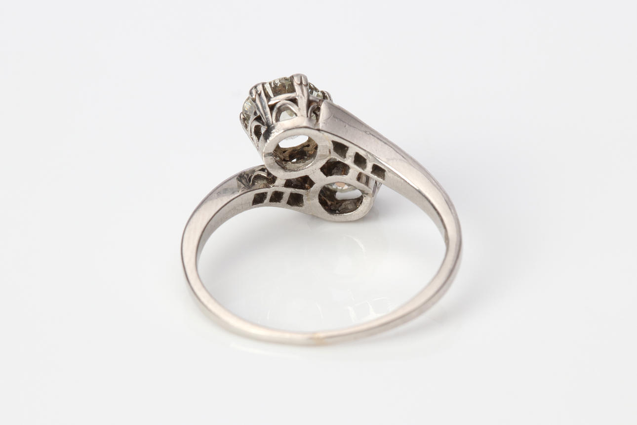 Ring i platina med briljantslipade (gammalslipade) diamanter ca 0,65 ct + 0,65 ct + 0,06 ct, slt. ca 17 mm, totalvikt 4,1 g.