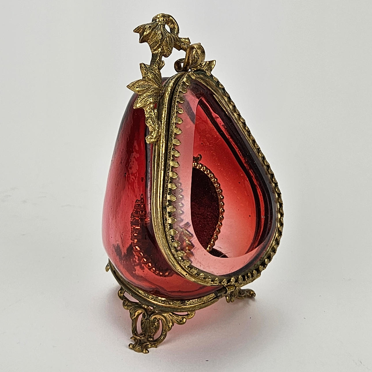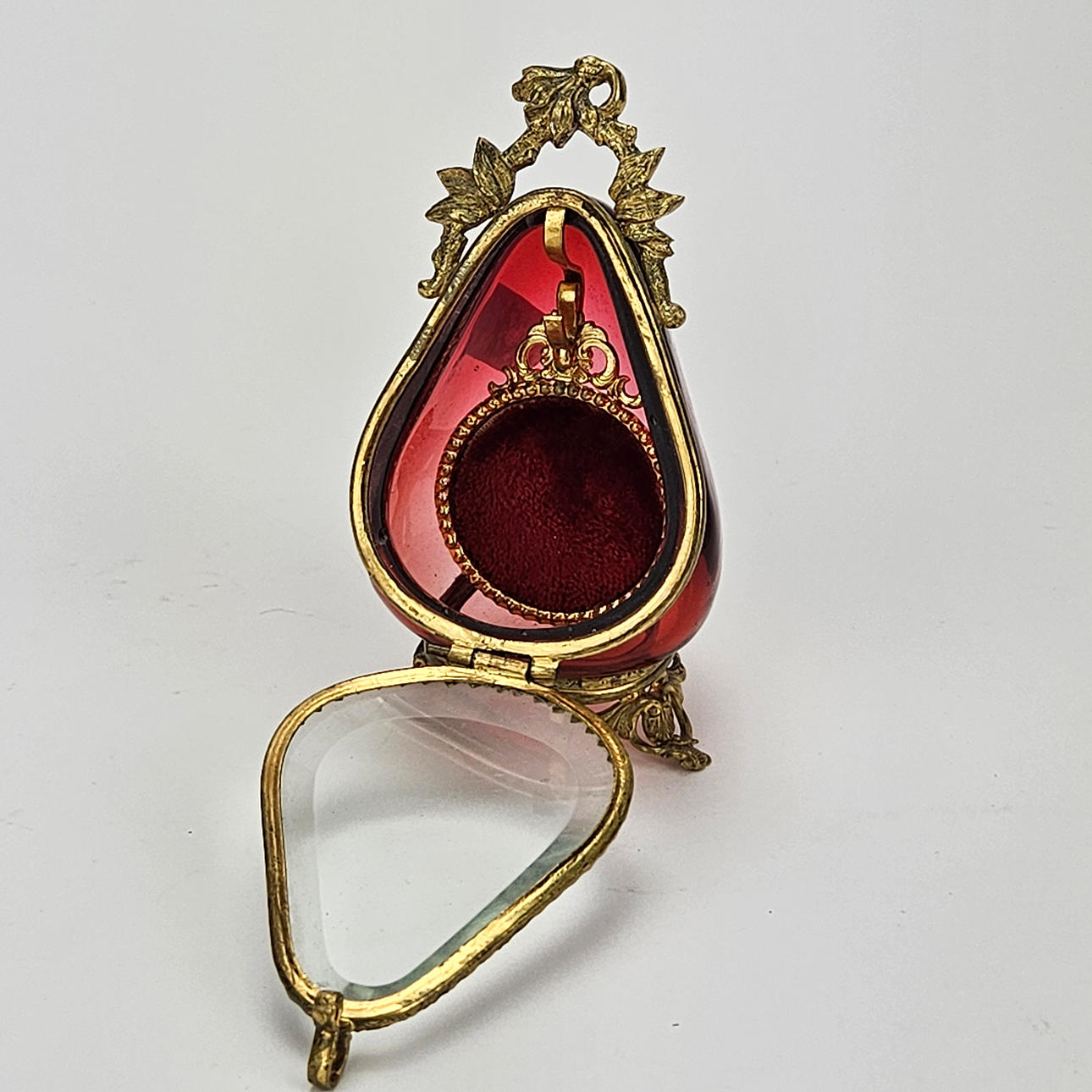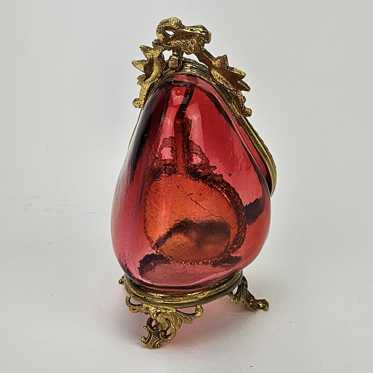 Ställ, höjd ca. 11 cm. Klockkedja, gulmetall, hjärta med konstgjord pärla, längd ca. 67 cm. Mormorsur, ca. 32 mm.
