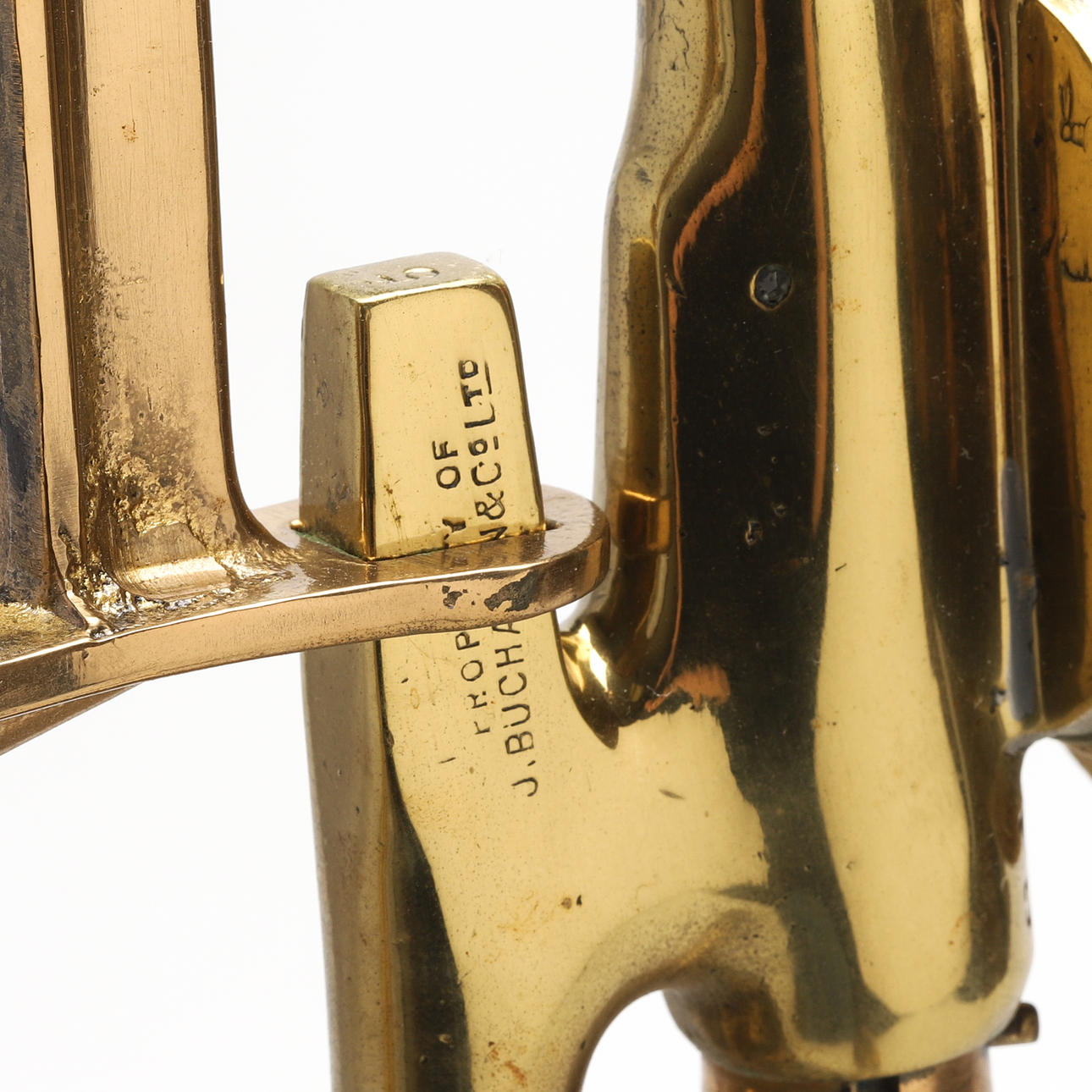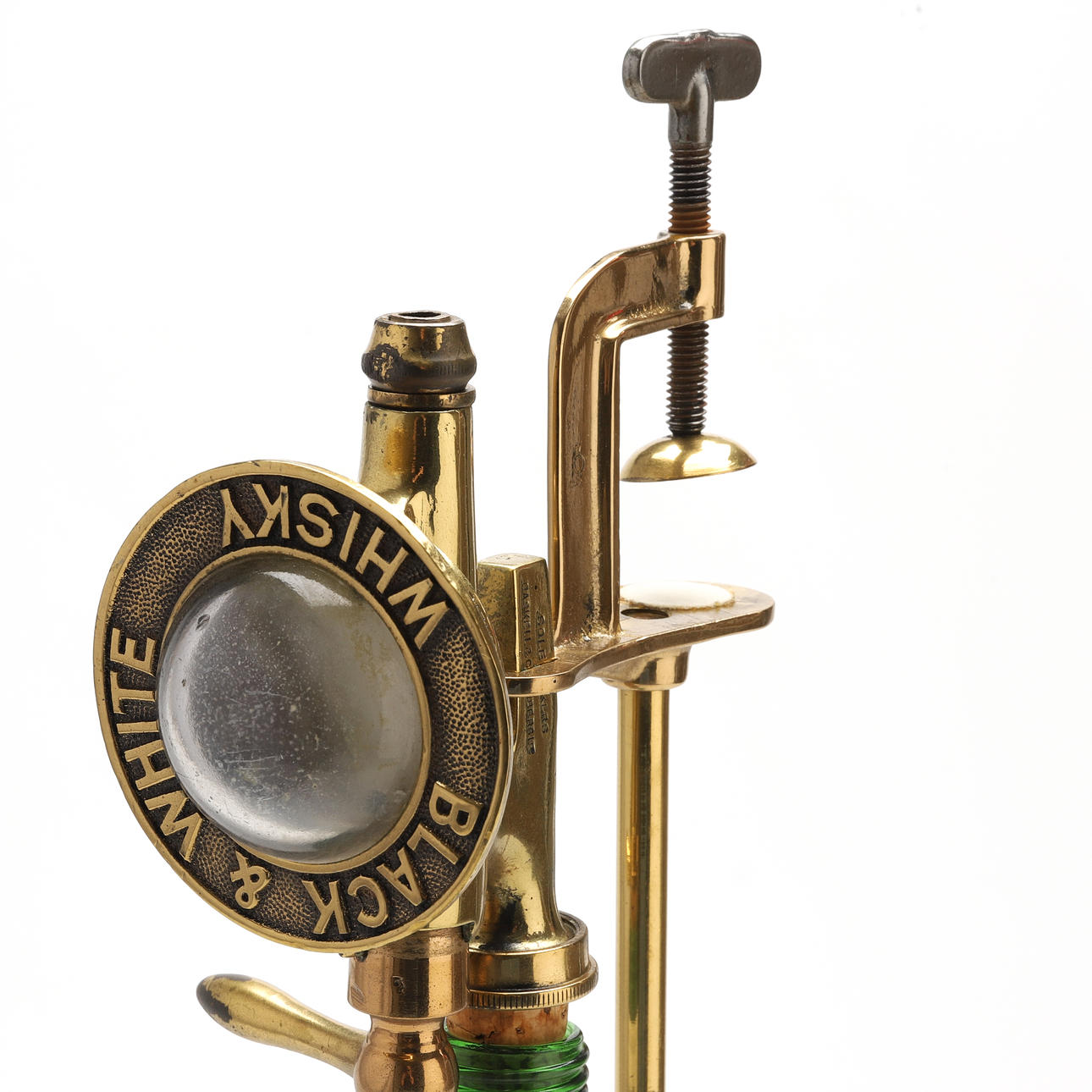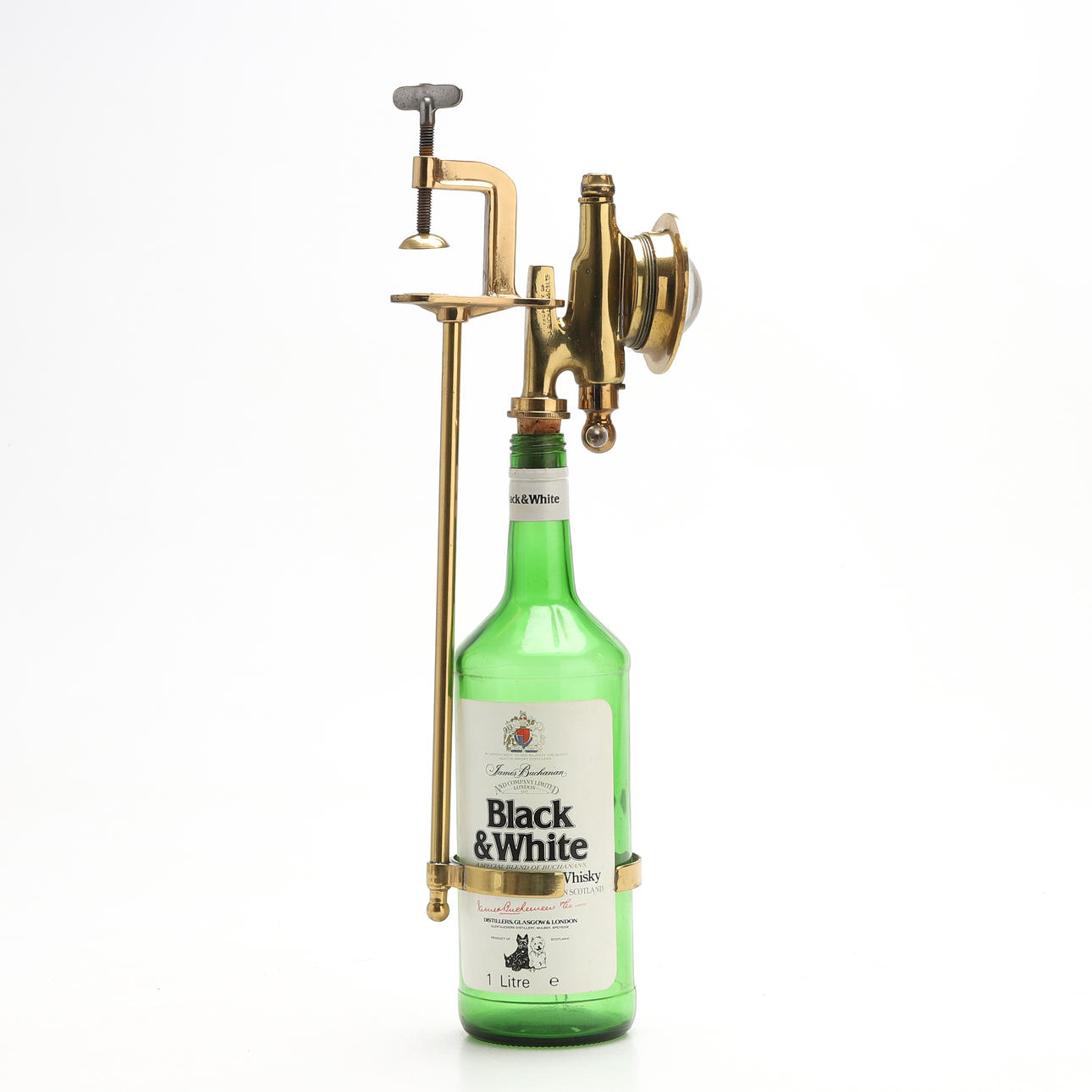 WHISKY BLACK & WHITE, märkt BASKELL & CHAMBERS SOLE MAKERS, mässing, tap för flaskor. 1900-talets mitt.