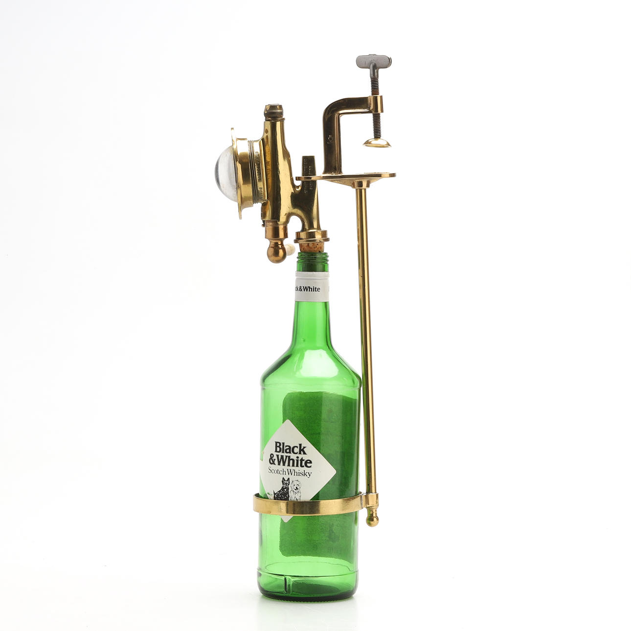 4958881. WHISKY BLACK & WHITE, märkt BASKELL & CHAMBERS SOLE MAKERS, mässing, tap för flaskor. 1900-talets mitt.