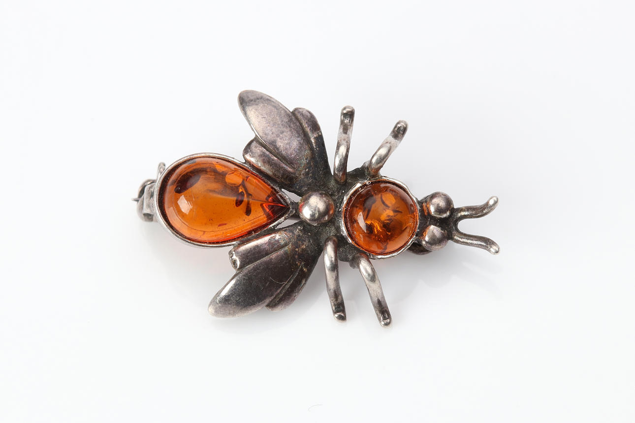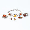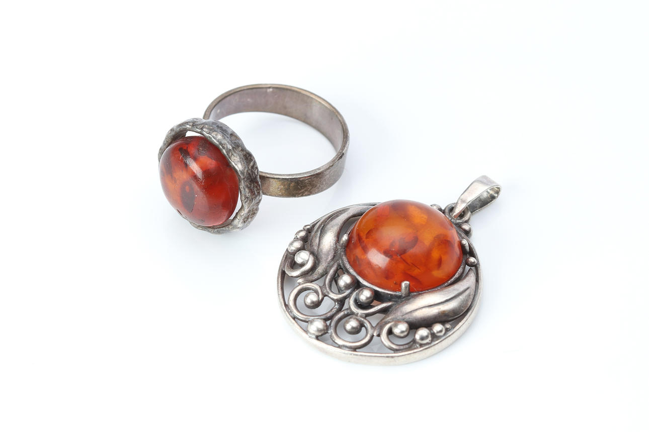 Smycken av silver med bärnsten. Armbandet innehåller bärnstens imitationer.