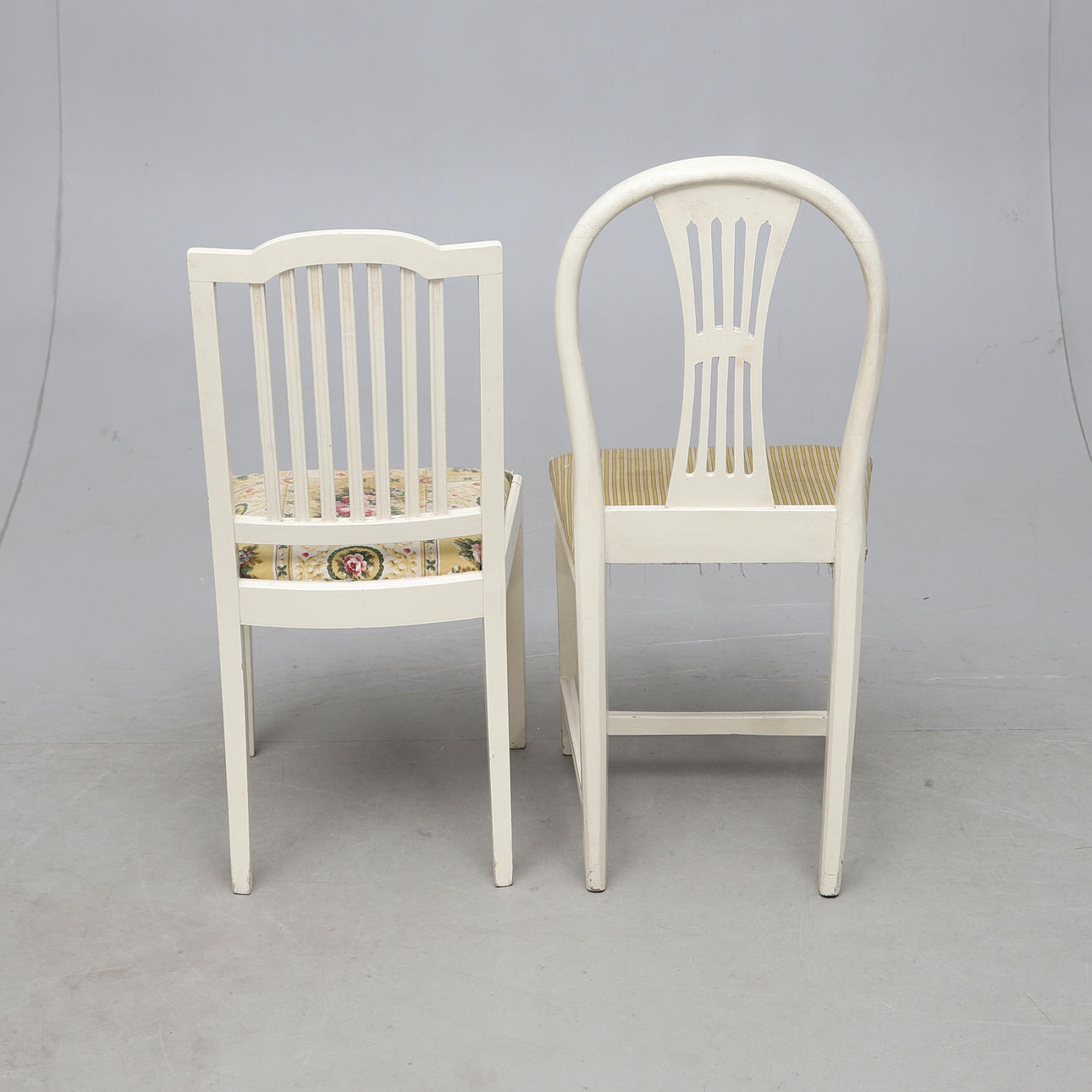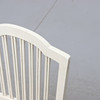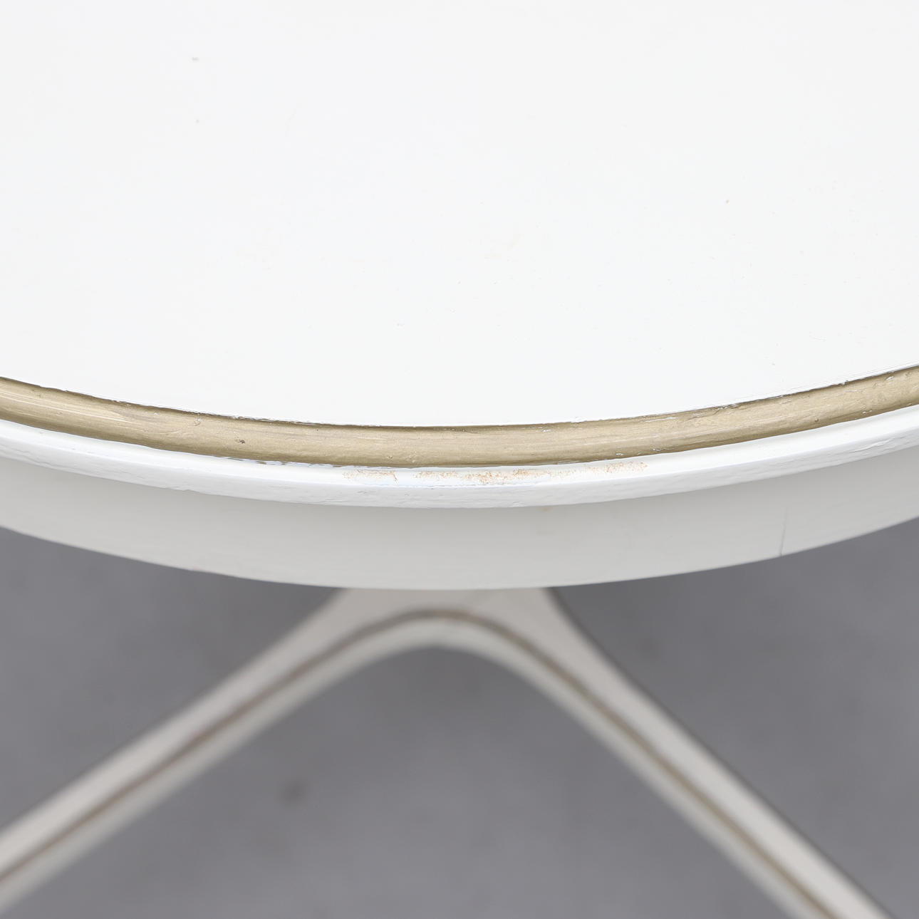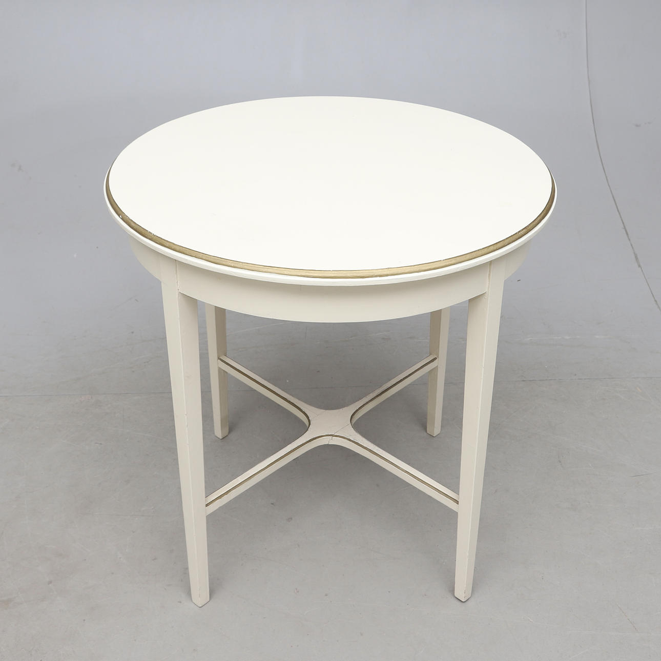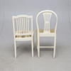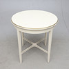 Vitmålat med bronserade detaljer. Olika stolsmodeller, höjd ca 89-97 cm. Lös stoppad sits. Bordets diameter ca 75, höjd 76 cm.