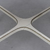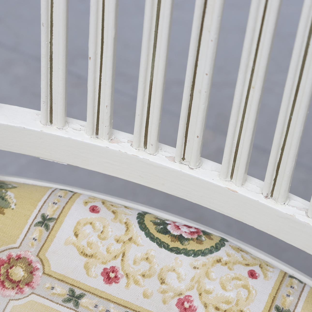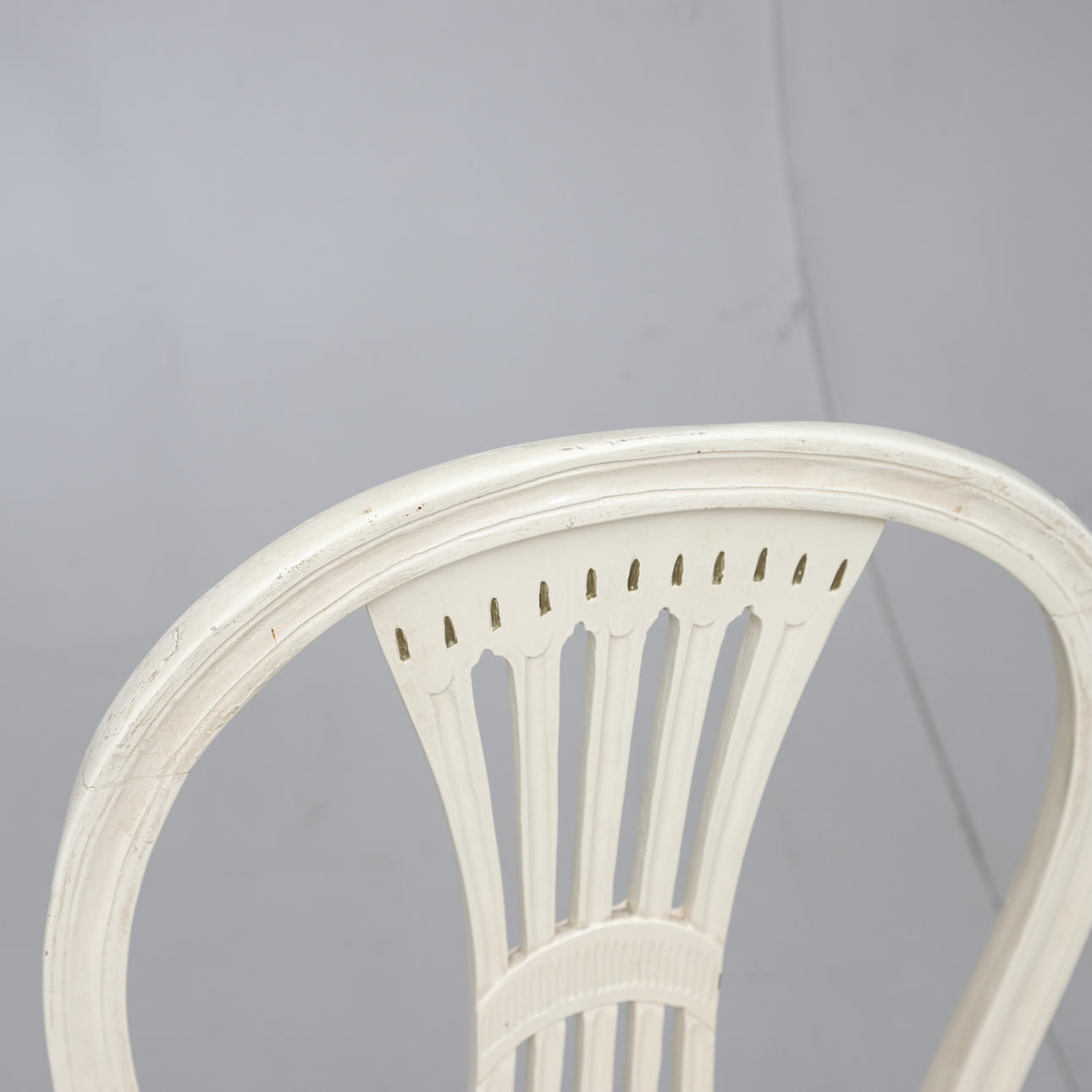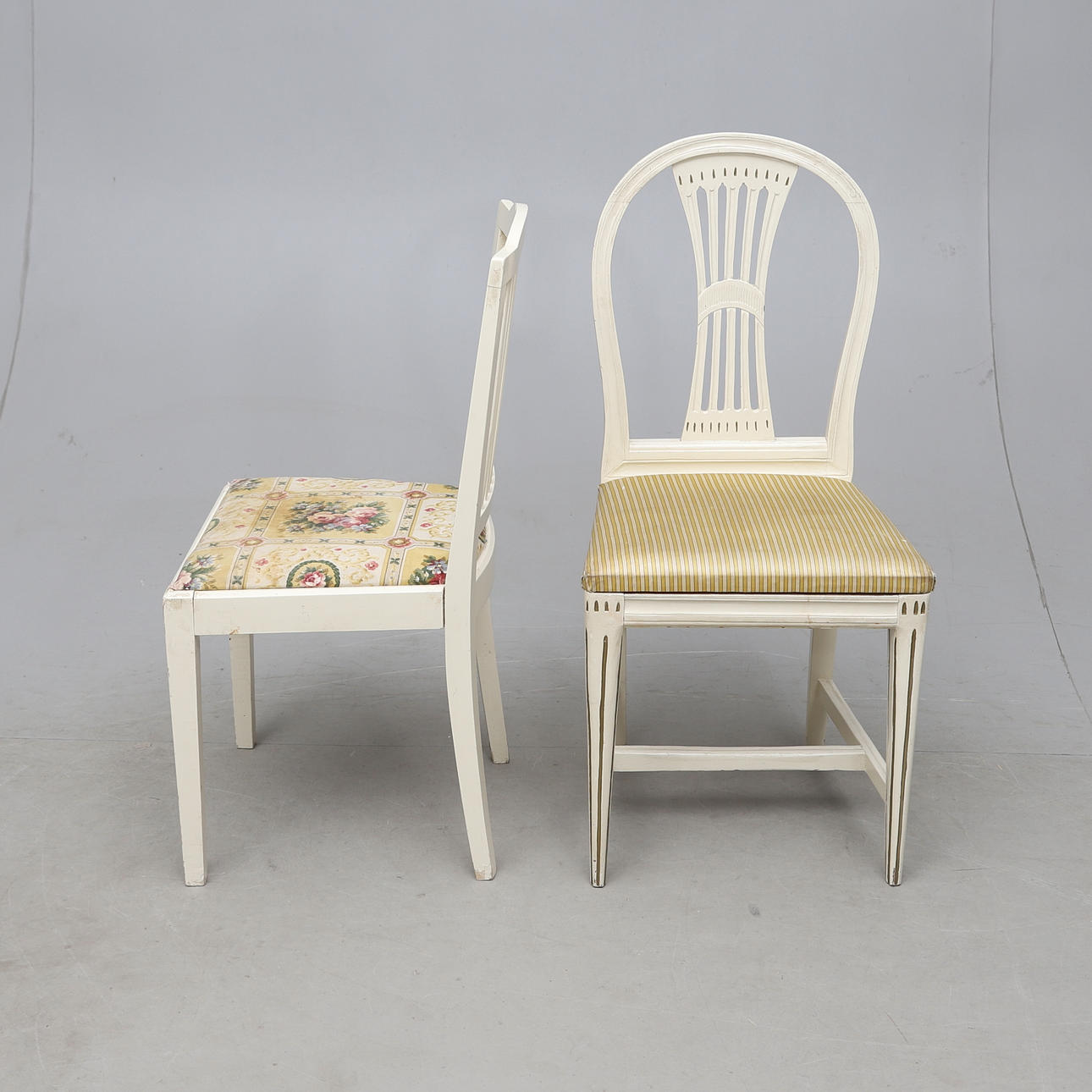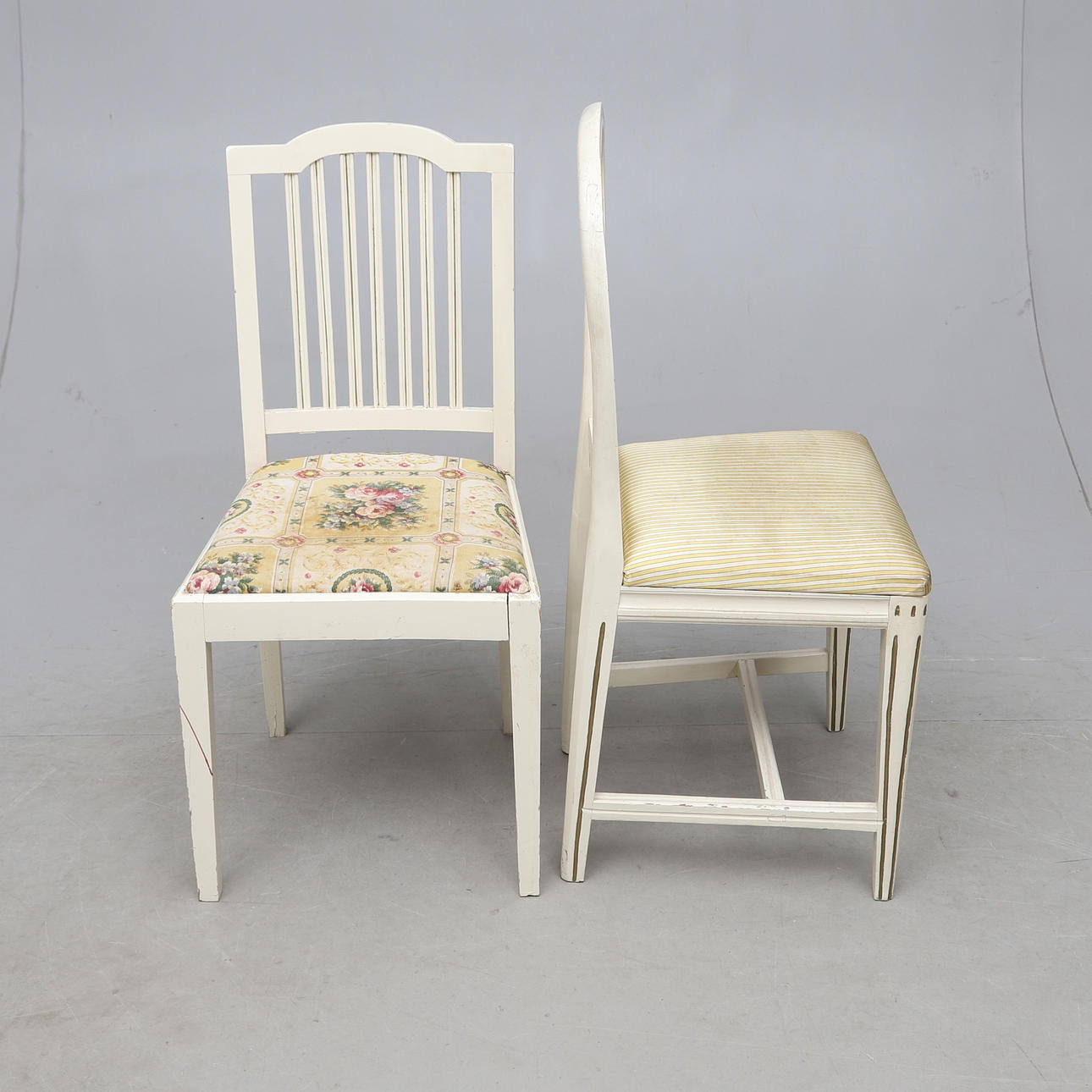 Vitmålat med bronserade detaljer. Olika stolsmodeller, höjd ca 89-97 cm. Lös stoppad sits. Bordets diameter ca 75, höjd 76 cm.
