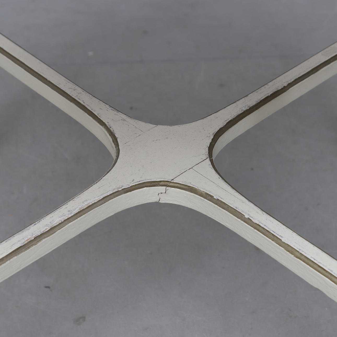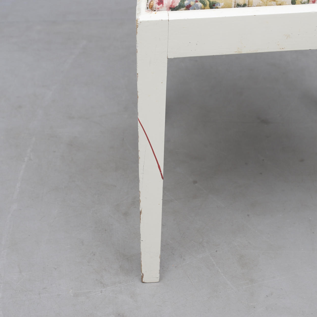 Bruks- och åldersrelaterat slitage. Senare målade. Torrsprickor. Färgbortfall. Lös i fogar. Fläckar.