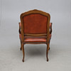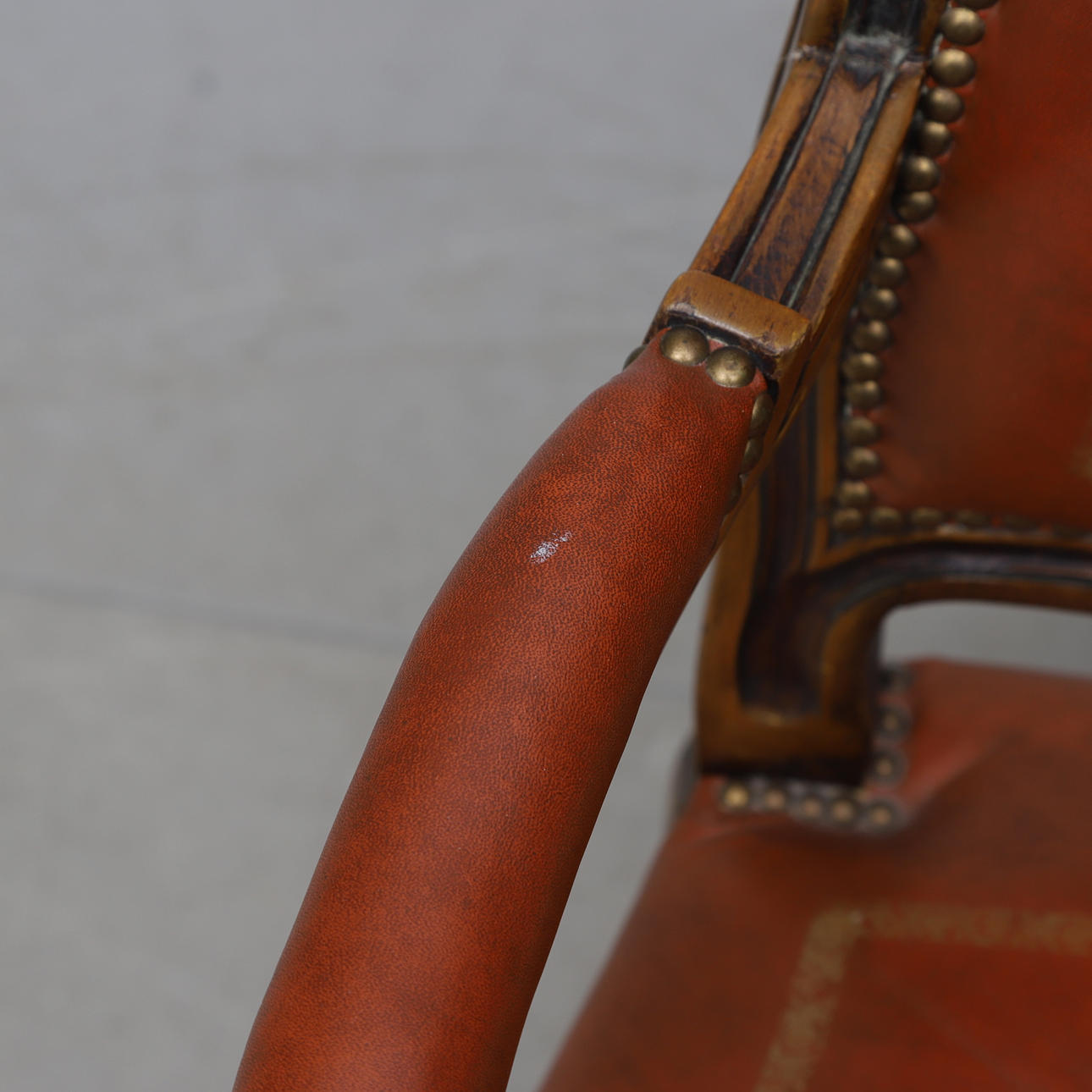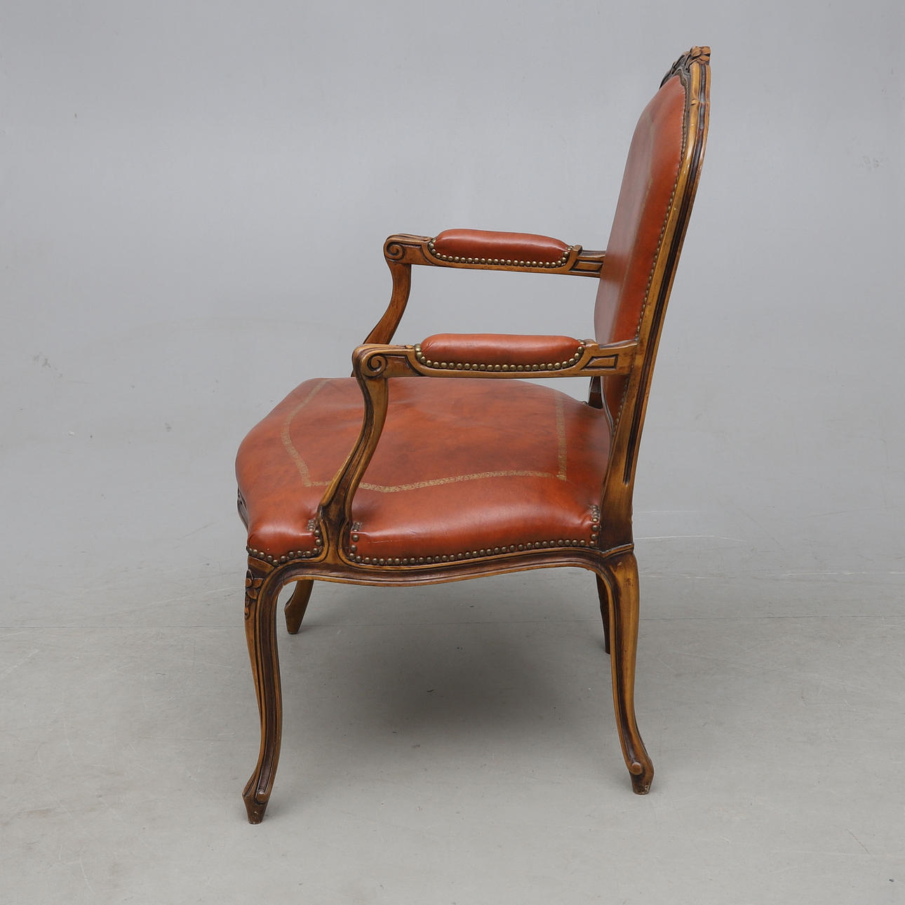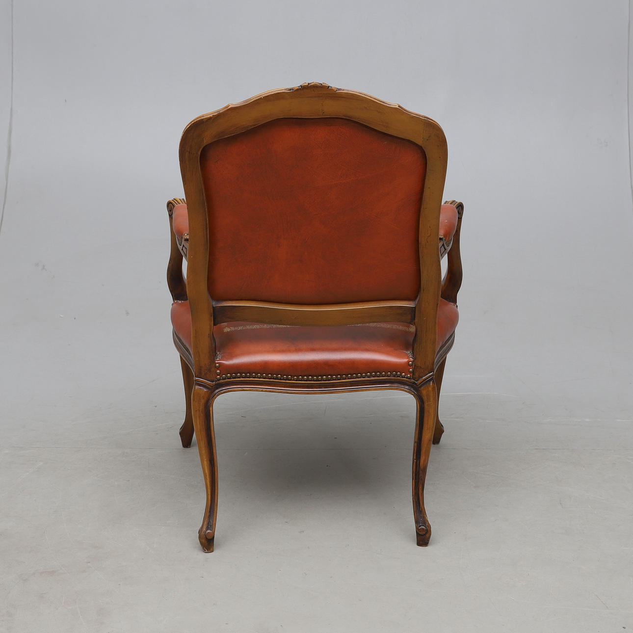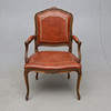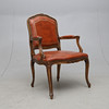 Skuren dekor. Fast stoppad rygg och sits. Klädd med konstskinn. Höjd ca 102, bredd 67 cm.