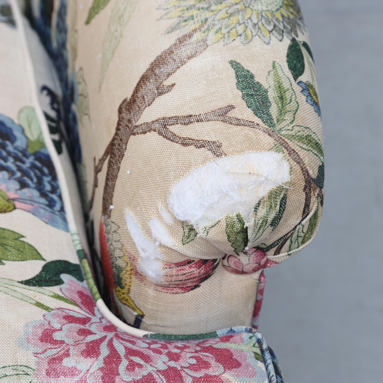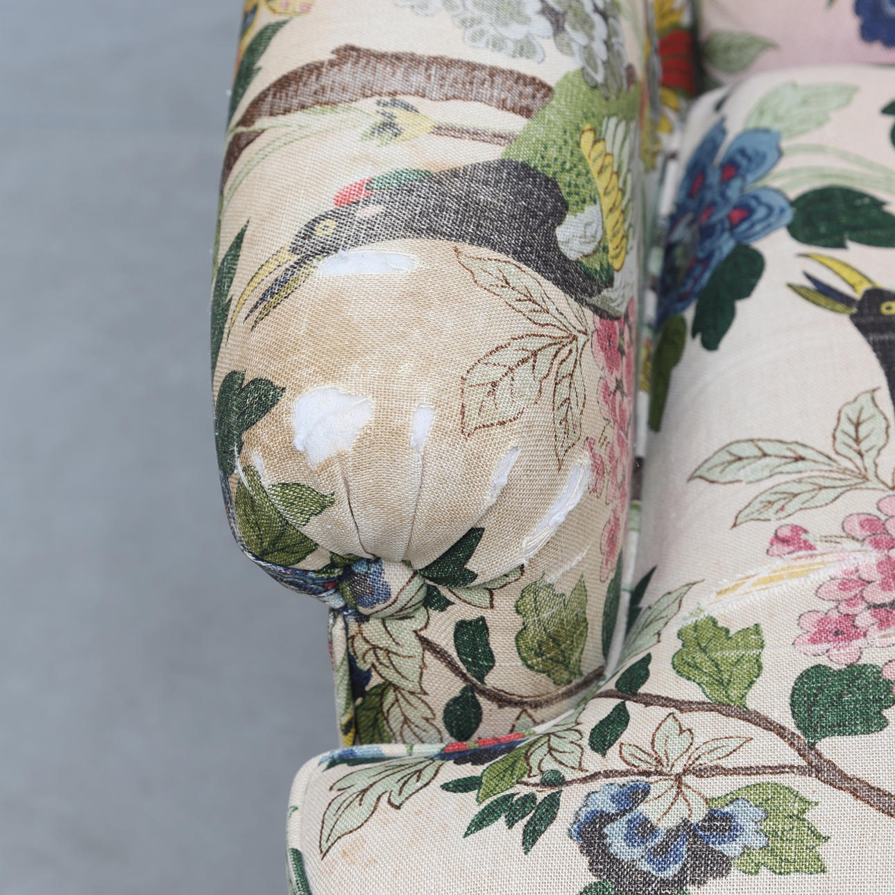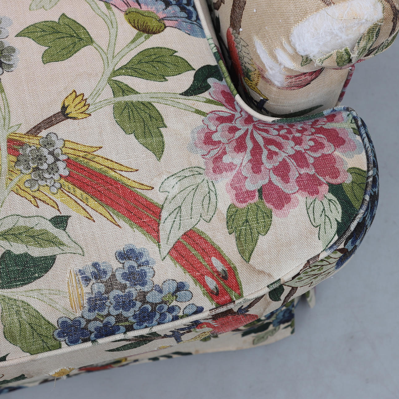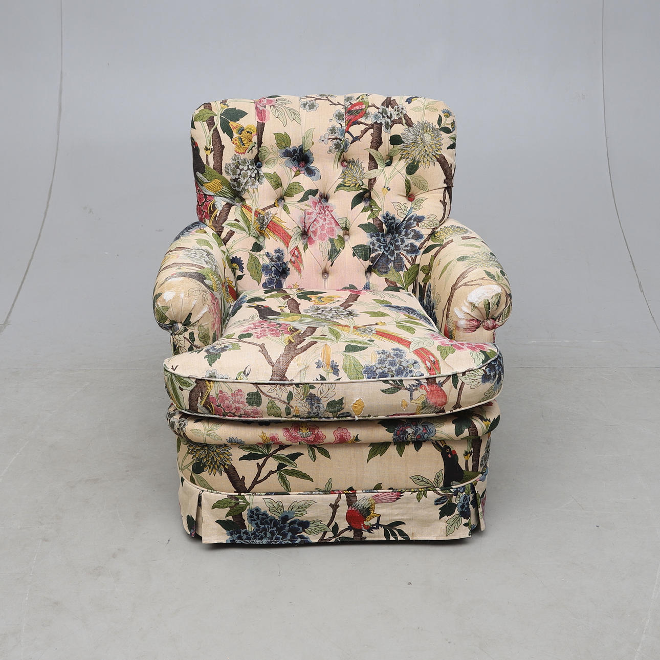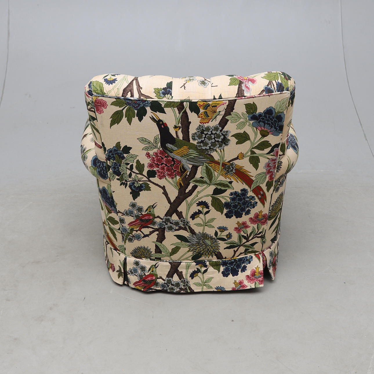 Fast stoppad rygg, lös plymå i sits. Höjd ca 82 cm.