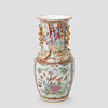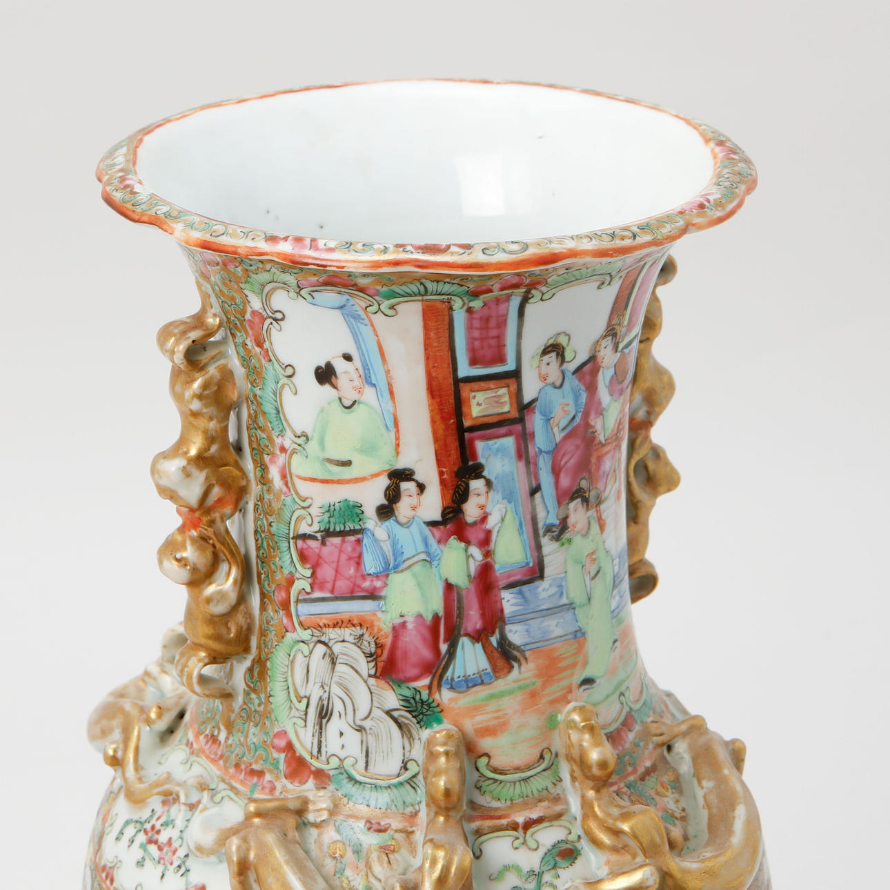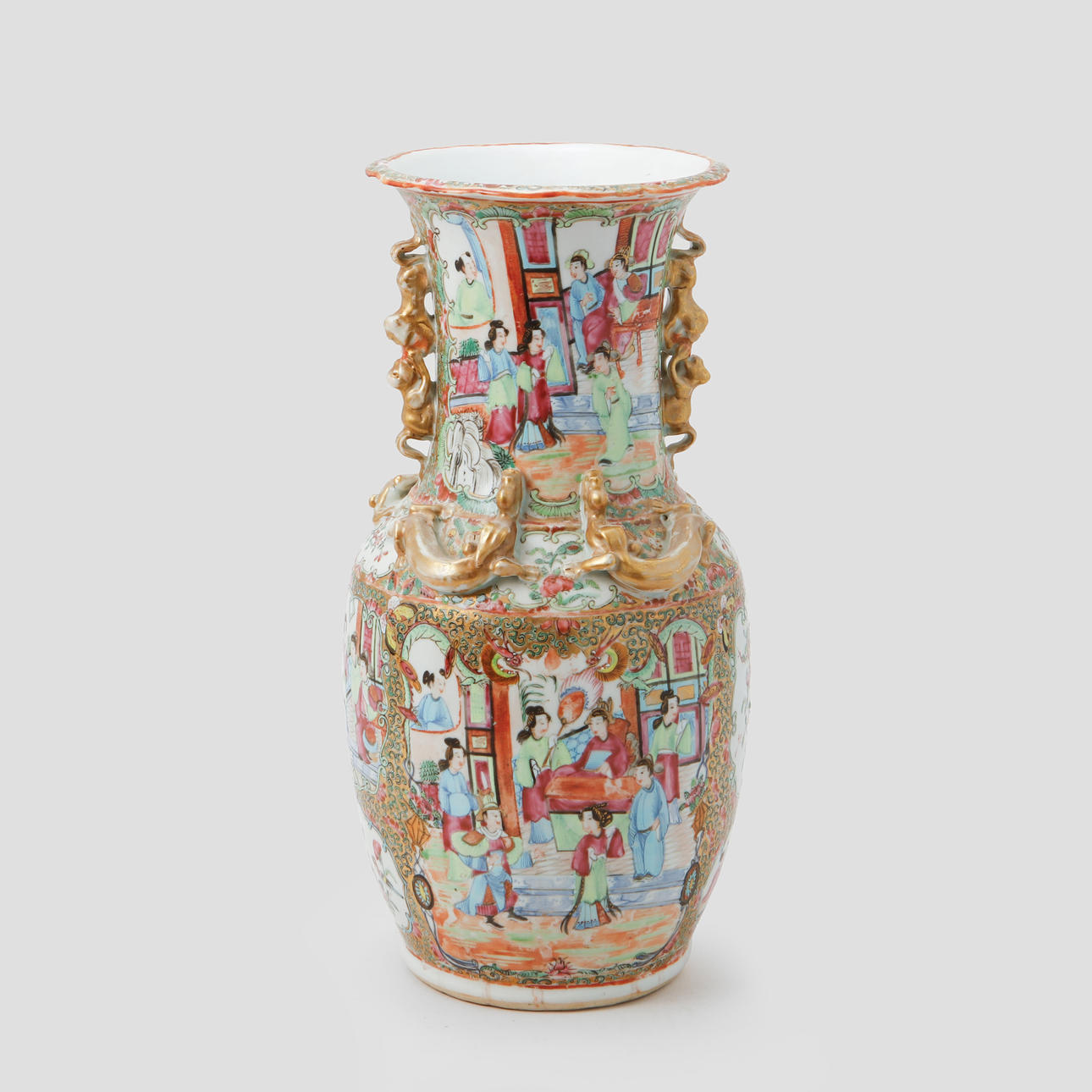 Dekor i emaljfärg av figurscener, samt förgylld dekor i relief. Höjd ca 36 cm.