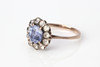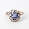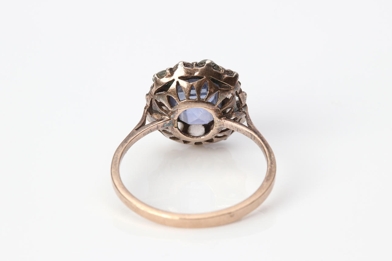Ring av lägre guldhalt med silver till överdel och fasetterade safirer. En violett safir ca 6,8 x 6,5 mm samt mindre färglösa safirer, stl. ca 16,75 mm, totalvikt 2,1 g.