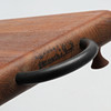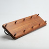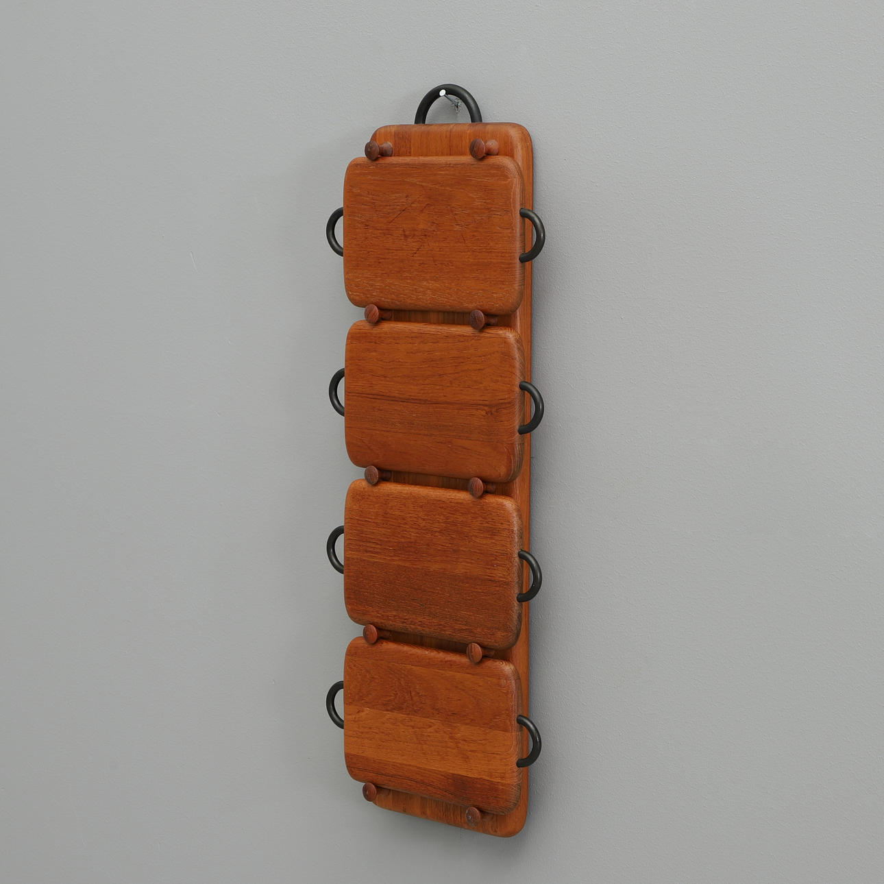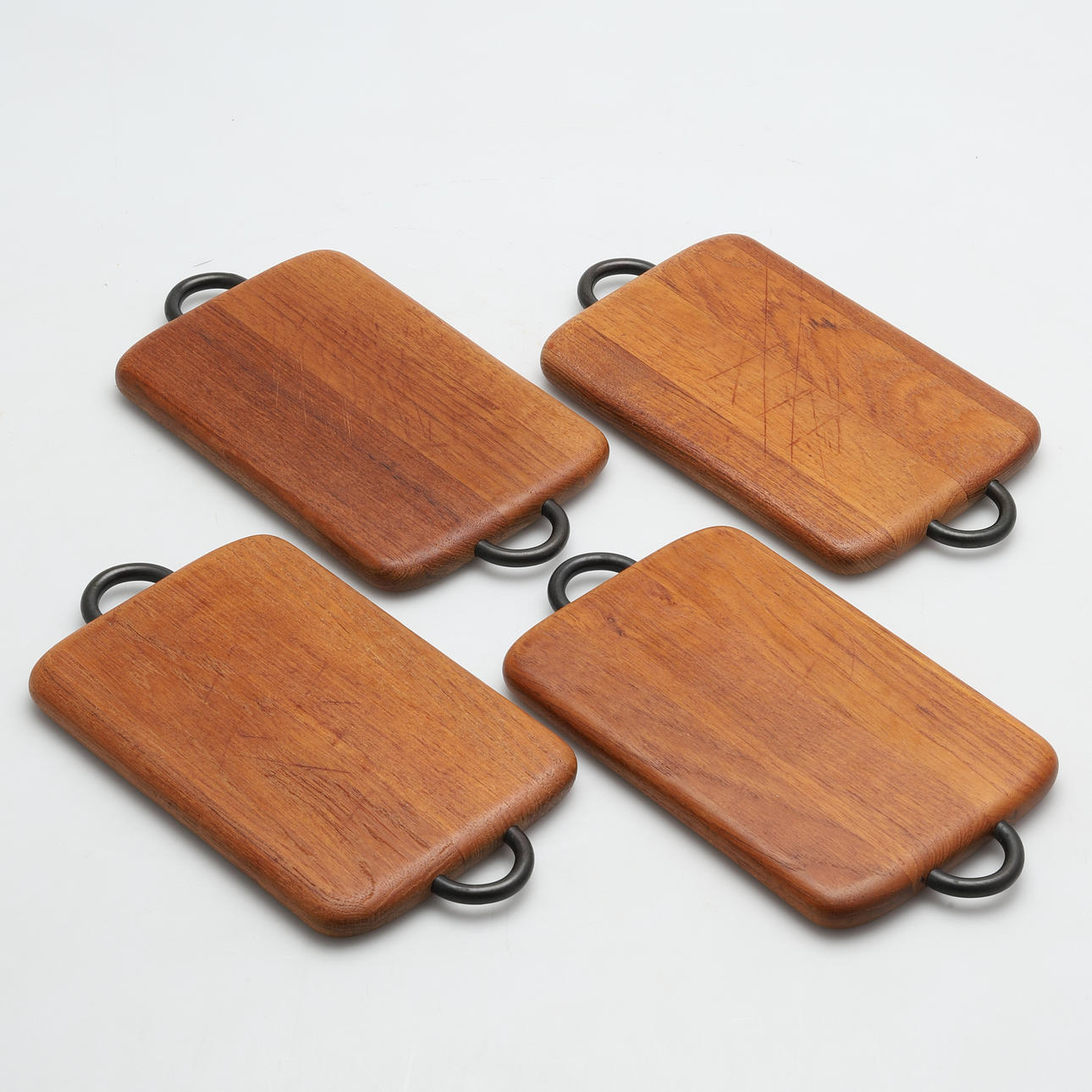 Teak och järn. Större bricka längd ca 68, bredd ca 19 cm. 4 st mindre brickor, längd 26, bredd 14 cm.