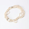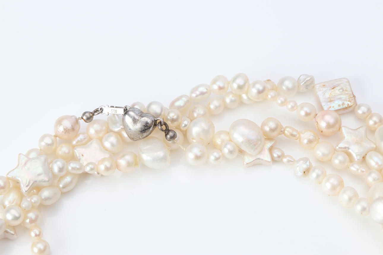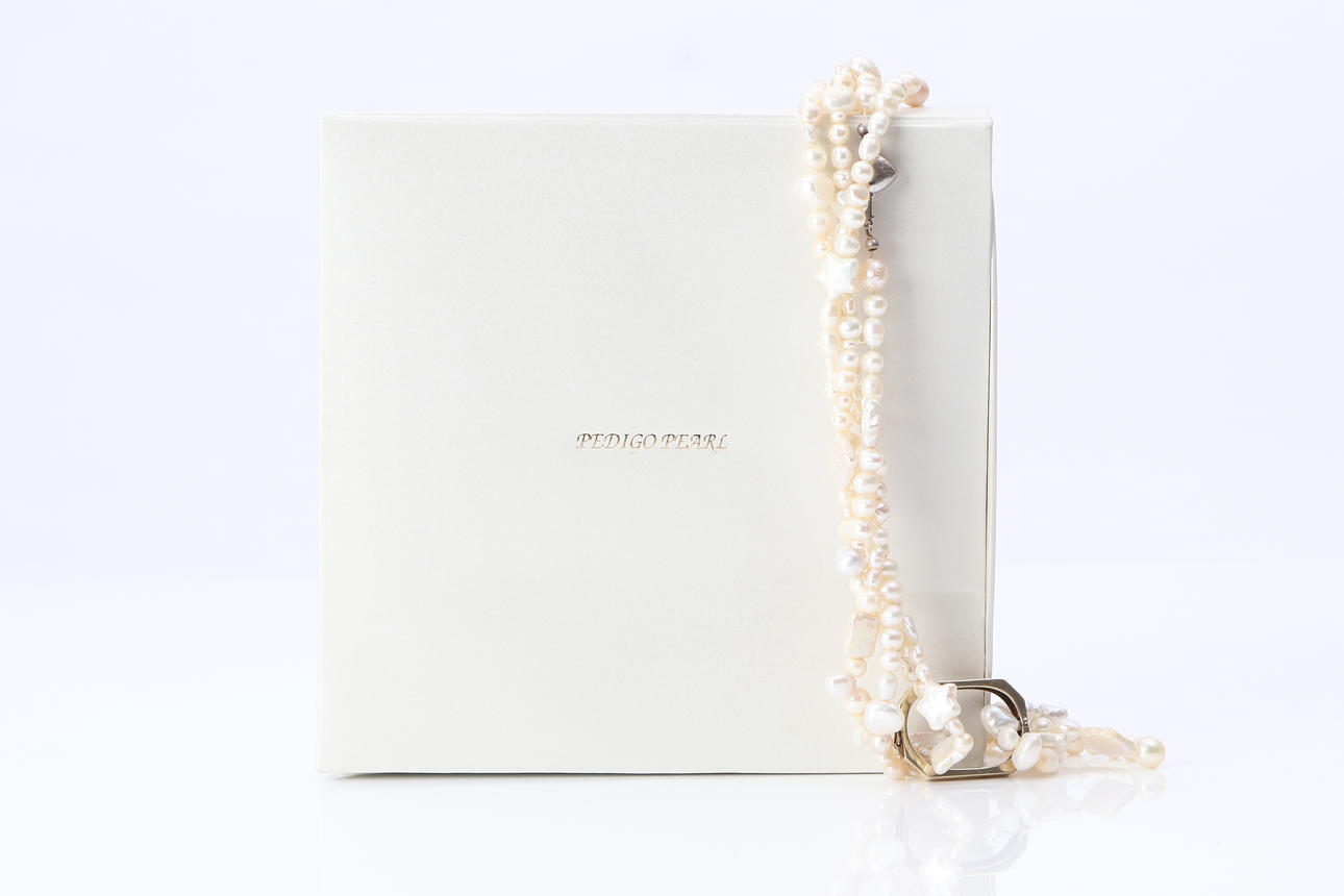 Sötvattenpärlor bland annat i form av kvadrater och stjärnor. Collierspänne i förgyllt silver samt etui medföljer.