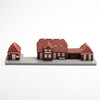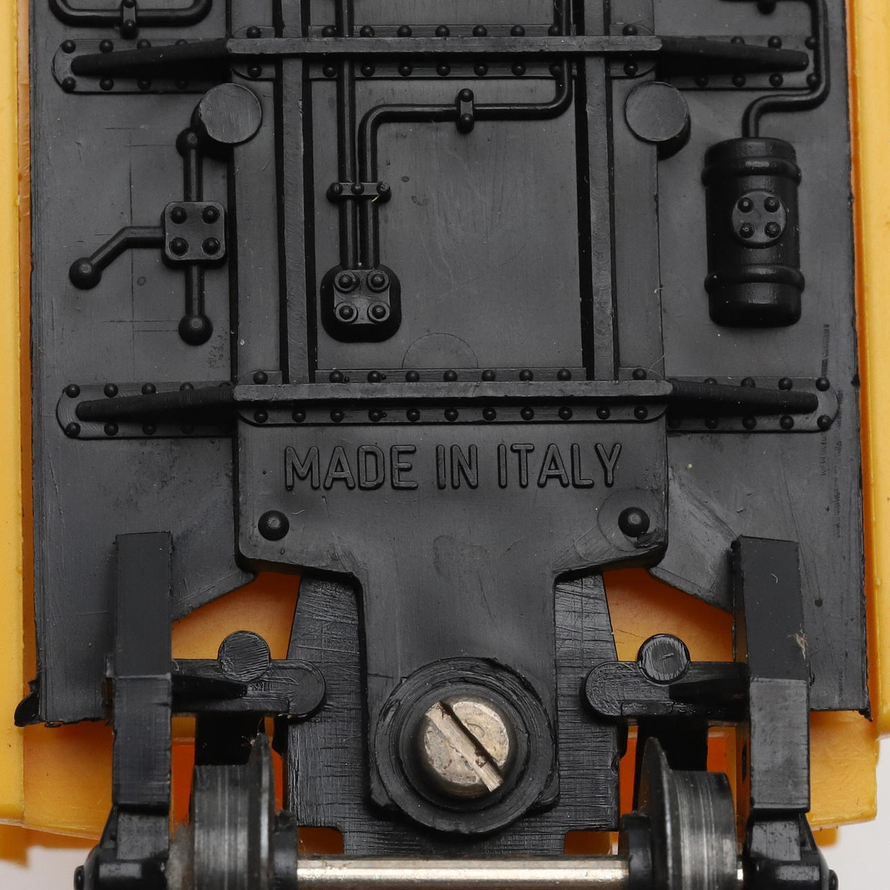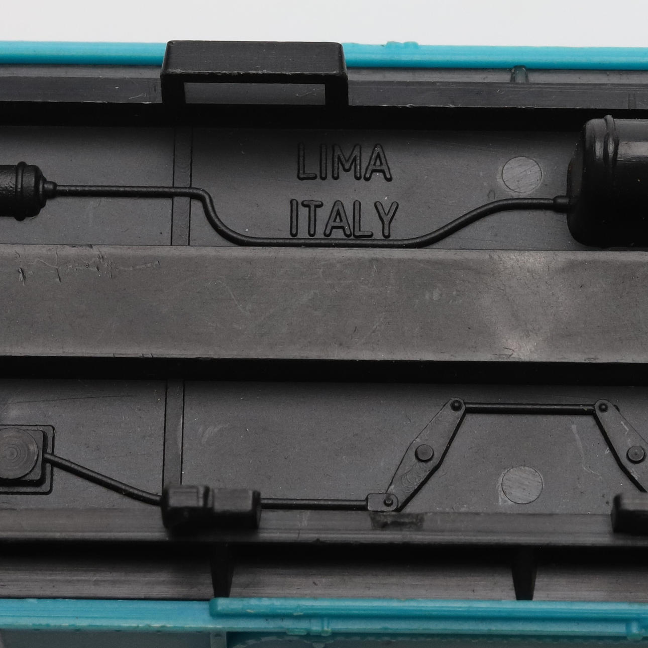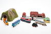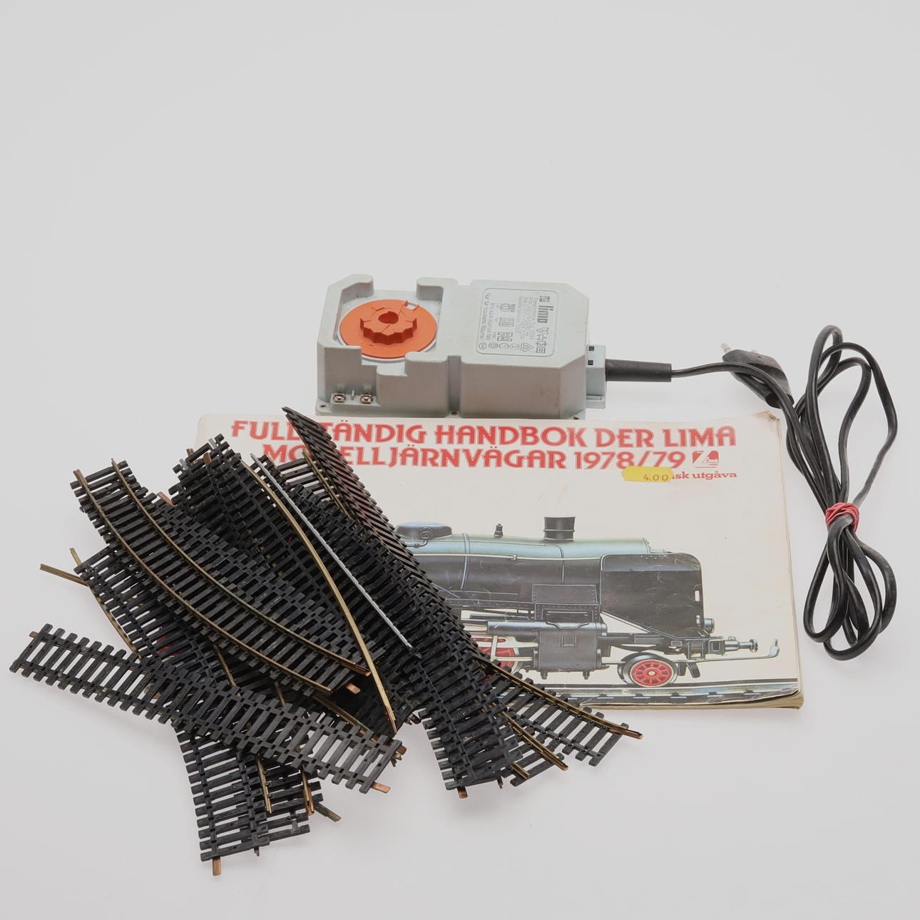 Ett parti räls, trafo, byggnader.