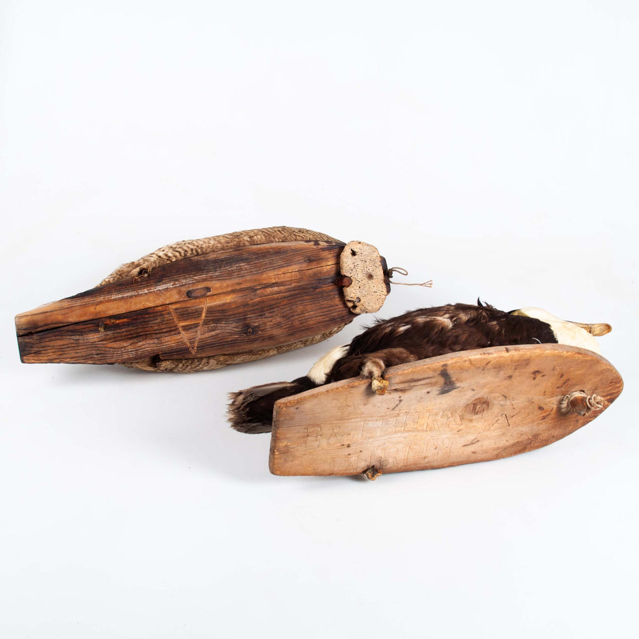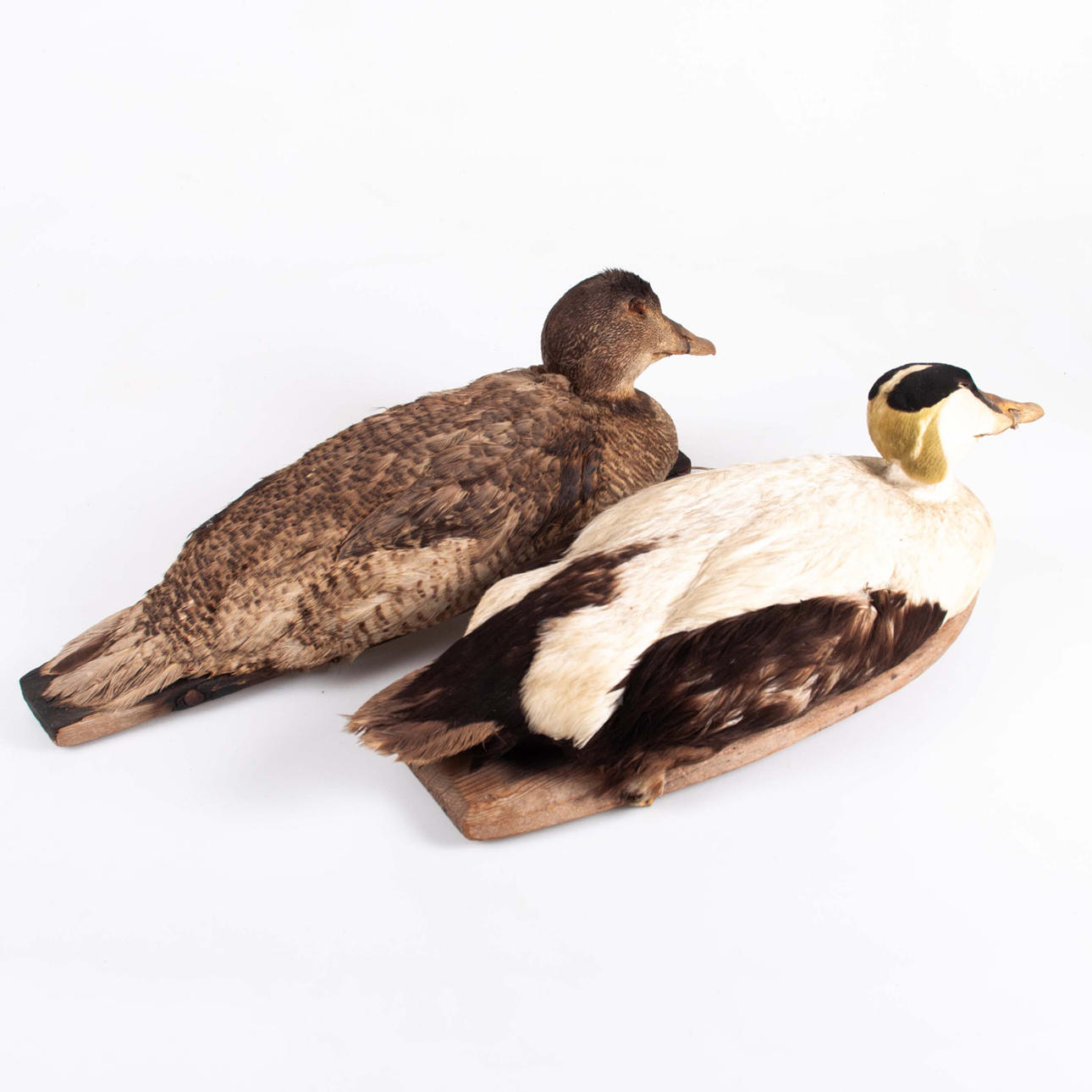 Hane och hona, uppstoppade och monterade på träplattor. Längd ca 45–54 cm.