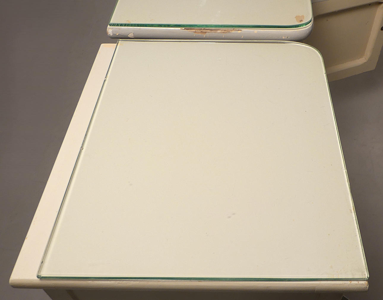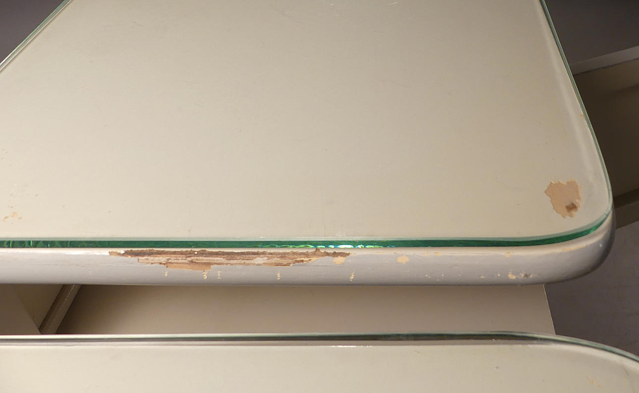 Slitage, färgskav, en glasskiva saknar ca 3 cm i djup.
