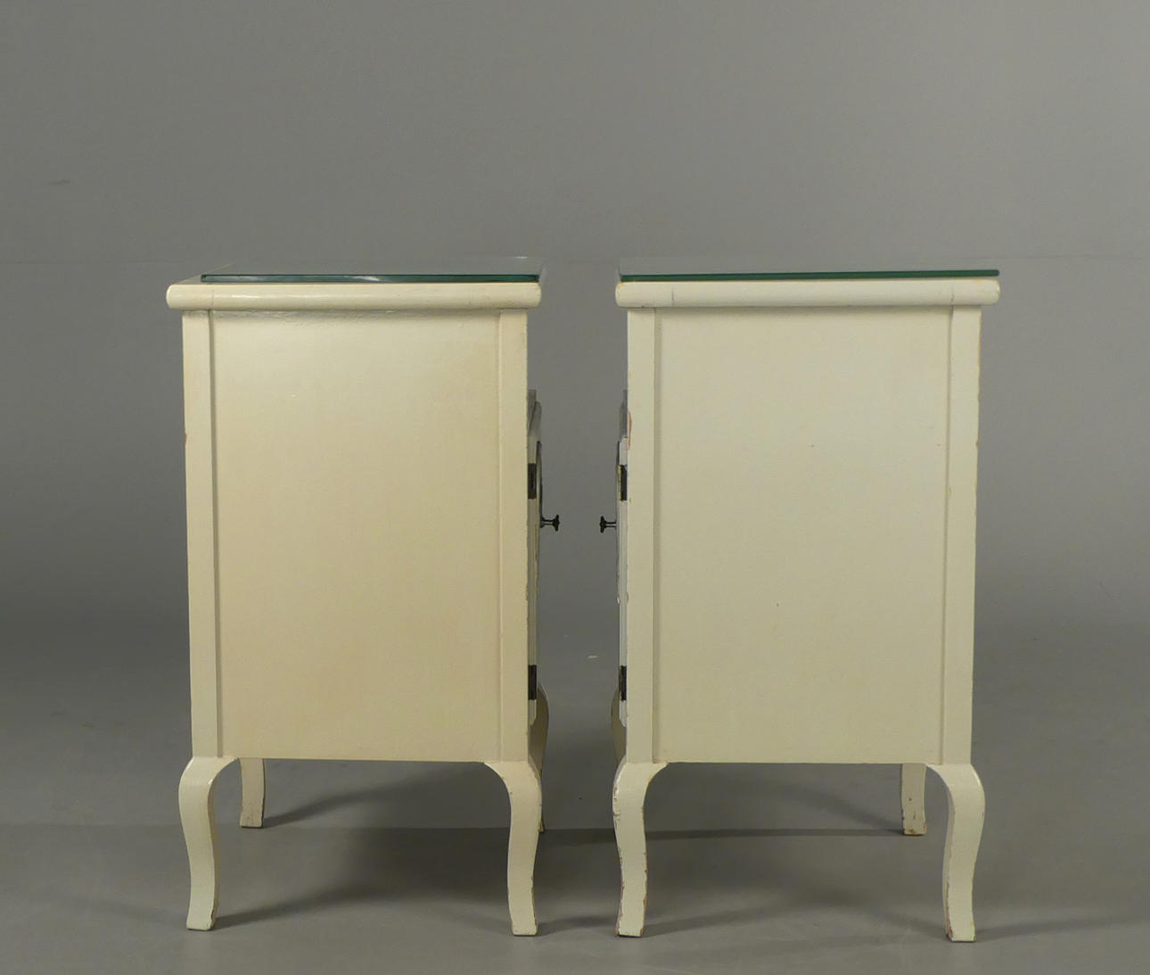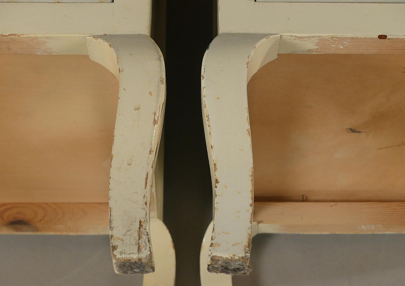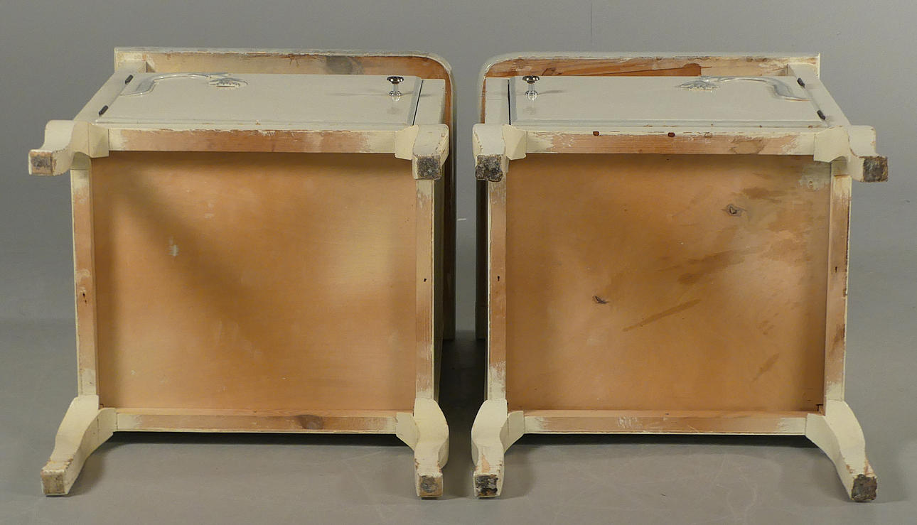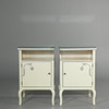 Vitmålade med blåmålad dekor. Lösa glasskivor på topp. Höjd 60 cm, bredd 38 cm, djup 33,5 cm.