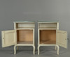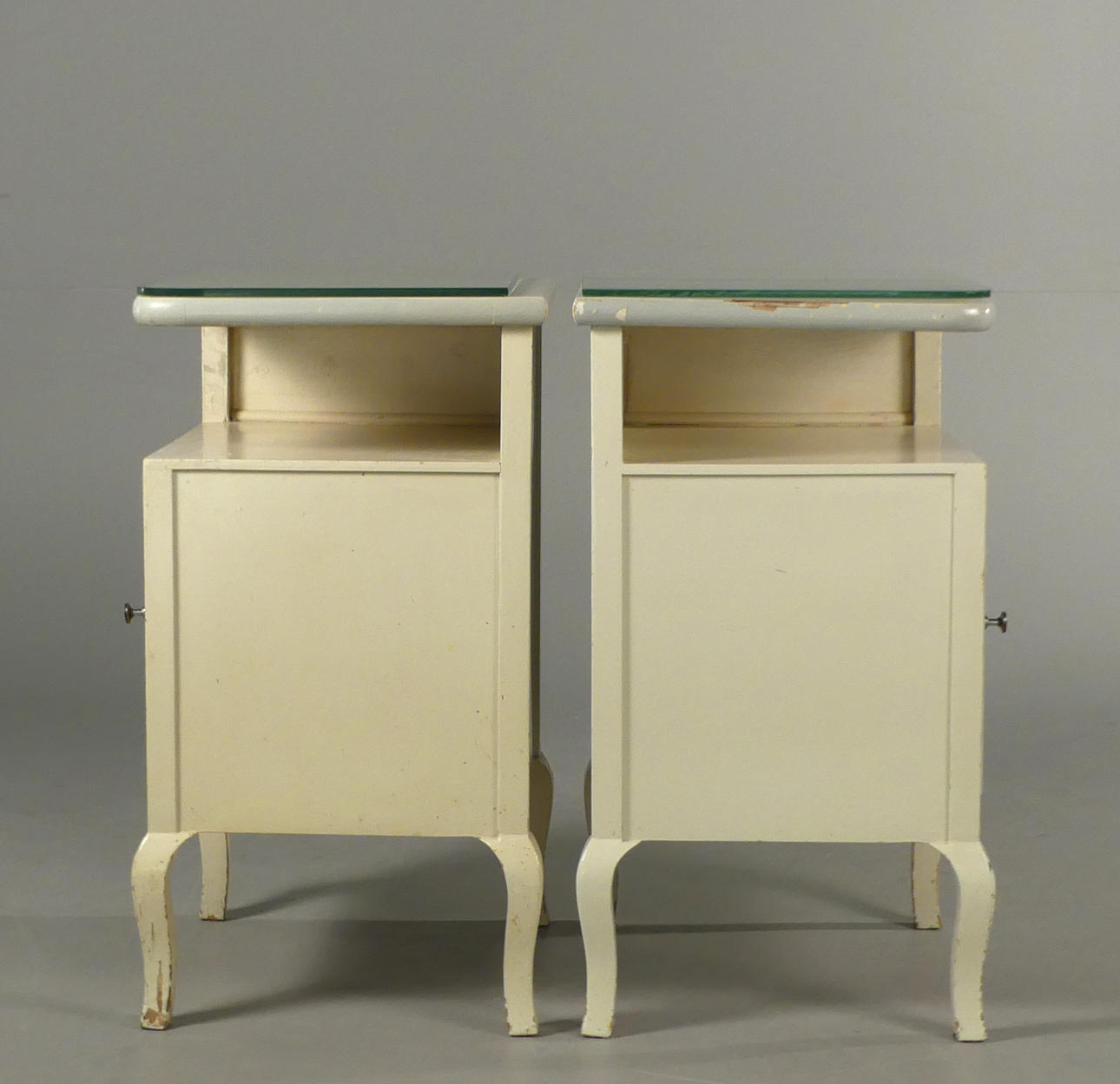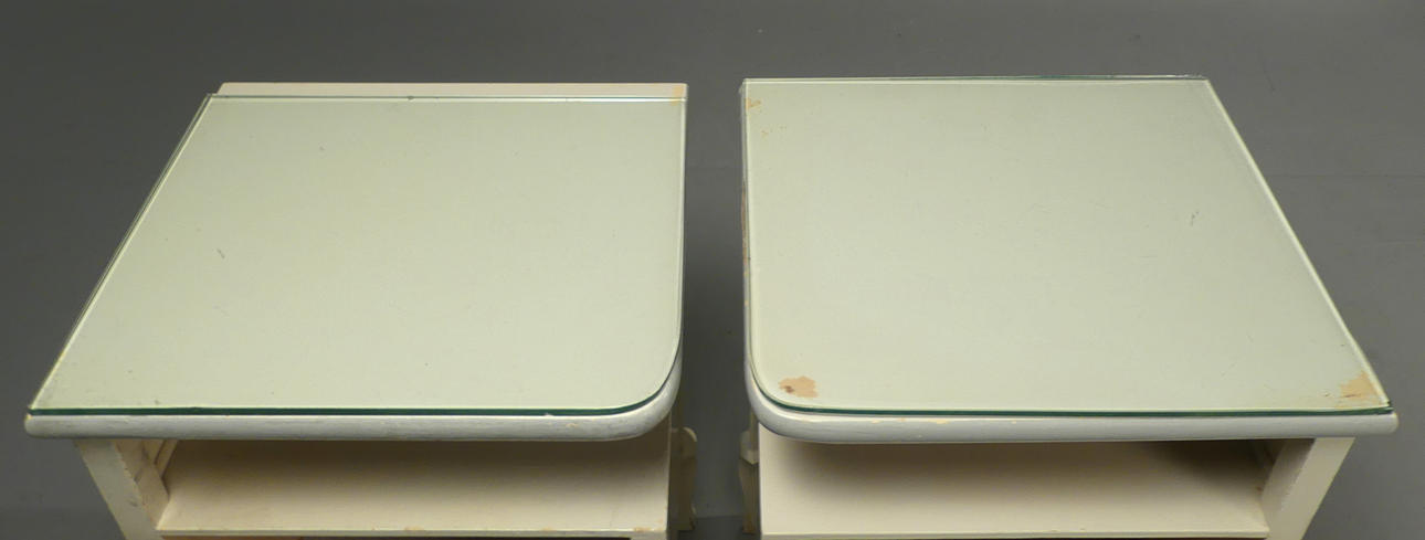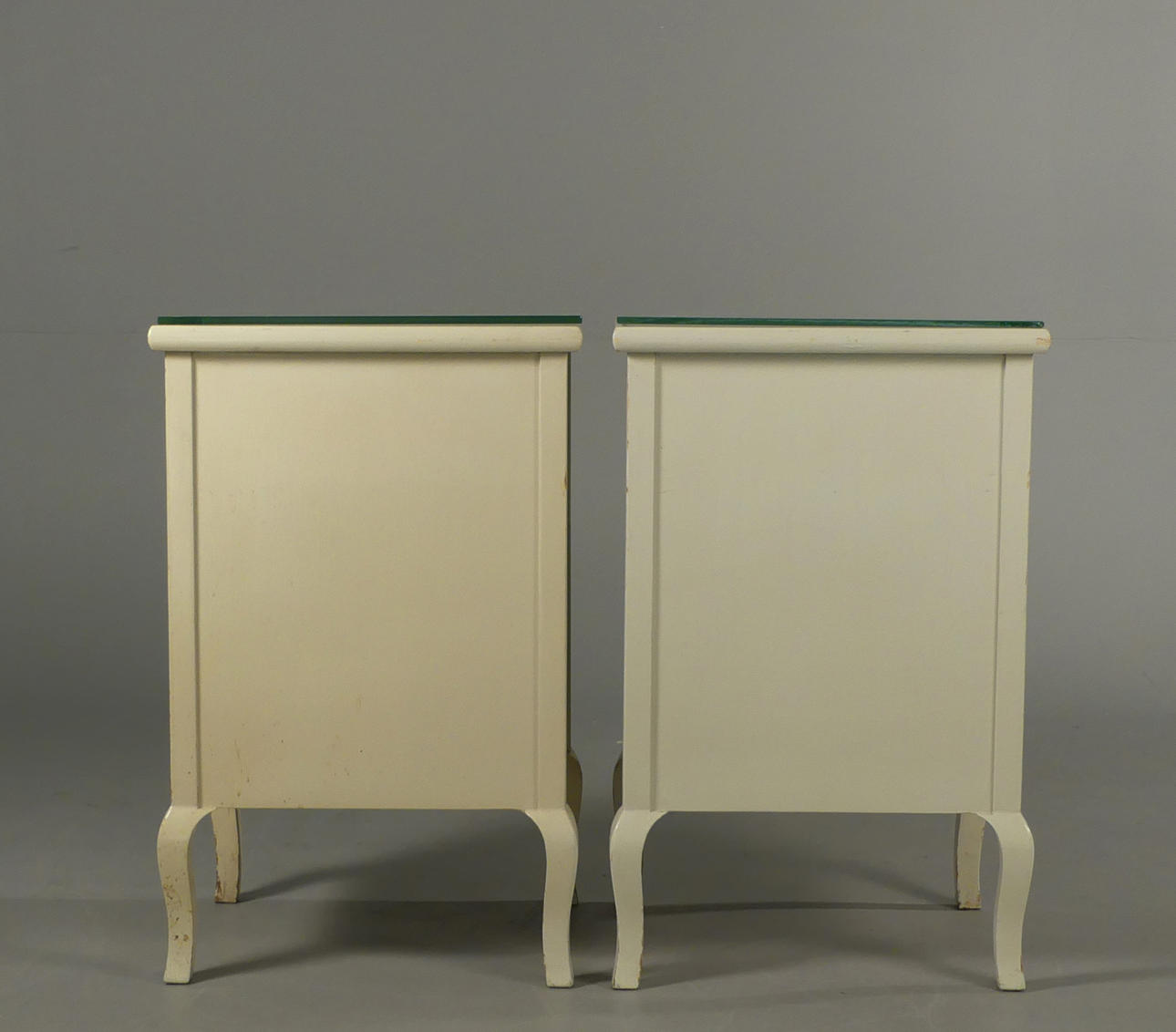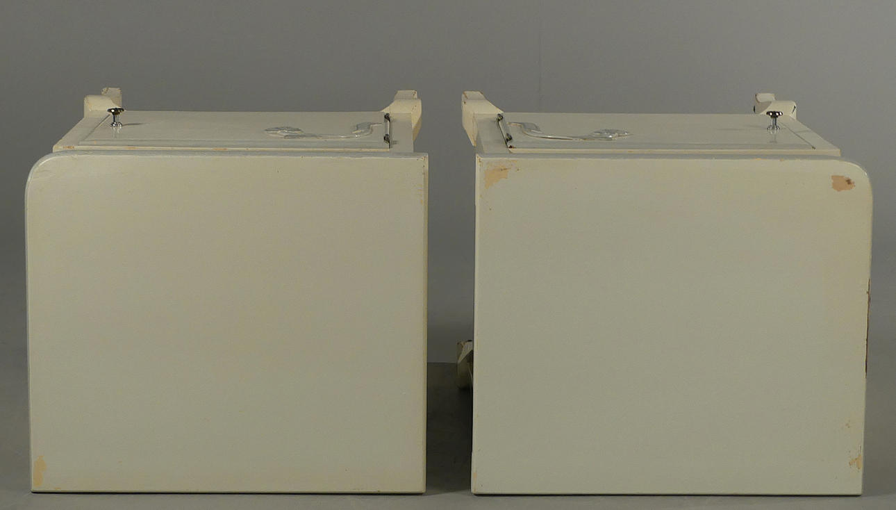 Vitmålade med blåmålad dekor. Lösa glasskivor på topp. Höjd 60 cm, bredd 38 cm, djup 33,5 cm.