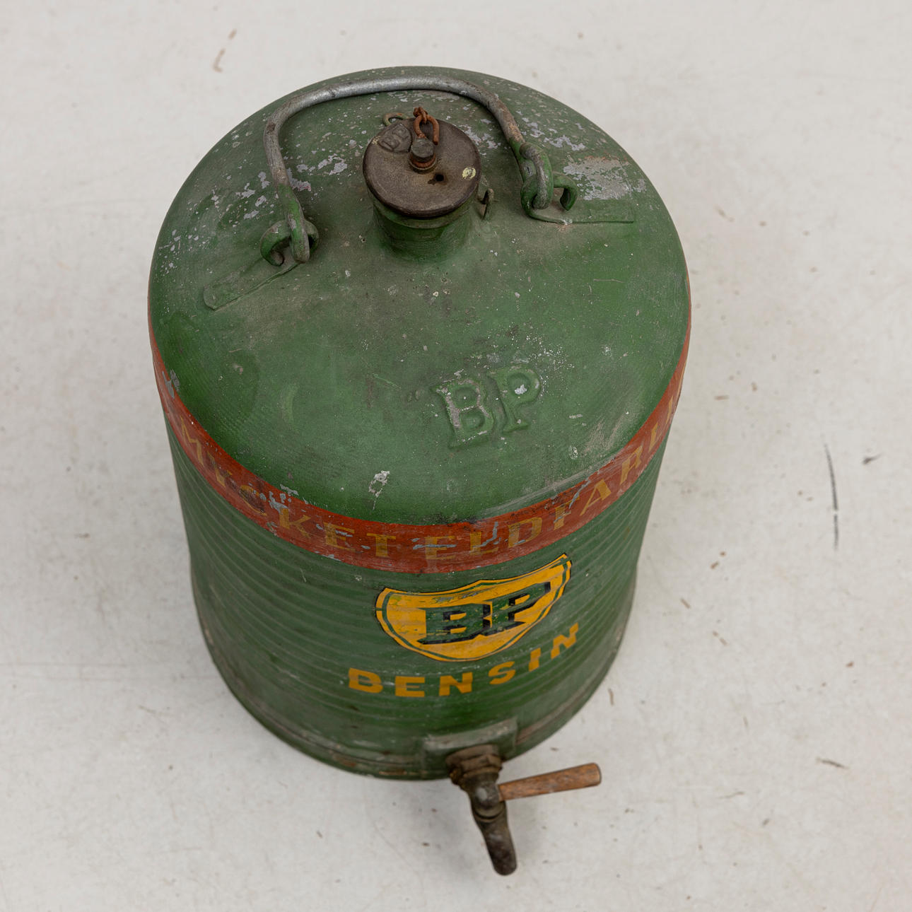 BENSINDUNK, lackerad plåt, BP, 1900-talets mitt.
