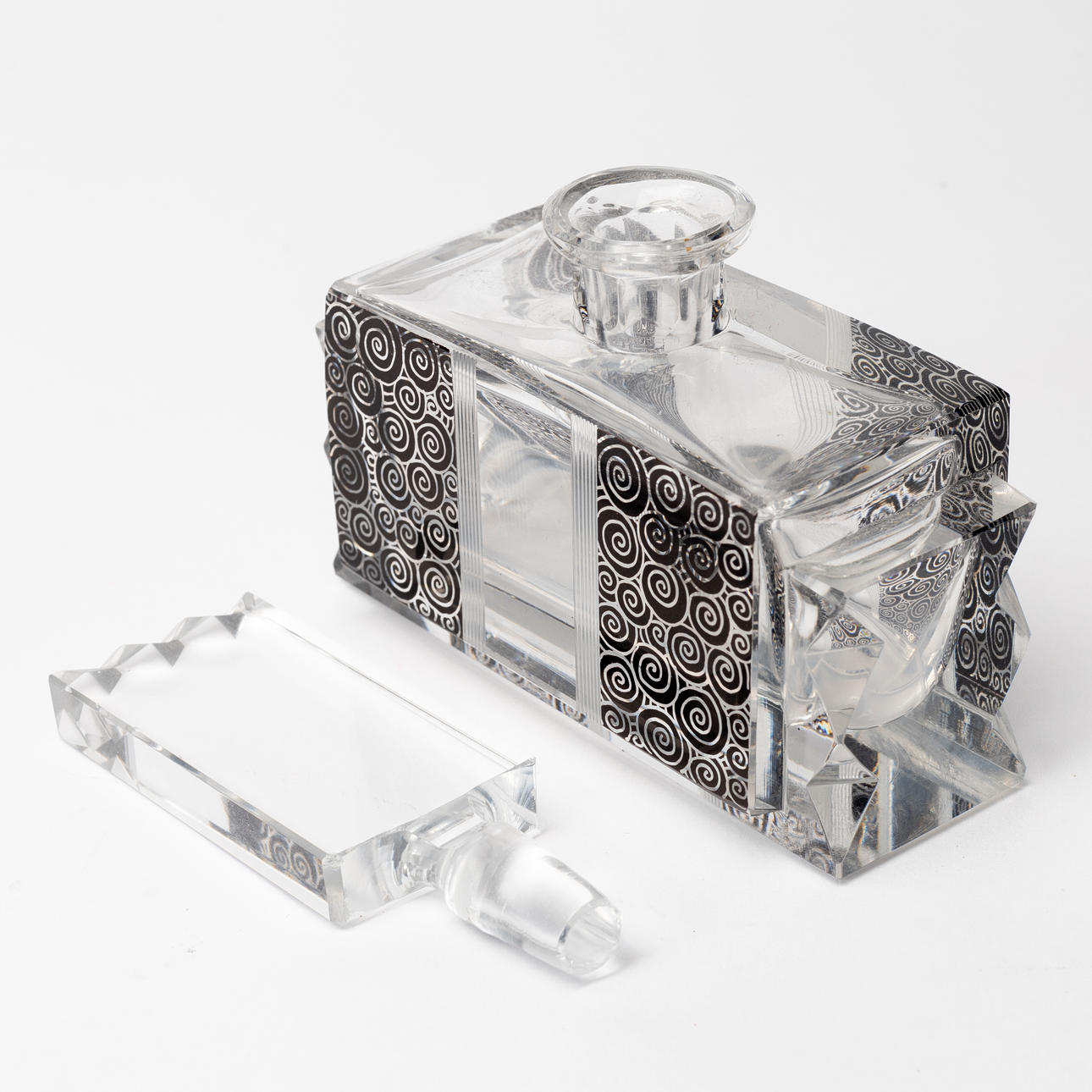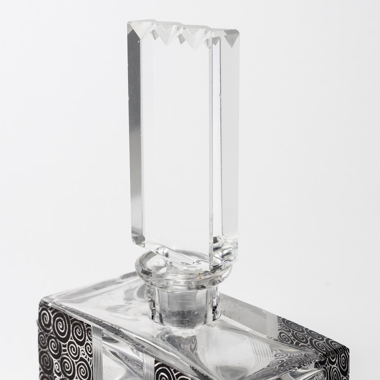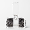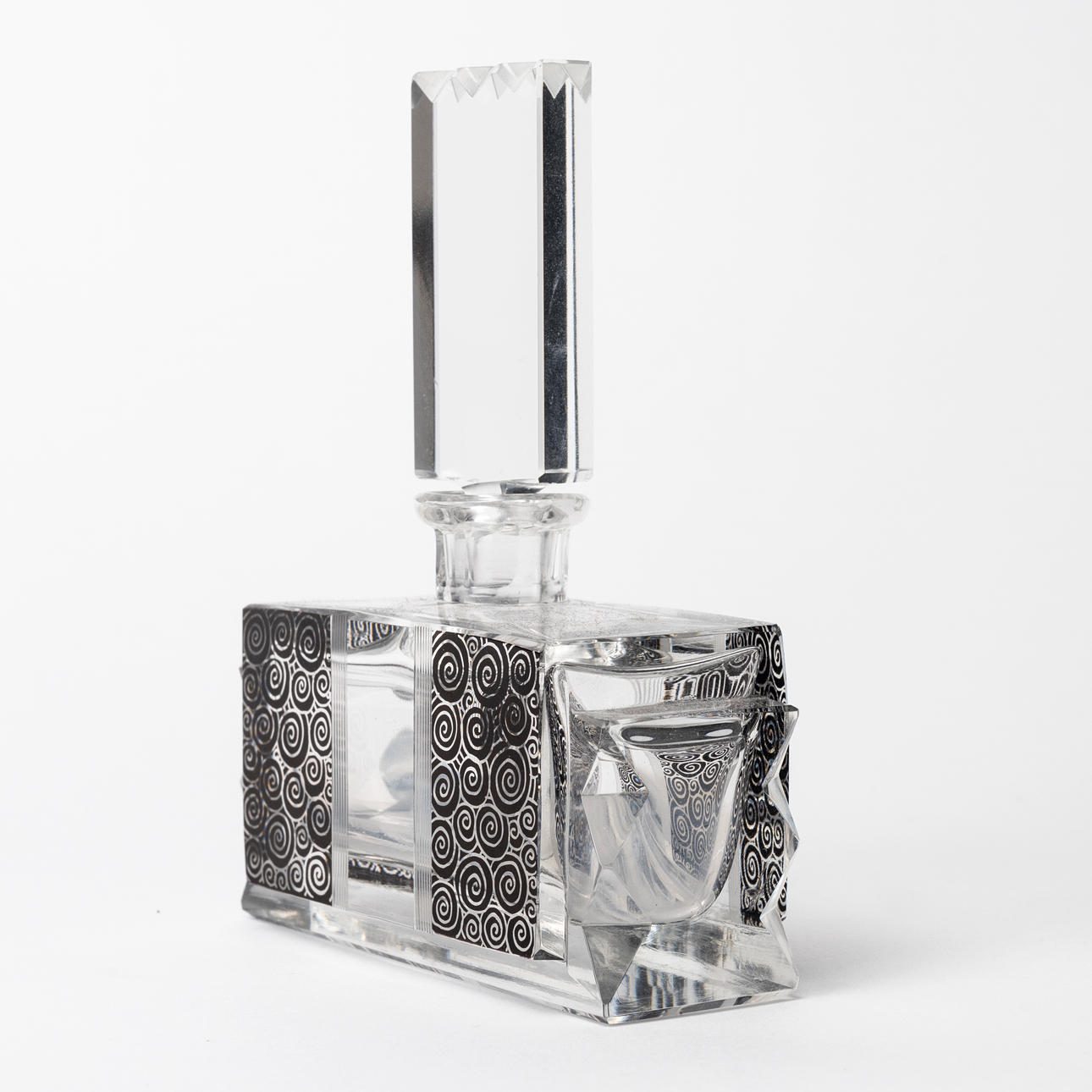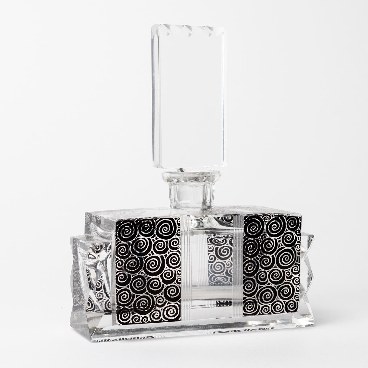 Rektangulär form med svart cirkelformat mönster, längd ca 11 och höjd 14 cm.