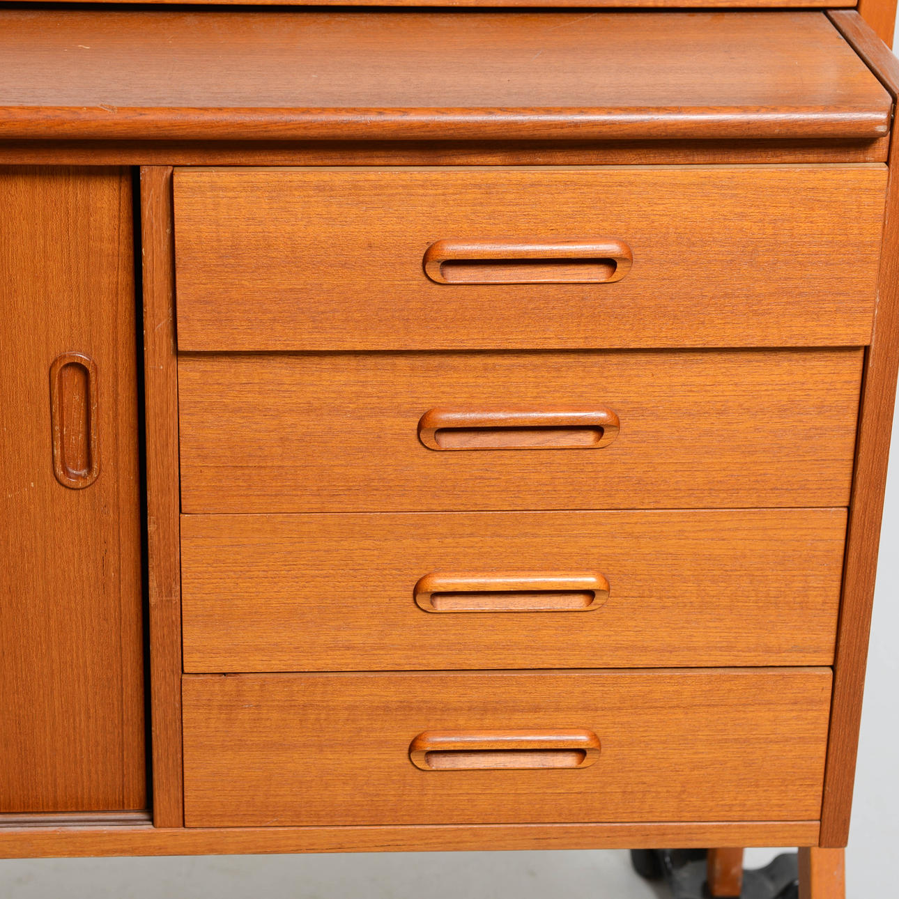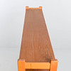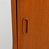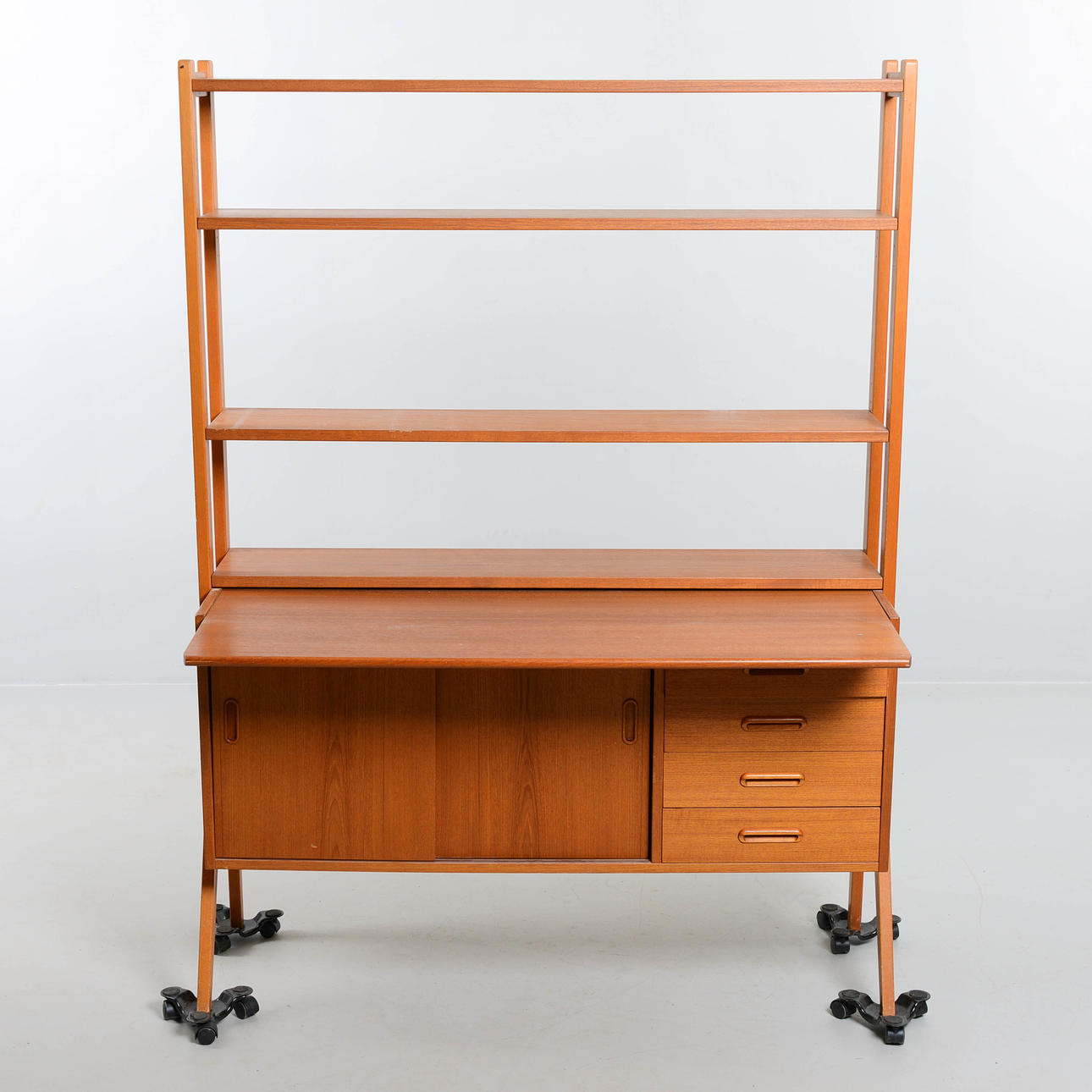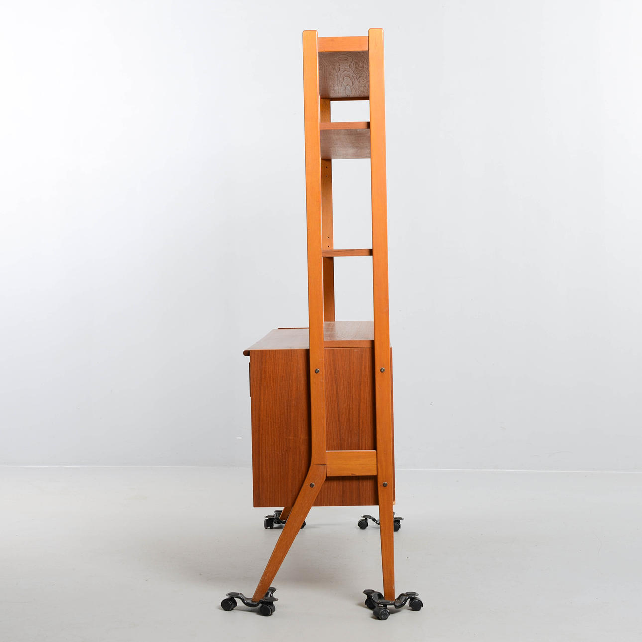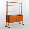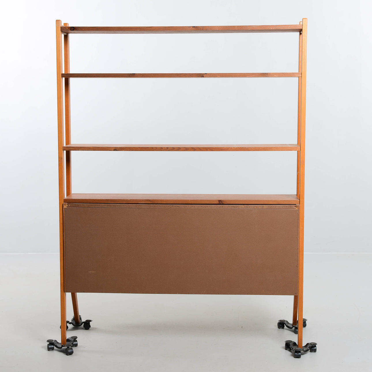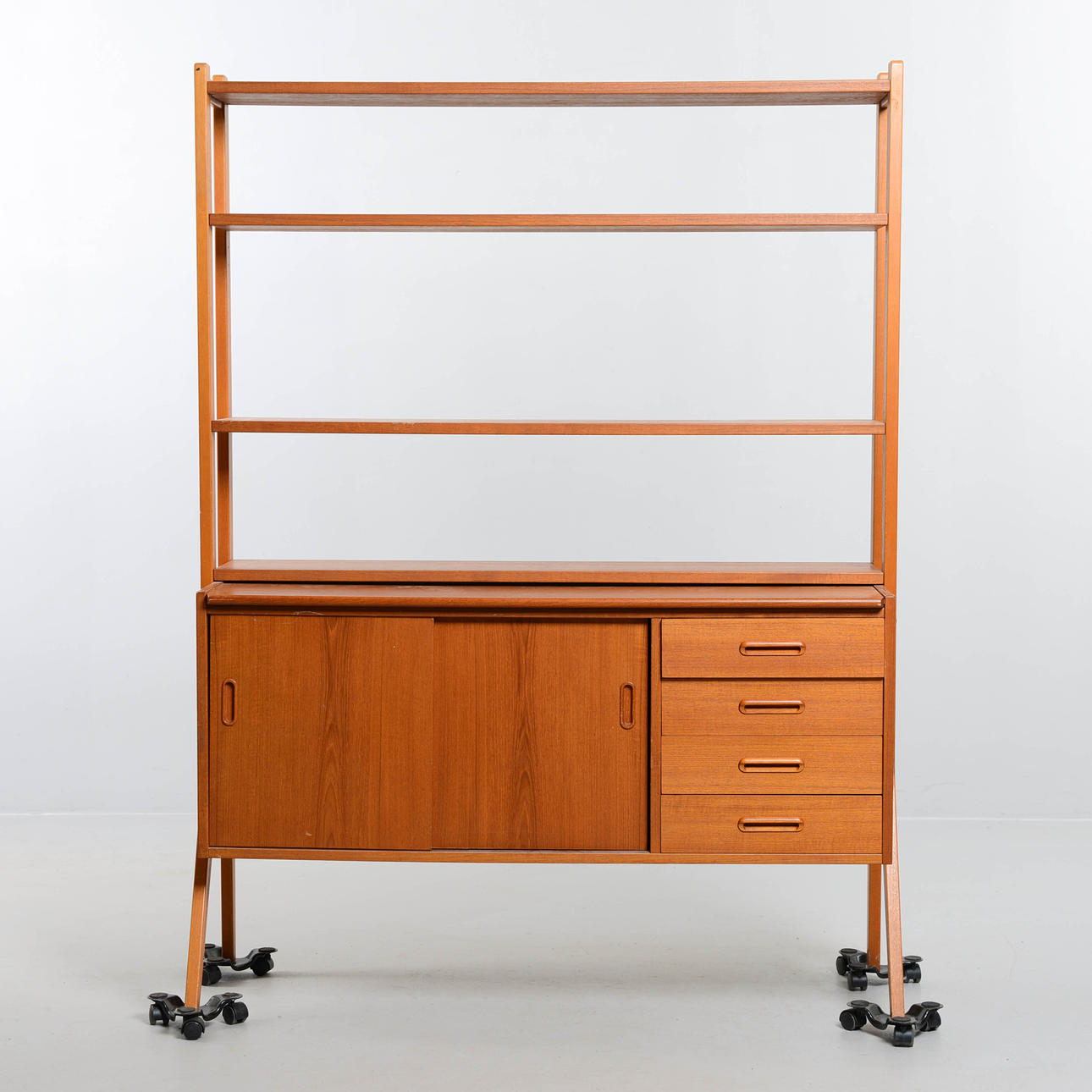 Överdel med hyllplan, nederdel med lådor och skjutdörrar. Bredd 120 cm. Djup 43 cm. Höjd 160 cm.