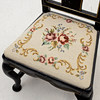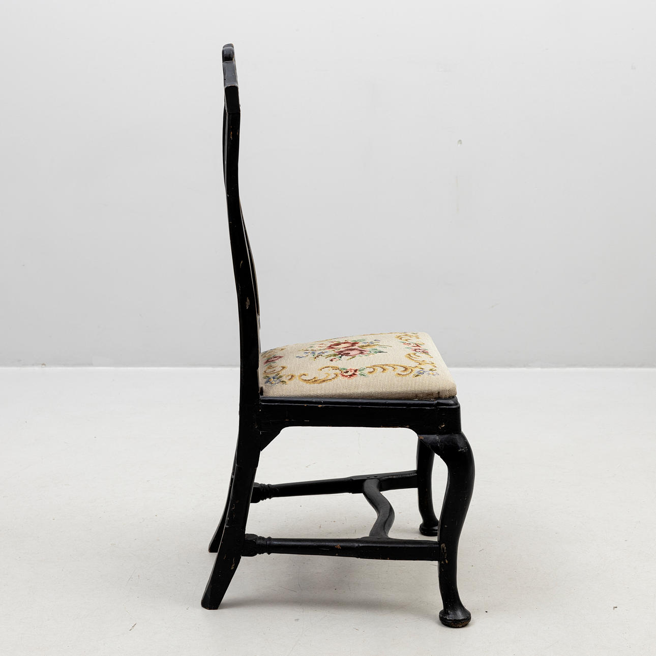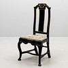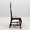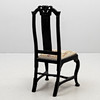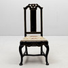Genombruten rygg, svängda ben med kopplingar. Stoppad och klädd löstagbar sits.