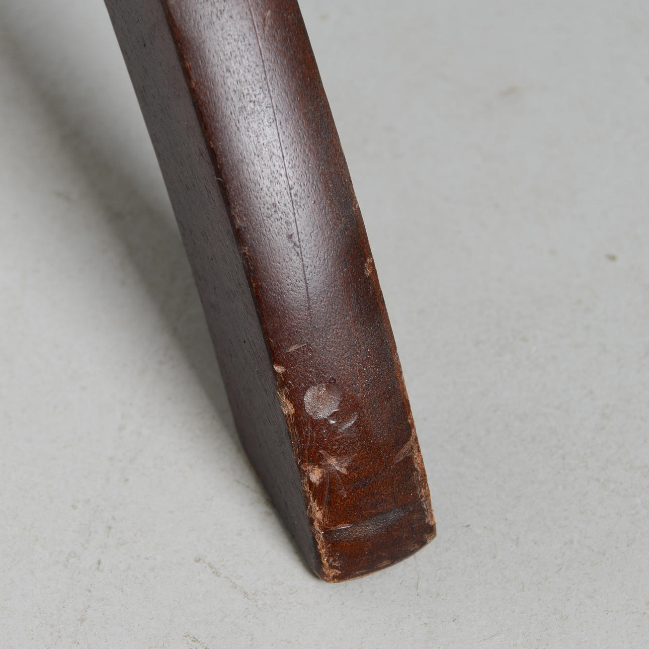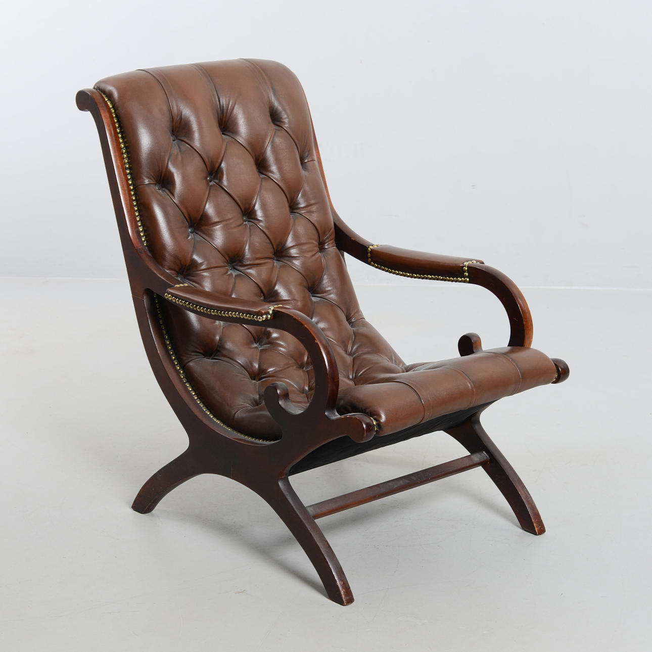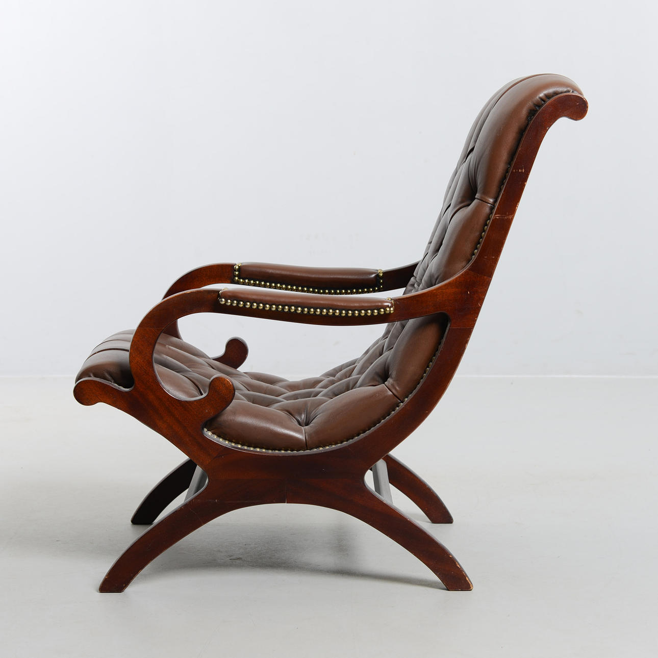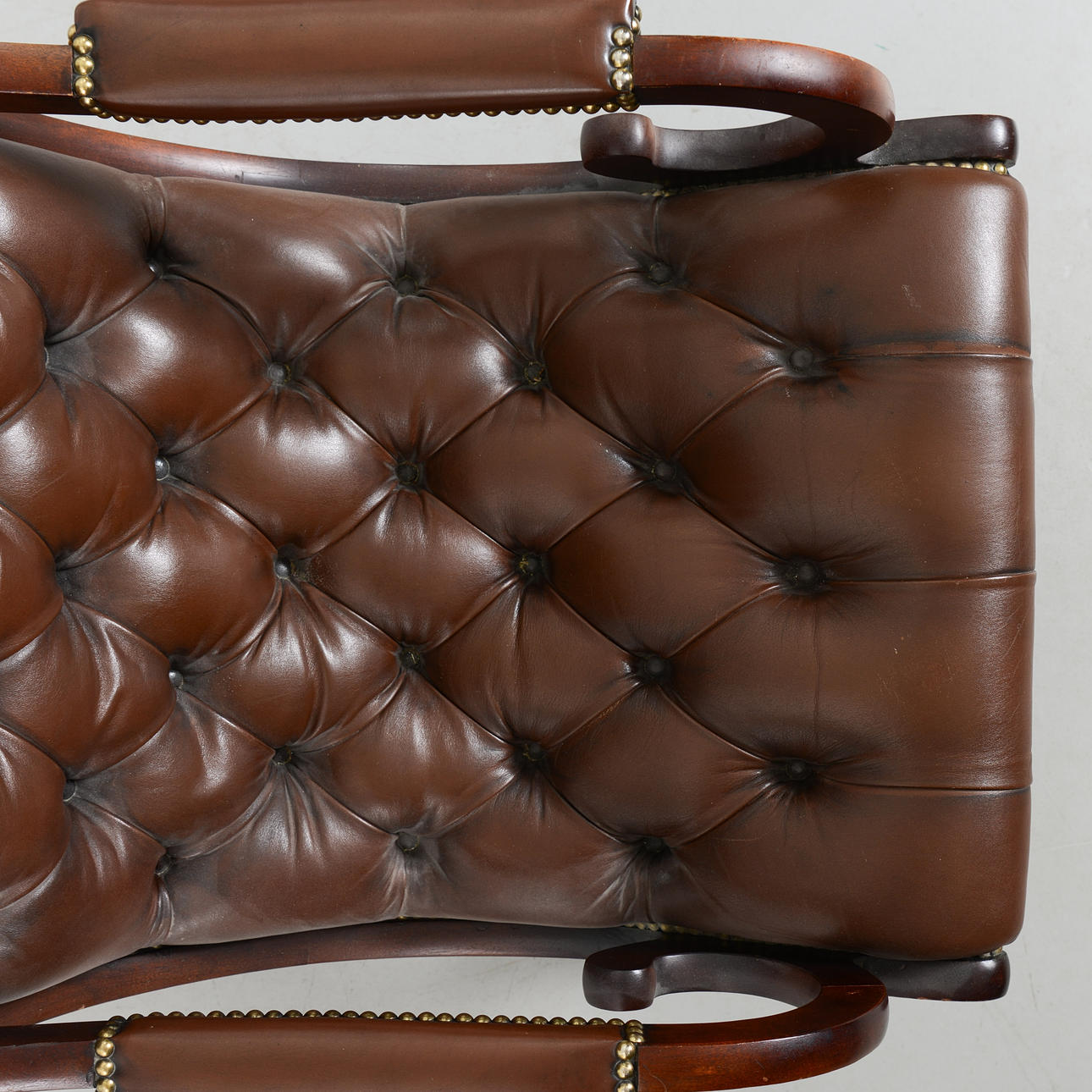 Skinn & mahogny. Sitthöjd: 40 cm. Rygghöjd: 86 cm.