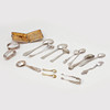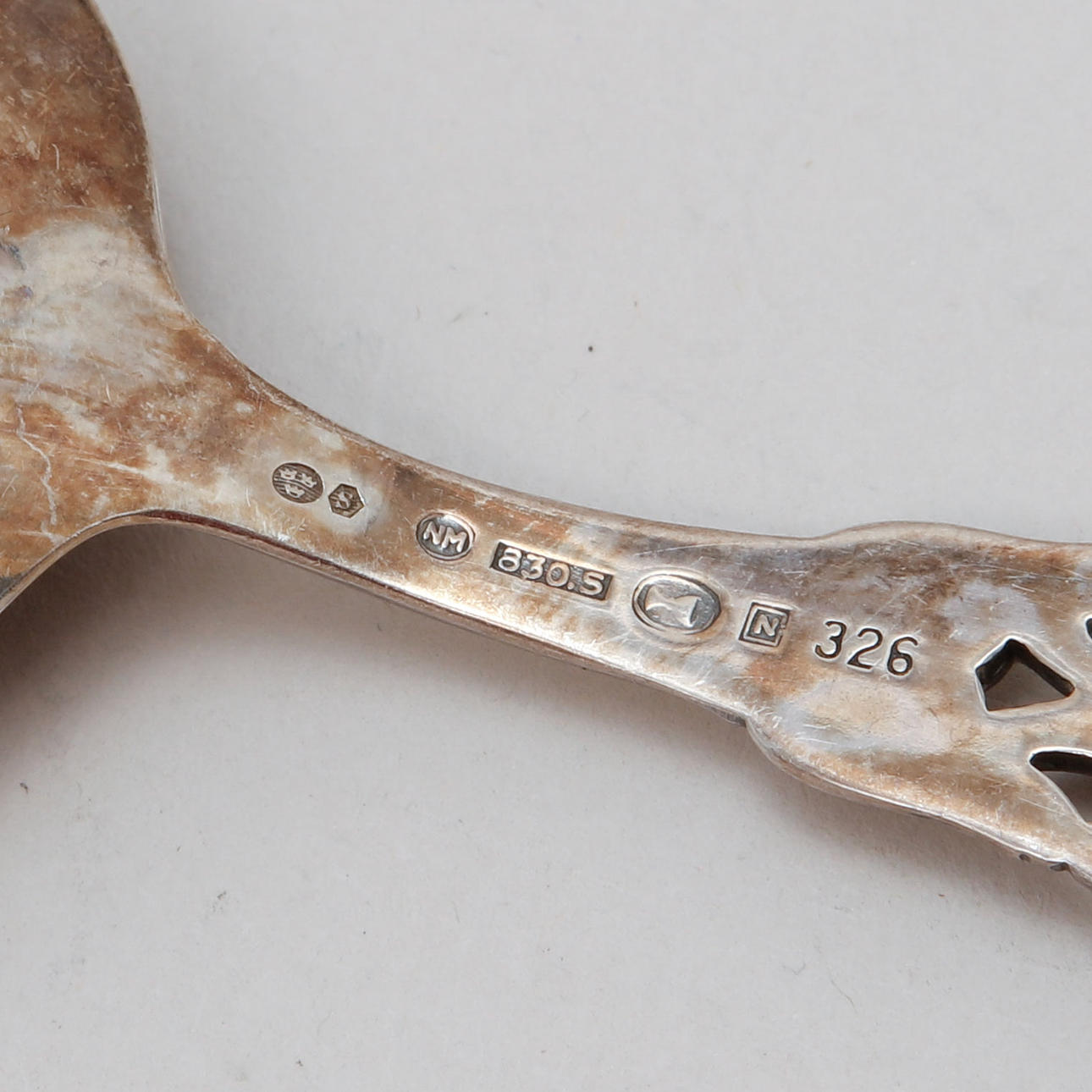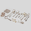 Tång, servettringar, etui, skedar, sil samt dessertgaffel. Längd 5 - 16 cm.