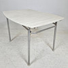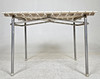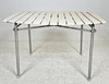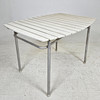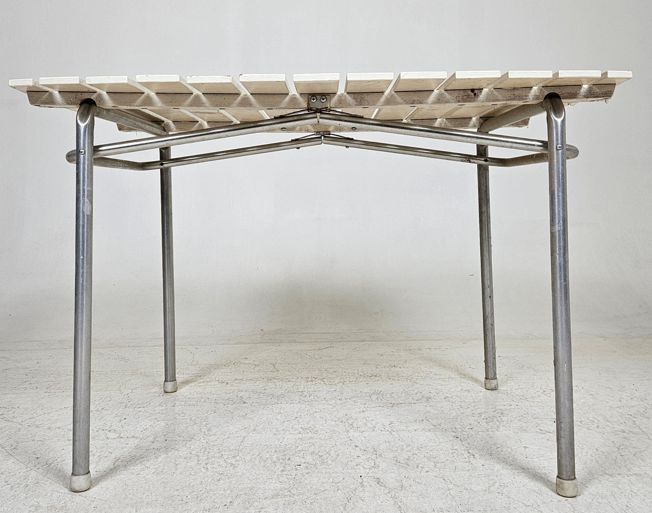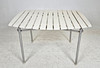 Skiva med träribbor, metallben, fällbart. Längd ca. 98, bredd 72, höjd 64 cm.