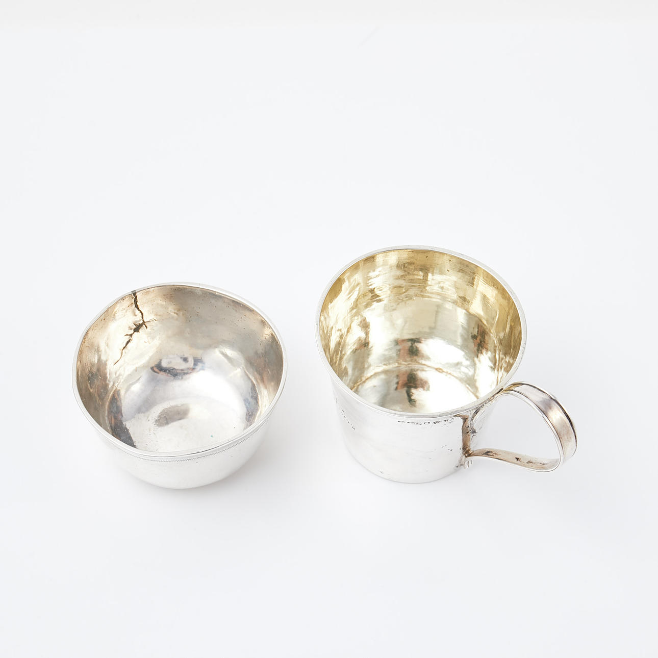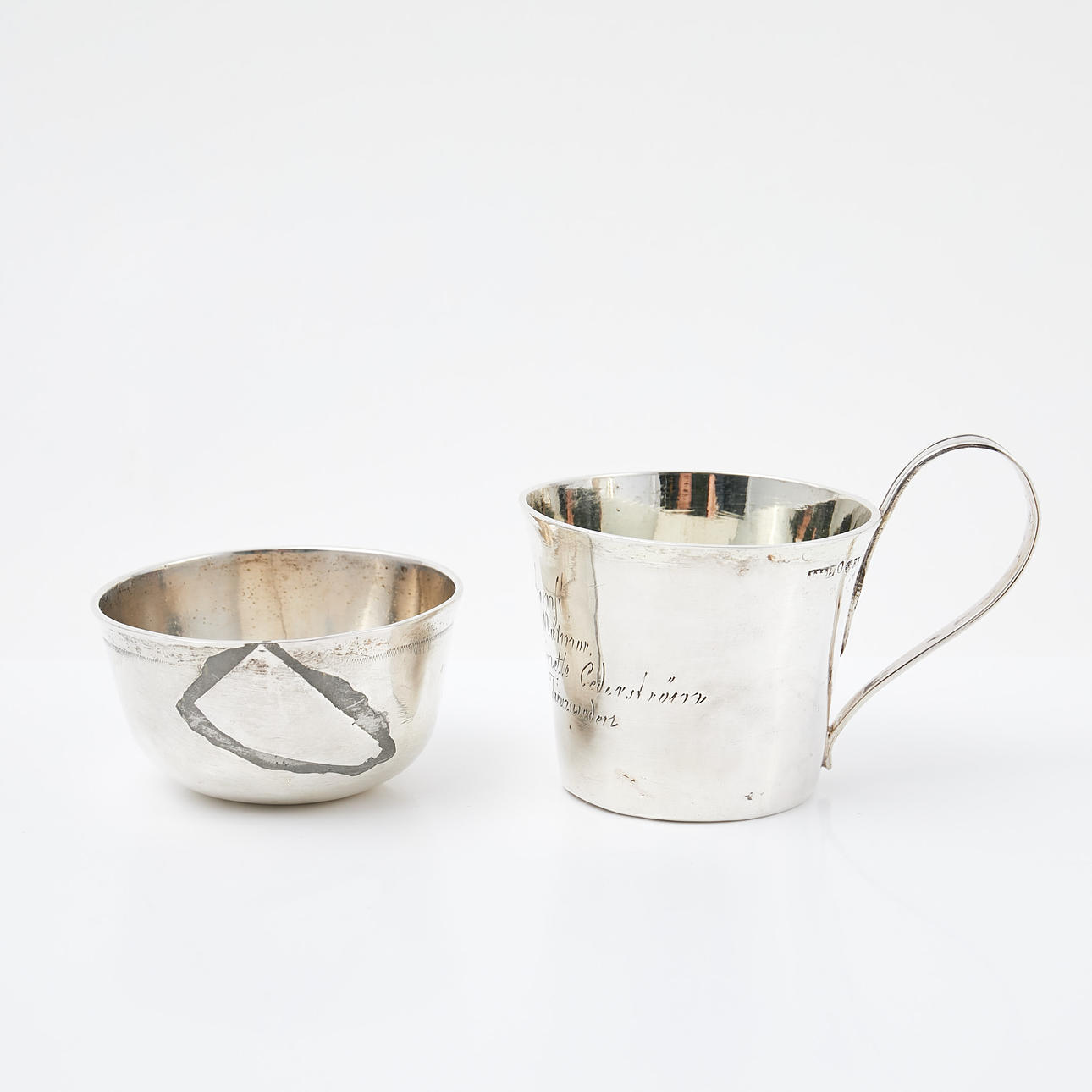 Bruks- och ålderrelaterat slitage, bucklor, tumlaren med lagning, supkoppen med gravyr.